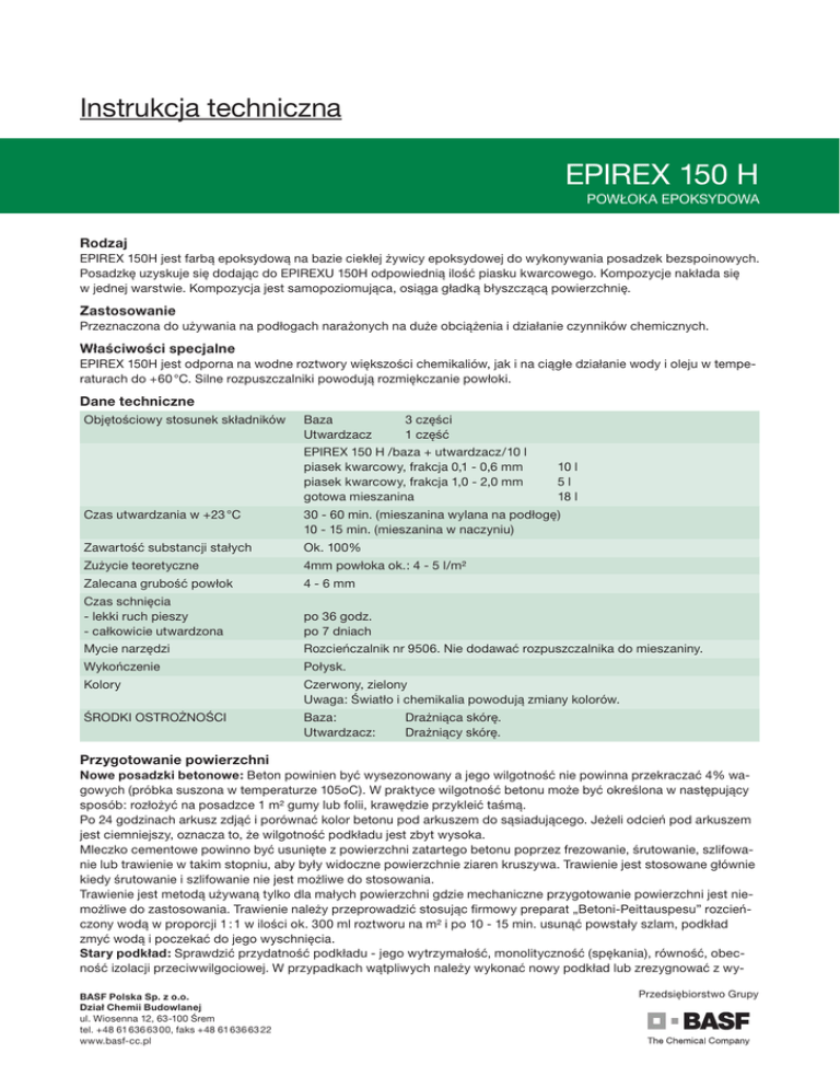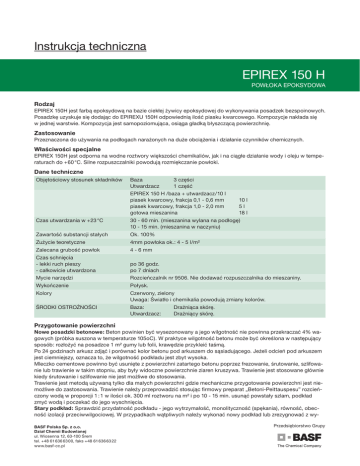 Instrukcja techniczna EPIREX 150 H POWŁOKA EPOKSYDOWA Rodzaj EPIREX 150H jest farbą epoksydową na bazie ciekłej żywicy epoksydowej do wykonywania posadzek bezspoinowych. Posadzkę uzyskuje się dodając do EPIREXU 150H odpowiednią ilość piasku kwarcowego. Kompozycje nakłada się w jednej warstwie. Kompozycja jest samopoziomująca, osiąga gładką błyszczącą powierzchnię. Zastosowanie Przeznaczona do używania na podłogach narażonych na duże obciążenia i działanie czynników chemicznych. Właściwości specjalne EPIREX 150H jest odporna na wodne roztwory większości chemikaliów, jak i na ciągłe działanie wody i oleju w temperaturach do +60 °C. Silne rozpuszczalniki powodują rozmiękczanie powłoki. Dane techniczne Objętościowy stosunek składników Baza Utwardzacz 3 części 1 część EPIREX 150 H /baza + utwardzacz/ 10 l piasek kwarcowy, frakcja 0,1 - 0,6 mm piasek kwarcowy, frakcja 1,0 - 2,0 mm gotowa mieszanina 10 l 5l 18 l Czas utwardzania w +23 °C 30 - 60 min. (mieszanina wylana na podłogę) 10 - 15 min. (mieszanina w naczyniu) Zawartość substancji stałych Ok. 100% Zużycie teoretyczne 4mm powłoka ok.: 4 - 5 l/m² Zalecana grubość powłok 4 - 6 mm Czas schnięcia - lekki ruch pieszy - całkowicie utwardzona po 36 godz. po 7 dniach Mycie narzędzi Rozcieńczalnik nr 9506. Nie dodawać rozpuszczalnika do mieszaniny. Wykończenie Połysk. Kolory Czerwony, zielony Uwaga: Światło i chemikalia powodują zmiany kolorów. ŚRODKI OSTROŻNOŚCI Baza: Utwardzacz: Drażniąca skórę. Drażniący skórę. Przygotowanie powierzchni Nowe posadzki betonowe: Beton powinien być wysezonowany a jego wilgotność nie powinna przekraczać 4% wagowych (próbka suszona w temperaturze 105oC). W praktyce wilgotność betonu może być określona w następujący sposób: rozłożyć na posadzce 1 m² gumy lub folii, krawędzie przykleić taśmą. Po 24 godzinach arkusz zdjąć i porównać kolor betonu pod arkuszem do sąsiadującego. Jeżeli odcień pod arkuszem jest ciemniejszy, oznacza to, że wilgotność podkładu jest zbyt wysoka. Mleczko cementowe powinno być usunięte z powierzchni zatartego betonu poprzez frezowanie, śrutowanie, szlifowanie lub trawienie w takim stopniu, aby były widoczne powierzchnie ziaren kruszywa. Trawienie jest stosowane głównie kiedy śrutowanie i szlifowanie nie jest możliwe do stosowania. Trawienie jest metodą używaną tylko dla małych powierzchni gdzie mechaniczne przygotowanie powierzchni jest niemożliwe do zastosowania. Trawienie należy przeprowadzić stosując firmowy preparat „Betoni-Peittauspesu” rozcieńczony wodą w proporcji 1 : 1 w ilości ok. 300 ml roztworu na m² i po 10 - 15 min. usunąć powstały szlam, podkład zmyć wodą i poczekać do jego wyschnięcia. Stary podkład: Sprawdzić przydatność podkładu - jego wytrzymałość, monolityczność (spękania), równość, obecność izolacji przeciwwilgociowej. W przypadkach wątpliwych należy wykonać nowy podkład lub zrezygnować z wyBASF Polska Sp. z o.o. Dział Chemii Budowlanej ul. Wiosenna 12, 63-100 Śrem tel. +48 61 636 63 00, faks +48 61 636 63 22 www.basf-cc.pl Przedsiębiorstwo Grupy EPIREX 150 H konywania posadzki epoksydowej. Jeżeli istniejący podkład kwalifikuje się do wykonywania prac, należy całkowicie usunąć z powierzchni wszelkie powłoki malarskie, zatłuszczenia, warstwę zaczynu cementowego i fragmenty luźne lub słabe. Najskuteczniejsza jest metoda frezowania, gdyż usuwana jest stosunkowo gruba warstwa, ale uzyskana powierzchnia jest chropowata i nie można na niej układać posadzek nakładanych techniką malarską, jako zbyt cienkich. Warunki przygotowania Powierzchnia betonu powinna być sucha. Temperatura podkładu, otaczającego powietrza i samych materiałów powinna wynosić +15 °C. Wilgotność względna powietrza w czasie prowadzenia prac i przez tydzień po ich zakończeniu nie może być wyższa niż 80%. Nakładanie Gruntowanie Wszelkie prace dodatkowe muszą być wykonane przed gruntowaniem. Gruntować lakierem epoksydowym Epirex 310 rozcieńczonym ok. 30 - 50 % rozcieńczalnika 9506 lub 9515. Gruntowanie należy przeprowadzić tak aby cała powierzchnia pozostała szczelnie pokryta lakierem. Porowaty, stary, niemalowany uprzednio beton powinien być zawsze gruntowany lakierem epoksydowym. Po gruntowaniu powierzchnia betonu musi być gładka i wolna od porów w przeciwnym razie w trakcie nakładania warstwy farby mogą tworzyć się pęcherze powietrza, które będą powodować powstawanie kraterów na powierzchni farby. Szpachlowanie Stosować należy Epirex 300, bez rozcieńczalnika, jako spoiwo a jako wypełniacz suszoną ogniowo mączkę kwarcową lub piasek kwarcowy, zależnie od grubości wypełnianych ubytków. Nakładanie: Epirex 500 może być nakładany po wyschnięciu gruntu nie wcześniej jednak niż po 6 godzinach. Powinno unikać się przerwy większej niż 24 godziny jeśli to jednak nastąpi powierzchnię gruntu należy zmatowić i oczyścić przed malowaniem Mieszanie składników Utwardzacz należy przelać do oddzielnego naczynia, a następnie dodać bazę i bardzo dokładnie wymieszać przy pomocy elektrycznej wiertarki wolnoobrotowej z mieszadłem (ok. 350 obr./ min). Należy wymieszać tylko taką ilość żywicy, która będzie zużyta przed końcem czasu zużycia. Gotową mieszaninę wylać natychmiast na obszar przeznaczony do pokrycia skalkulowany zgodnie z wydajnością teoretyczną. Mieszanina w naczyniu rozgrzewa się i nie nadaje się do użytku już po ok. 10 - 15 minutach. Nieprawidłowe proporcje składników lub niedokładne wymieszanie mogą powodować złe utwardzenie powłoki lub pogorszenie właściwości posadzki. Nakładać packą zębatą o wielkości zębów 0,5 mm w celu osiągnięcia odpowiedniej grubości powłoki. Wyrównać powłokę wałkiem kolczastym. Do chodzenia po świeżej posadzce używać butów na kolcach. Cały sprzęt wyczyścić natychmiast używaj