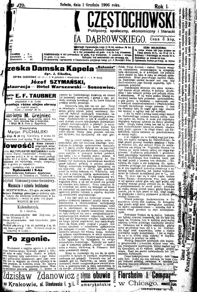 Sobota, dnia 1 Grudnia 1966 roku. Ti Polityczny, społeczny, ekonomiczny i IHäracKi Cena 3 ice titóstrtejl: Gsąstochowa Aleja I I H 88, telefoao H 60, 4Bes telegraficzny etiteieanik-Częstoehowa*. ro w dai powaaednie i>d godz. 5-ej 4o 7-ej wieczorna, n AdMfirTstrsejaw dii! powszednie do góde. 6-ej wieczorem, w niedziele i święta H do godz. 11-¾ rano. Rękopisy beł zastrzeżenia nie zwracąją eśę. q Preauraeratę i ogłoszenie w Częstochowie przyjmuje księg. p.f. J. Nowinki i $£ka. B Półroeetie 8 .— Kwartaliie Miesięcznie 1.60 60 _ e s k a D a m sk a K ap ela J ■ .B o h e m ia ” d y r . J . C ib u lk a , GRYWA C6DZIENNIE od 12 — 3 w południe i w ieczorem od 7 — 1 w nocy J ó z e f S Z Y M A Ń S K I, ilauracja —Hotel Warszawski —Sosnowiec. pIlarz 8ta .E_ . F . T Ä U B N E R przyjechał z m . Łodzi hrze d aje ro ż n e o le jn e o b r a z y po nizkich cenach, Hotel „V ictoria“ >6 12. — 2-1 -öäjsk M. G re jn ie c p lo m b o w a n ie , w y jm o w s K ie z ę b ó w bólu. Z ęby s z tu c z n e b e r p r d o ie b ie m a . b ez I Aleja J6 8, d o m p. Rygockiej. Z D e n t^ -a ta Marjan PUCHALSKI hi Aleja M 26 róg T e strp ln rj, w d e m u Dr. jlfasserth ala (nad A pteką W -go Długosza). śm ierci ks. Stabiew skiego d opatrują się niem al już k a ta stro fy n ared o w ej, i gorsze z tego po w odu staw iają horoskopy co do losów lu d n o śei polskiej zaboru pruskiego. K atastro fą ta k ą fa k t ten nie jest. Żleby te św iadczyło o tam tejszem -społeczeństwie p o l akiem , gdyby u ż y te k je d n e j osobistości, cho ciaż tak w ybitne zajm ującej stanow isko, z a ch w iać m iał jeg o bytem lub pozbaw ić je rów no w agi. Społeczeństw o to tyle w ostatłiich c z a sach doznało ciosów, tyle przebyło dośw iadczeń i przejść niebezpiecznych, a przebyło je szc z ę śliw ie i zw ycięsko, że i to now e zniesie bez w iększego w strząśnienia, baz znaczniejszej d la siebie szkody. S trata, ja k ą poniosło obecnie, je s t d o 'kliw a, lecz b ynajm niej n ie zbyt g ro - Aby ją ocenić należycie, trzeba sobie uprzytom nić, ja k i był sto su n e k ' zm arłego a rc y biskupa do polskiego społeczeństw a ta m te jsz e kań, je śli obsadsić go i w jak iej m ierze w płynął on n a jego losy? O.óż m ylnem je s t m niem anie, ro z p o w sz e c h piecu M ULTYPLIKA TO R OGRZEWANIA.» m ed a nione niely lk o w p e w n y ch k o ła c h polskich, le złote. L a te n t liasselsed er i N iem eczek. Ogrzewa pokuj w 30 m. de sam ej podłogi, lecz także, i to w w iększej n a w e t m ierze, w czędza do b % opału. Piece żelazae m ulty- p e w n y c h kołach niem ieck ich , jakoby k s. Stablew ski był duchow ym k ierow nikiem w szelkich tatorowe nie w ydzielają sw ędu, u trzy m u ją sp ra w ludności polskiej w zaborze p ruskim . pło 8 godzin po n ap alen iu , Takiego stan o w isk a kierującego b y n ajm n iej on iiecąją i po siad ają stale n a składzie nie zajm ow ał. Już >v chw ili, g dy pow ołany R y d ze w sk i i S - k a został n a stolicę biskupią ś.v. W ojciecha, m ię Biuro techniczne Komisowo - A jenturow e dzy nim a z n aczn ą częścią społeczeństw a sil Częstochowie, ul. T eatraln a 13. T elefon że 1. ny panow ał rozdźw ięk. On reprezentow ał w ó w czas k ieru n ek urzędow y w polityce polskiej astytut G im uastyczno-lecziiiczy. w zględem P ru s, a n a ten k ieru n ek nie godziły się szerokie kołu ludności. Przez n a stę p n e la ta rozdżw ięk ten n aw et się w zm agał, a ż w resz cie z ak o ń c z y ł się z u p tłn e m z w y cięstw em a n tiugodowej polityki ludowej, a zupełną k a p itu la kzniowie Polskiego gimnazjum po zniżonej opłacją s tro n n ic tw a arcybiskupiego. L ekcje d la młodzieży rzem ieślniczej w kaI te n fa k t atoli nie w ytw orzył je sz c z e w dą niedzielo i św ięta od godz. 2-ej popoł. polityce ściślejszej h a rm o n ii m iędzy calem s p o W EJŚC IE 20 KOP. łeczeństw em a zw ierzchnikiem a rc b id je ce z ji gnieźnieńsko p o zn ań sk iej. P rzeszk ad zała tem u Kalendarzyk. już ta okoliczność, że społeczeństw o w obec w zm agającego się n ap o m niem czyzny zm uszo D. 1 Grudniu, ne było ch w y tać się c o riz energ ic zn ie jszy c h 'i hiona c h r z e ś c i a ń s k i e : d ziś E lig iu s z a , j u rad y k aln iejs?y ch środków odpornych, a rc y b i tro B ib ia n n y P . M. skup zaś był krępow any nietylko n a k ła d ań e m i Imiona s ło w i a ń s k ie : dziś Sam osław s, ju lro n a n ie g o pęłam i rząd u w em i, lecz także/w zglęSzulislav ,i. darr.i n a Rzym, k tó ry p ra g n ą ł i p ra g a is dziś Wtchód s ł o i c a g. 7 m. 49, zachód g. 3 m. 48. jeszcze u trzy m ać z cesarstw em niem ieckiem M y h is io i y c z n e : 1901. Otw arcie stacji ra ja k najlepsze sto su n k i. Przez la t a ^ a ł e społe tunkow ej w Łodzi.— czeństw o kroczyło też w łasną drogą, k ie ru ją c się jedynie w ypróbow anym w w alce system em odpornym i zd row ym zm ysłem .'zachow aw czym , a nie oglądając się by n ąjpiniej n a sw eg o zw ierzchnika kościelnego. N iekiedy zaś n a w e t — jak w niedaw nej spraw ie ^Straży* — m iędzy W iadomość o nag ły m zgonie ś. p. areybi- n ie m a w ładzą duchow ną ijtr P o z n a n iu dość ostre pow staw ały zatargi. pa Stabiew skiego w yw ołała głośne a hole Mimo to, zaprzeczyć się n ie da, że społe s t echo w całej Polsce. N aw et w kołach, które najm niej były zadowolone z je g o bisku- czeństw o to łączyła ze zraarfym arcybiskupem serdeczna n ić sym patji. P o w s ta ła o n a ju ż w N i politycznej działalności, zgon je g o uw ajest ze w zględu n a o b ecn ą sytuację w za czasach, g d y ks. S ta b lc w sk i/ n a arenie p a rla wrze pruskim , za dotkliw ą stra tę d la spraw y m e n ta rn e j bronił energiczni^ praw sw oich ziom polskiej. Z danie to najzupełniej słuszne. W iel- ków, a podtrzym yw ało j ą dalej zadowoleni