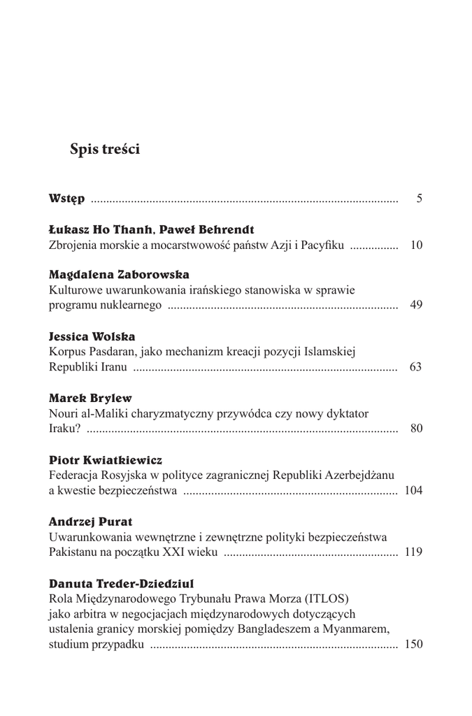 Spis treści Wstęp .................................................................................................... 5 Łukasz Ho Thanh, Paweł Behrendt Zbrojenia morskie a mocarstwowość państw Azji i Pacyfiku ................ 10 Magdalena Zaborowska Kulturowe uwarunkowania irańskiego stanowiska w sprawie programu nuklearnego ........................................................................... 49 Jessica Wolska Korpus Pasdaran, jako mechanizm kreacji pozycji Islamskiej Republiki Iranu ...................................................................................... 63 Marek Brylew Nouri al-Maliki charyzmatyczny przywódca czy nowy dyktator Iraku? ..................................................................................................... 80 Piotr Kwiatkiewicz Federacja Rosyjska w polityce zagranicznej Republiki Azerbejdżanu a kwestie bezpieczeństwa ..................................................................... 104 Andrzej Purat Uwarunkowania wewnętrzne i zewnętrzne polityki bezpieczeństwa Pakistanu na początku XXI wieku ......................................................... 119 Danuta Treder-Dziedziul Rola Międzynarodowego Trybunału Prawa Morza (ITLOS) jako arbitra w negocjacjach międzynarodowych dotyczących ustalenia granicy morskiej pomiędzy Bangladeszem a Myanmarem, studium przypadku ................................................................................. 150 4 Spis treści Łukasz Stach Problem piractwa morskiego w Azji Południowo-Wschodniej na początku XXI wieku .......................................................................... 160 Adam Paweł Olechowski Uzbrojona policja ludowa w systemie bezpieczeństwa ChRL ............... 182 Krzysztof Kozłowski Chińska Republika Ludowa i państwa poradzieckiej Azji Centralnej wobec mniejszości ujgurskiej ................................................................ 201 Paweł Luzak Polityka ChRL wobec Kambodży i Laosu w kontekście chińskiej strategii politycznej w regionie Azji Południowo-Wschodniej .............. 218 Stanisław Aleksander Niewiński Stosunki chińsko-japońskie w cieniu sporu o wyspy Senkaku/Diaoyu ... 241 Piotr Ćwiertnia Spór o wyspy Senkaku/Diaoyu w kontekście dalekowschodniej polityki bezpieczeństwa ......................................................................... 248 Karol Kościelniak Czy Wietnam może się czuć zagrożony w XXI wieku? Próba odpowiedzi ................................................................................... 264 Michał Lubina Chińska migracja na rosyjskim Dalekim Wschodzie ............................. 277 Franciszek Czech Incydent w Sabah. Stosunki Republiki Filipin z Malezją w kontekście historii Sułtanatu Sulu ...................................................... 294 Оксана Войтюк Украинско-туркменские отношения в энергетическом секторе ...... 308 Bibliografia ......................................................................................... 327