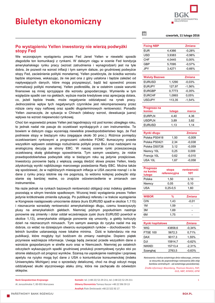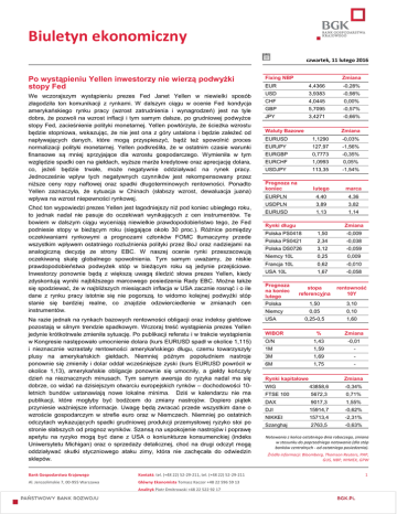 Biuletyn ekonomiczny czwartek, 11 lutego 2016 Po wystąpieniu Yellen inwestorzy nie wierzą podwyżki stopy Fed Fixing NBP EUR 4,4366 -0,28% We wczorajszym wystąpieniu prezes Fed Janet Yellen w niewielki sposób złagodziła ton komunikacji z rynkami. W dalszym ciągu w ocenie Fed kondycja amerykańskiego rynku pracy (wzrost zatrudnienia i wynagrodzeń) jest na tyle dobra, że pozwoli na wzrost inflacji i tym samym dalsze, po grudniowej podwyżce stopy Fed, zacieśnienie polityki monetarnej. Yellen powtórzyła, że ścieżka wzrostu będzie stopniowa, wskazując, że nie jest ona z góry ustalona i będzie zależeć od napływających danych, które mogą przyspieszyć, bądź też spowolnić proces normalizacji polityki monetarnej. Yellen podkreśliła, że w ostatnim czasie warunki finansowe są mniej sprzyjające dla wzrostu gospodarczego. Wymieniła w tym względzie spadki cen na giełdach, wyższe marże kredytowe oraz aprecjację dolara, co, jeżeli będzie trwałe, może negatywnie oddziaływać na rynek pracy. Jednocześnie wpływ tych negatywnych czynników jest rekompensowany przez niższe ceny ropy naftowej oraz spadki długoterminowych rentowności. Ponadto Yellen zaznaczyła, że sytuacja w Chinach (słabszy wzrost, dewaluacja juana) wpływa na wzrost niepewności rynkowej. USD 3,9383 -0,98% CHF 4,0445 0,00% GBP 5,7095 -0,57% JPY 3,4271 -0,66% Zmiana Waluty Bazowe Zmiana EURUSD 1,1290 -0,03% EURJPY 127,97 -1,56% EURGBP 0,7773 -0,35% EURCHF 1,0993 0,05% USDJPY 113,35 -1,54% Prognoza na koniec lutego marca EURPLN 4,40 4,36 Choć ton wypowiedzi prezes Yellen jest łagodniejszy niż pod koniec ubiegłego roku, to jednak nadal nie pasuje do oczekiwań wynikających z cen instrumentów. Te bowiem w dalszym ciągu wyceniają niewielkie prawdopodobieństwo tego, że Fed podniesie stopy w bieżącym roku (sięgające około 30 proc.). Różnice pomiędzy oczekiwaniami rynkowymi a prognozami członków FOMC tłumaczymy przede wszystkim wpływem ostatniego rozluźnienia polityki przez BoJ oraz nadziejami na analogiczną decyzję ze strony EBC. W naszej ocenie rynki przeszacowują oczekiwaną skalę globalnego spowolnienia. Tym samym uważamy, że niskie prawdopodobieństwa podwyżek stóp w bieżącym roku są jedynie przejściowe. Inwestorzy ponownie będą z większą uwagą śledzić słowa prezes Yellen, kiedy zdyskontują wyniki najbliższego marcowego posiedzenia Rady EBC. Można także się spodziewać, że w najbliższych miesiącach inflacja w USA zacznie rosnąć i o ile dane z rynku pracy istotnie się nie pogorszą, to widomo kolejnej podwyżki stóp stanie się bardziej realne, co znajdzie odzwierciedlenie w zmianach cen instrumentów. USDPLN 3,89 3,82 EURUSD 1,13 1,14 Na razie jednak na rynkach bazowych rentowności obligacji oraz indeksy giełdowe pozostają w silnym trendzie spadkowym. Wczoraj treść wystąpienia prezes Yellen jedynie krótkotrwale zmieniła sytuację. Po publikacji referatu i w trakcie wystąpienia w Kongresie następowało umocnienie dolara (kurs EURUSD spadł w okolice 1,115) i nieznacznie wzrastały rentowności amerykańskiego długu, czemu towarzyszyły plusy na amerykańskich giełdach. Niemniej późnym popołudniem nastroje ponownie się zmieniły i dolar oddał wcześniejsze zyski (kurs EURUSD powrócił w okolice 1,13), amerykańskie obligacje ponownie się umocniły, a giełdy kończyły dzień na nieznacznych minusach. Tym samym awersja do ryzyka nadal ma się dobrze, co widać na dzisiejszym otwarciu europejskich rynków – dochodowości 10letnich bundów ustanawiają nowe lokalne minima. Dziś w kalendarzu nie ma publikacji, które mogłyby być bodźcem do zmiany nastrojów. Dopiero piątek przyniesie ważniejsze informacje. Uwagę będą zwracać przede wszystkim dane o wzroście gospodarczym w strefie euro oraz w Niemczech. Niemniej po ostatnich odczytach wykazujących spadki grudniowej produkcji przemysłowej ryzyko stoi po stronie słabszych od prognoz wyników. Szansą na uspokojenie nastrojów i poprawę apetytu na ryzyko mogą być dane z USA o koniunkturze konsumenckiej (indeks Uniwersytetu Michigan) oraz o sprzedaży detalicznej, choć na drugi odczyt mogą oddziaływać skutki styczniowego ataku zimy, która nie zachęcała do odwiedzin sklepów. USA Bank Gospodarstwa Krajowego Kontakt: tel. (+48 22) 52-29-211, tel. (+48 22) 52-29-211 Al. Jerozolimskie 7, 00-955 Warszawa Główny Ekonomista Tomasz Kaczor +48 22 596 59 13 Analityk Piotr Dmitrowski +48 22 522 92 17 Rynki długu Zmiana Polska PS0418 1,50 -0,009 Polska PS0421 2,34 -0,038 Polska DS0726 3,12 -0,059 Niemcy 10L 0,25 0,009 Francja 10L 0,62 -0,010 USA 10L 1,67 -0,058 Prognoza na koniec lutego Polska stopa referencyjna rentowność 10Y 1,50 3,10 0,05 0,10 0,25-0,5 1,60 Niemcy WIBOR % Zmiana O/N 1,43 -0,01 1M 1,59 - 3M 1,69 - 6M 1,75 - Rynki kapitałowe Zmiana WIG 43858,6 -0,34% FTSE 100 5672,3 0,71% DAX 9017,3 1,55% DJI 15914,7 -0,62% NIKKEI 15713,4 -2,31% Szanghaj 2763,5 -0,63% Notowania z końca ostatniego dnia roboczego, zmiana w stosunku do poprzedniego notowania (dla stóp banków centralnych - od ostatniego posiedzenia). Źródła informacji: Bloomberg, Thomson Reuters, PAP, GUS, NBP, NYMEX, GPW 1 Biuletyn ekonomiczny czwartek, 11 lutego 2016 w strefie euro (ryzyko słabszego odczytu). Jednocześnie jednak wycenę krajowej waluty powinny wspierać dane z krajowej gospodarki o dynamice PKB w IV kwartale. Wypowiedzi szefowej Fed bez dużego wpływu na krajowe FX i FI Środa nie przyniosła dużych zmian na krajowym rynku walutowym. Kurs EURPLN oscylował blisko poziomu 4,42. Poprawa apetytu na ryzyko na globalnych rynkach okazał się jedynie przejściowa i tym samym nie dała impulsu do wyraźnego umocnienia złotego. Dziś rano spadki na europejskich giełdach wypchnęły kurs EURPLN do poziomu 4,435. W dalszej części dnia przy skromnym kalendarzu danych makro trudno oczekiwać dużych zmian. Inwestorzy będą zapewne czekać na piątkowy zestaw danych, który