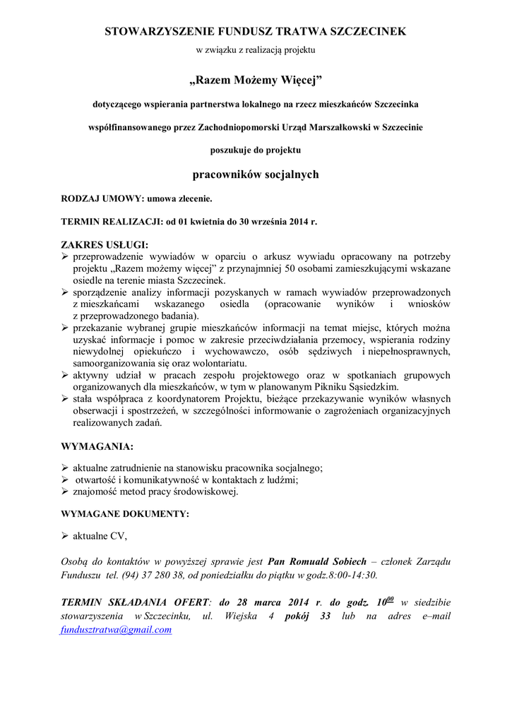 STOWARZYSZENIE FUNDUSZ TRATWA SZCZECINEK w związku z realizacją projektu „Razem Możemy Więcej” dotyczącego wspierania partnerstwa lokalnego na rzecz mieszkańców Szczecinka współfinansowanego przez Zachodniopomorski Urząd Marszałkowski w Szczecinie poszukuje do projektu pracowników socjalnych RODZAJ UMOWY: umowa zlecenie. TERMIN REALIZACJI: od 01 kwietnia do 30 września 2014 r. ZAKRES USŁUGI: przeprowadzenie wywiadów w oparciu o arkusz wywiadu opracowany na potrzeby projektu „Razem możemy więcej” z przynajmniej 50 osobami zamieszkującymi wskazane osiedle na terenie miasta Szczecinek. sporządzenie analizy informacji pozyskanych w ramach wywiadów przeprowadzonych z mieszkańcami wskazanego osiedla (opracowanie wyników i wniosków z przeprowadzonego badania). przekazanie wybranej grupie mieszkańców informacji na temat miejsc, których można uzyskać informacje i pomoc w zakresie przeciwdziałania przemocy, wspierania rodziny niewydolnej opiekuńczo i wychowawczo, osób sędziwych i niepełnosprawnych, samoorganizowania się oraz wolontariatu. aktywny udział w pracach zespołu projektowego oraz w spotkaniach grupowych organizowanych dla mieszkańców, w tym w planowanym Pikniku Sąsiedzkim. stała współpraca z koordynatorem Projektu, bieżące przekazywanie wyników własnych obserwacji i spostrzeżeń, w szczególności informowanie o zagrożeniach organizacyjnych realizowanych zadań. WYMAGANIA: aktualne zatrudnienie na stanowisku pracownika socjalnego; otwartość i komunikatywność w kontaktach z ludźmi; znajomość metod pracy środowiskowej. WYMAGANE DOKUMENTY: aktualne CV, Osobą do kontaktów w powyższej sprawie jest Pan Romuald Sobiech – członek Zarządu Funduszu tel. (94) 37 280 38, od poniedziałku do piątku w godz.8:00-14:30. TERMIN SKŁADANIA OFERT: do 28 marca 2014 r. do godz. 1000 w siedzibie stowarzyszenia w Szczecinku, ul. Wiejska 4 pokój 33 lub na adres e–mail [email protected]