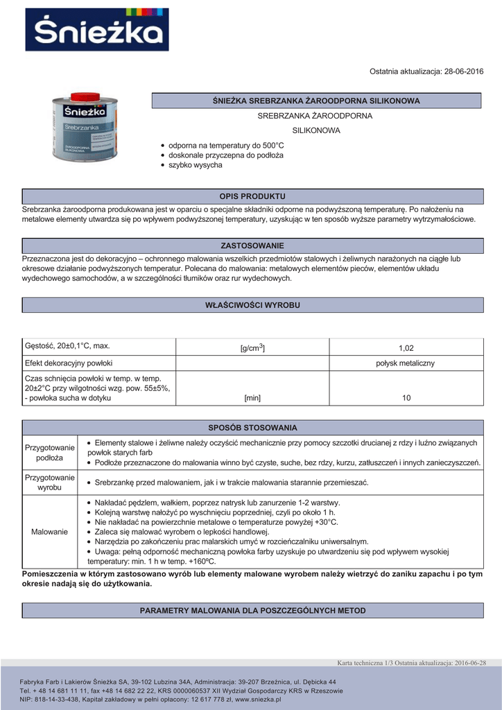 Ostatnia aktualizacja: 28-06-2016 ŚNIEŻKA SREBRZANKA ŻAROODPORNA SILIKONOWA SREBRZANKA ŻAROODPORNA ŚNIEŻKA_SREBRZANKA_ŻAROODPORNA_SILIKONOWA__ SILIKONOWA odporna na temperatury do 500°C doskonale przyczepna do podłoża szybko wysycha OPIS PRODUKTU Srebrzanka żaroodporna produkowana jest w oparciu o specjalne składniki odporne na podwyższoną temperaturę. Po nałożeniu na metalowe elementy utwardza się po wpływem podwyższonej temperatury, uzyskując w ten sposób wyższe parametry wytrzymałościowe. ZASTOSOWANIE Przeznaczona jest do dekoracyjno – ochronnego malowania wszelkich przedmiotów stalowych i żeliwnych narażonych na ciągłe lub okresowe działanie podwyższonych temperatur. Polecana do malowania: metalowych elementów pieców, elementów układu wydechowego samochodów, a w szczególności tłumików oraz rur wydechowych. WŁAŚCIWOŚCI WYROBU Gęstość, 20±0,1°C, max. [g/cm3] 1,02 Efekt dekoracyjny powłoki połysk metaliczny Czas schnięcia powłoki w temp. w temp. 20±2°C przy wilgotności wzg. pow. 55±5%, powłoka sucha w dotyku [min] 10 SPOSÓB STOSOWANIA Przygotowanie podłoża Przygotowanie wyrobu Malowanie Elementy stalowe i żeliwne należy oczyścić mechanicznie przy pomocy szczotki drucianej z rdzy i luźno związanych powłok starych farb Podłoże przeznaczone do malowania winno być czyste, suche, bez rdzy, kurzu, zatłuszczeń i innych zanieczyszczeń. Srebrzankę przed malowaniem, jak i w trakcie malowania starannie przemieszać. Nakładać pędzlem, wałkiem, poprzez natrysk lub zanurzenie 12 warstwy. Kolejną warstwę nałożyć po wyschnięciu poprzedniej, czyli po około 1 h. Nie nakładać na powierzchnie metalowe o temperaturze powyżej +30°C. Zaleca się malować wyrobem o lepkości handlowej. Narzędzia po zakończeniu prac malarskich umyć w rozcieńczalniku uniwersalnym. Uwaga: pełną odporność mechaniczną powłoka farby uzyskuje po utwardzeniu się pod wpływem wysokiej temperatury: min. 1 h w temp. +160ºC. Pomieszczenia w którym zastosowano wyrób lub elementy malowane wyrobem należy wietrzyć do zaniku zapachu i po tym okresie nadają się do użytkowania. PARAMETRY MALOWANIA DLA POSZCZEGÓLNYCH METOD Karta techniczna 1/3 Ostatnia aktualizacja: 2016-06-28 Fabryka Farb i Lakierów Śnieżka SA, 39102 Lubzina 34A, Administracja: 39207 Brzeźnica, ul. Dębicka 44 Tel. + 48 14 681 11 11, fax +48 14 682 22 22, KRS 0000060537 XII Wydział Gospodarczy KRS w Rzeszowie NIP: 8181433438, Kapitał zakładowy w pełni opłacony: 12 617 778 zł, www.sniezka.pl PARAMETRY MALOWANIA METODY lepkość farby MALOWANIA dodatek rozcieńczalnika średnica dyszy pistoletu ciśnienie natrysku zalecana ilość warstw [s] [%] [mm] [MPa] Pędzel, wałek postać handlowa - - - 1-2 Natrysk pneumatyczny 25÷35 - 1,5÷2 0,3÷0,5 1-2 Zanurzenie postać handlowa - - - 1-2 ŚNIEŻKA_SREBRZANKA_ŻAROODPORNA_SILIKONOWA__ OKRES PRZYDATNOŚCI 18 miesięcy od daty produkcji OPAKOWANIA 200ml, 500ml, 800ml, 5L, 10L WYDAJNOŚĆ do 15 m²/L przy jednokrotnym malowaniu KOLORYSTYKA srebrny LZO Limit zawartości LZO dla tego produktu: (kat. B/e/FR): 840 g/l (2007). Produkt zawiera max. 840 g/l. NORMY, BADANIA I ATESTY PN-C-81918:2002, rodzaj IIc Atest PZH: HK/B/0899/01/2010 PN-C 81918:2002 rodzaj II WSKAZÓWKI BHP I PPOŻ BEZPIECZEŃSTWO: Zawiera: Butan-1-ol, octan etylu, toluen, ksylen. Działa szkodliwie w kontakcie ze skórą lub w następstwie wdychania. Połknięcie i dostanie się przez drogi oddechowe może grozić śmiercią. Powoduje poważne uszkodzenie oczu. Wysoce łatwopalna ciecz i pary. Podejrzewa się, że ma szkodliwe działanie na rozwój płodu. Działa drażniąco na skórę. Może powodować uszkodzenie narządów poprzez długotrwałe lub narażenie powtarzane. Może wywoływać uczucie senności lub zawroty głowy. Powtarzające się narażenie może powodować wysuszanie lub pękanie skóry. W razie konieczności zasięgnięcia porady lekarza należy pokazać pojemnik lub etykietę. Chronić przed dziećmi. Przed użyciem przeczytać etykietę. W PRZYPADKU KONTATKU ZE SKÓRĄ (lub z włosami): Natychmiast usunąć/zdjąć całą zanieczyszczoną odzież. Spłukać skórę pod strumieniem wody/prysznicem. W PRZYPADKU DOSTANIA SIĘ DO DRÓG ODDECHOWYCH: Wyprowadzić lub wynieść poszkodowanego na świeże powietrze i zapewnić warunki do odpoczynku w pozycji umożliwiającej swobodne oddychanie. W PRZYPADKU DOSTANIA SIĘ DO OCZU: Ostrożnie płukać wodą przez kilka minut. Wyjąć soczewki kontaktowe, jeżeli są i można je łatwo usunąć. Nadal płukać. Natychmiast skontaktować się z OŚRODKIEM ZATRUĆ lub lekarzem. Zawartość/pojemnik usuwać zgodnie z obowiązującymi przepisami. Karta techniczna 2/3 Ostatnia aktualizacja: 2016-06-28 Fabryka Farb i Lakierów Śnieżka SA, 39102 Lubzina 34A, Administracja: 39207 Brzeźnica, ul. Dębicka 44 Tel. + 48 14 681 11 11, fax +48 14 682 22 22, KRS 0000060537 XII Wydział Gospodarczy KRS w Rzeszowie NIP: 8181433438, Kapitał zakładowy w pełni opłacony: 12 617 778 zł, www.sniezka.pl ŚNIEŻKA_SREBRZANKA_ŻAROODPORNA_SILIKONOWA__ UWAGA! Informacje zawarte w karcie technicznej mają na celu zapewnienie optymalnego wykorzystania produktu, jednak nie są podstawą do odpowiedzialności prawnej Producenta, gdyż warunki wykonawstwa pozostają poza jego kontrolą. Wszelka ingerencja w skład produktu jest niedopuszczalna i może w znaczny sposób obniżyć jakość stosowanego materiału. W przypadku połączenia z wyrobami innych Producentów nie ponosimy żadnej odpowiedzialności. Przedstawione powyżej informacje podane zostały w dobrej wierze, według aktualnego stanu wiedzy i doświadczenia praktycznego. Producent zastrzega sobie prawo do zmiany treści w kolejnych edycjach bez wcześniejszego informowania o tym fakcie odbiorców. Karta techniczna 3/3 Ostatnia aktualizacja: 2016-06-28 Fabryka Farb i Lakierów Śnieżka SA, 39102 Lubzina 34A, Administracja: 39207 Brzeźnica, ul. Dębick
