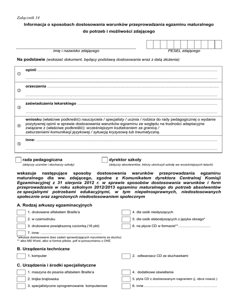 Załącznik 14 Informacja o sposobach dostosowania warunków przeprowadzania egzaminu maturalnego do potrzeb i możliwości zdającego imię i nazwisko zdającego PESEL zdającego Na podstawie (wskazać dokument, będący podstawą dostosowania wraz z datą złożenia): opinii ……………………………………………………………………………………………………………………… ……………………………………………………………………………………………………………………………… orzeczenia ………………………………………………………………………………………………………………… ……………………………………………………………………………………………………………………………… zaświadczenia lekarskiego …………………………………………………………………………………………… ……………………………………………………………………………………………………………………………… wniosku (właściwe podkreślić) nauczyciela / specjalisty / ucznia / rodzica do rady pedagogicznej o wydanie pozytywnej opinii w sprawie dostosowania warunków egzaminu ze względu na trudności adaptacyjne związane z (właściwe podkreślić): wcześniejszym kształceniem za granicą / zaburzeniami komunikacji językowej / sytuacją kryzysową lub traumatyczną. inne: …………………………………….………………………………………………………………………………… ……………………………………………………………………………………………………………………………… rada pedagogiczna dyrektor szkoły (dotyczy uczniów i słuchaczy szkoły) (dotyczy absolwentów, którzy ukończyli szkołę we wcześniejszych latach) wskazuje następujące sposoby dostosowania warunków przeprowadzania egzaminu maturalnego dla ww. zdającego, zgodne z Komunikatem dyrektora Centralnej Komisji Egzaminacyjnej z 31 sierpnia 2012 r. w sprawie sposobów dostosowania warunków i form przeprowadzania w roku szkolnym 2012/2013 egzaminu maturalnego do potrzeb absolwentów ze specjalnymi potrzebami edukacyjnymi, w tym niepełnosprawnych, niedostosowanych społecznie oraz zagrożonych niedostosowaniem społecznym A. Rodzaj arkuszy egzaminacyjnych 1. drukowane alfabetem Braille’a 4. dla osób niesłyszących 2. w czarnodruku 5. dla osób słabosłyszących z języka obcego* 3. drukowane powiększoną czcionką (16 pkt) 6. na płycie CD w formacie**……………………… 7. inne: …………………………………………… *arkusze dostosowane (bez zadań sprawdzających rozumienie ze słuchu) ** albo MS Word, albo w formie plików .pdf w porozumieniu z OKE B. Urządzenia techniczne 1. komputer 2. odtwarzacz CD ze słuchawkami C. Urządzenia i środki specjalistyczne 1. maszyna do pisania alfabetem Braille’a 4. dodatkowe oświetlenie 2. linijka brajlowska 5. płyta CD z dostosowanym nagraniem (j. obce nowoż.) 3. specjalistyczne oprogramowanie komputerowe 6. inne ……………………………………….…………… D. Obecność specjalisty 1. surdopedagoga 3. tyflopedagoga 2. tłumacza języka migowego 4. pedagoga resocjalizacji/socjoterapeuty E. Dostosowanie kryteriów oceniania ze względu na 1. dysleksję rozwojową 3. trudności adaptacyjne związane z wcześniejszym kształceniem za granicą 2. autyzm (w tym zespół Aspergera) 4. zaburzenia komunikacji językowej, w tym mutyzm, afazję F. Pozostałe dostosowania 1. nauczyciel wspomagający w czytaniu w pisaniu 2. przystąpienie do egzaminu w osobnej sali 3. przedłużenie czasu przeprowadzania egzaminu ustnego z języka 4. wydłużenie czasu trwania egzaminu pisemnego o polskiego obcego o 15 minut minut 5. inne: …………………………………………………………………………………………………………………… ……………………………………………………………………………………………………………………………… Dodatkowo rada pedagogiczna dyrektor szkoły wnioskuje o ustalenie następujących warunków egzaminu nieujętych w Komunikacie dyrektora Centralnej Komisji Egzaminacyjnej (w porozumieniu z dyrektorem komisji okręgowej): ....................................................................................................................................................................................... ....................................................................................................................................................................................... ze względu na ............................................................................................................................................................... ....................................................................................................................................................................................... Wypełnić po otrzymaniu pisma z OKE Na podstawie uzgodnień z dyrektorem OKE (pismo nr, data) ........………………………........................................ ustala się następujące warunki nieujęte w komunikacie dyrektora CKE: ....................................................................................................................................................................................... ....................................................................................................................................................................................... .............................................. miejscowość ......................... data ............................................................................................. podpis przewodniczącego rady pedagogicznej (dyrektora s