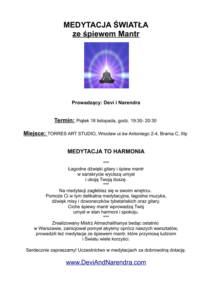 MEDYTACJA ŚWIATŁA ze śpiewem Mantr Prowadzący: Devi i Narendra Termin: Piątek 18 listopada, godz. 19:30- 20:30 Miejsce: TORRES ART STUDIO, Wrocław ul.św Antoniego 2-4, Brama C, IIIp MEDYTACJA TO HARMONIA *** Łagodne dźwięki gitary i śpiew mantr w sanskrycie wyciszą umysł i ukoją Twoją duszę. *** Na medytacji zagłebisz się w swoim wnętrzu. Pomoże Ci w tym delikatna medytacyjna, łagodna muzyka, dźwięk misy i dzwoneczków tybetańskich oraz gitary. Ciche śpiewy mantr wprowadzą Twój umysł w stan harmoni i spokoju. *** Zrealizowany Mistrz Atmachaithanya bedąc ostatnio w Warszawie, zainicjował pomysł abyśmy oprócz naszych warsztatów, prowadzili też medytacje ze śpiewem mantr, które przyniosą ludziom i Światu wiele korzyści. Serdecznie zapraszamy! Uczestnictwo w medytacjach za dobrowolną dotację. www.DeviAndNarendra.com