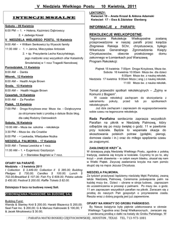 V Niedziela Wielkiego Postu INTENCJE MSZALNE Sobota – 09 Kwietnia 10 Kwietnia, 2011 LEKTORZY: Kwiecień 10 – Aneta Krozel & Aldona Adamski Kwiecień 17 – Ewa & Zdzisław Elenberg INFORMACJE z PARAFII: 6:00 PM -– 1. + Helena, Kazimierz Dąbrowscy 2. + Jadwiga Kowal V NIEDZIELA WIELKIEGO POSTU, 10 Kwietnia 9:00 AM – + William Senkowicz by Wysocki family 11:00 AM – 1. + Janina, Mieczysław Antosiak 2. + śp. Prezydenta Lecha Kaczyńskiego, jego małżonki oraz wszystkich ofiar Katastrofy Smoleńskiej w 1 rocz Tragedii Narodowej Poniedziałek, 11 Kwietnia 8:00 AM - Dantis Wtorek, 12 Kwietnia 8:00 AM – Health Angie Brown Środa, 13 Kwietnia 8:00 AM – Health Haggie Brown Czwartek, 14 Kwietnia 8:00 AM - Za Parafian Piątek, 15 Kwietnia 7:00 PM - Droga Krzyżowa oraz Msza św. – Dziękczynna za otrzymane łaski z prośbą o dalsze Boże błog. dla całej Rodziny Ostrowskich Sobota, 16 Kwietnia 10:00 AM – Msza św. szkolna - rekolekcje 3:30 PM – Msza św. dla Croatów 6:00 PM - + Leokadia, Władysław Nożka NIEDZIELA PALMOWA - 17 Kwietnia 9:00 AM – Teresa Lewicka w 1 rocz. 11:00 AM – 1. + Eugeniusz Gazdyszyn 2. + Stanisław Bagiński w 7 rocz. OFIARY NA PARAFIÊ: Niedziela – 3 kwietnia 2011 I Collection $ 3,449.00; Collection II $ 385.00; Building Pledges $ 730,00; Candles $ 100.00; Lunch $ 702.00;Breakfast $ 107.00; Fish Fry $ 608.00; Polska szkoła $ 450.00; Festival $ 200.00; Raffle Tickets $ 82.00. Dzisiejsza II taca na budowę nowej Sali. ZOBOWIĄZANIA FINANSOWE NA BUDOWĘ SALI Building Fund: Wanda & Stanley Król $ 200.00; Harald Blazevicz $ 200,00; Seal Fast Inc. $ 200,00; G & Mariusz Kalinowski $ 100,00; T & Jacek Mrozkiewicz $ 30.00; REKOLEKCJE WIELKOPOSTNE. Tegoroczne Rekolekcje Wielkopostne zostaną przeprowadzone w naszej parafii przez księdza Zbigniewa Rakieja SChr, chrystusowca, byłego Wikariusza Generalnego Zgromadzenia Księży Chrystusowców, obecnie przełożonego domu zakonnego w Łomiankach pod Warszawą. Program Rekolekcji: Piątrek 15 kwietnia 7:00pm Droga Krzyżowa, Msza św. Sobota 16 kwietnia 10:00am Msza św. dla dzieci 6:00pm Msza św. z nauką rekolek. Niedziela 17 kwietnia 9:00am Msza ( ang.) z nauką rekolek. 11:00 Msza św. z nauka rekolek. Temat przewodni spotkań rekolekcyjnych – „Żyjmy w Komunii z Bogiem”. W czasie rekolekcji zachęcam do skorzystania z sakramentu pokuty, przed lub po spotkaniach rekolekcyjnych. Już dzis zachęcam i zapraszam do wygospodarowania sobie czasu na tegoroczne rekolekcje. Rada Parafialna serdecznie zaprasza wszystkich Parafian na piknik w Niedzielę Palmową, który odbędzie się po mszy świętej o godz. 11 w pawilonie przy kościele. Będzie to wspaniała okazja do skosztowania polskich potraw (gołąbki, pierogi, domowe ciasta i in.) oraz do miłego spędzenia czasu ze znajomymi. ZAS£ONIĘCIE KRZY¯A. W dzisiejszą piątą Niedzielę Wielkiego Postu, zgodnie z polską tradycją, zasłania się krzyże w kościele. Czynimy to po to, aby krzyż – znak zbawienia – w całym swym blasku, ukazał się nam w Wielki Piątek. Zwyczaj zasłaniania krzyża ma nam pomóc skupić się na męce Jezusa Chrystusa. NIEDZIELA PALMOWA. Za tydzień przeżywać będziemy niedzielę Męki Pańskiej, zwaną także Niedzielą Palmową. Ceremonia poświęcenia palm na każdej mszy św.. Dzieci – ubrane w stroje ludowe, zapraszam do uczestniczenia w procesji z palmami. Po mszy św. o godz. 11 am zapraszam wszystkich parafian na piknik. Zwracam się z prośbą do naszych Pań gospodyń o przyniesienie ciasta. Reszta wraz z dobrą pogodą jest już zapewnione. OFIARY NA KWIATY DO GROBU PAŃSKIEGO. By Nasza świątynia była pięknie udekorowana w okresie Wielkiego Tygodnia oraz Œwiąt Wielkanocnych, zwracam się z serdeczną prośbą o datki na kwiaty do Grobu Pańskiego. W | PARAFIA MATKI BOSKIEJ CZĘSTOCHOWSKIEJ , HOUSTON , TEXAS TEL. 713-973-1081 V Niedziela Wielkiego Postu ławkach i na stoliku przy wyjściu z kościoła wyłożone są specjalne koperty. Parafianie którzy mają roczne koperty, mają je także w swoim zestawie. Z góry dziękuję za złożone ofiary. FISH FRY. Zapraszamy w każdy piątek Wielkiego Postu od godz. 5:00 PM do 8:30 PM do Sali Parafialnej na postną kolację z rybą. W ubiegły piątek dochód z tej akcji wyniósł $ 608.00, z przeznaczeniem na Parafię. V FESTIWAL POLSKI w HOUSTON. Zbliża się już termin naszego kolejnego majowego Festiwalu. Tym razem będzie to już V Jubileuszowy Polski Festival. W tym roku będziemy go świętować, jak zawsze przez dwa dni: 30 kwietnia oraz 1 Maja. W drugi dzień naszego Festiwalu, w niedzielę 1 maja, będziemy dziękować Bogu w czasie Mszy św. za beatyfikację Jana Pawła II. Komitet organizacyjny tegorocznego Festiwalu czyni juz odpowiednie przygotowania. Głównym koordynatorem tegorocznego festiwalu jest Stanley POLAK tel: 713 857 4549. Zapraszamy wszystkich, którzy gotowi są pomóc w przygotowaniu i przeprowadzeniu Festiwalu do współpracy. Pani Maryna Kęstowicz-Lech apeluje do utalentowanych dzieci, młodzieży oraz do ich rodziców, aby zgłosili się do prezentacji swoich zdolności w czasie tegorocznego festiwalu. Kontakt pod telefonem: 713 983 6886. Tradycyjnie w czasie Festiwalu przewidziana jest tzw. „Cicha Aukcja”. Ktokolwiek chciałby przekazać jakieś nowe, dobre rzeczy lub przedmioty, proszony jest o przyniesienie tego do sali parafialnej, zakrystii lub do osoby odpowiedzialnej. Zrodziła się także myśl, zorganizowania w naszej nowej Sali, wystawy pamiątek, zdjęć lub innych rzeczy, które może są w posiadaniu naszych parafian, a są związane z osobą Papieża. Stąd gorąca prośba o ich wypożyczenie na czas tegorocznego Festiwalu. Oryginały zdjęć, po zrobieniu kopii, posłużą do zrobienia wystawy. Także w ramach przygotowań do Festiwalu zrodziła sie inicjatywa powstania pierwszej polskiej telewizji houstońskiej. Strona internetowa: www.telewizjahouston.com jest narazie w fazie testowej, ale or