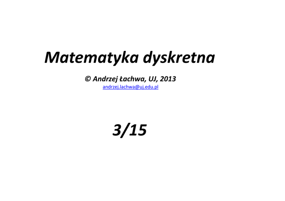 Matematyka dyskretna © Andrzej Łachwa, UJ, 2013 [email protected] 3/15 Podzielność Niech liczba całkowita p>0. Dla każdej liczby całkowitej a mówimy, że a jest podzielne przez p (p jest dzielnikiem a, p dzieli a, p|a), jeśli istnieje liczba całkowita q taka, że a=pq. Dla dowolnych całkowitych a, b, c zachodzi: jeśli a|b to a|bc, jeśli a|b i b|c to a|c, jeśli a|b i a|c to a|(b+c). Dowolną liczbę wymierną a można wydzielić przez dowolną niezerową liczbę wymierną b i wynik tego działania jest liczbą wymierną. Niech liczba całkowita p>0. Wtedy dla każdej liczby całkowitej a istnieją jednoznacznie wyznaczone: iloraz q i reszta r spełniające a = pq + r oraz 0r<p. Resztę r z dzielenia a przez p zapisujemy też jako: a mod p. Iloraz q zapisujemy jako: a div p. a div p = a/p a mod p = a – p (a div p) Wartości funkcji „mod p” znajdują się w zbiorze {0, 1, 2, … p‐1} = ZP. Funkcja ta przekształca zbiór Z na zbiór ZP. Przykłady 31 mod 5 = 1, (‐31) mod 5 = 4, 31 div 5 = 6, (‐31) div 5 = ‐7 NWD Największy wspólny dzielnik NWD(a, b) liczb a i b, gdzie chociaż jedna z tych liczb jest różna od 0, to największa liczba d taka, że d|a i d|b. Oczywiście, 1 NWD(a, b) min(a, b). Algorytm Euklidesa (1) Wczytaj liczby a, b >0. (2) Oblicz r jako resztę z dzielenia a przez b. (3) Zastąp a przez b, zaś b przez r. (4) Jeżeli b=0 to zwróć a w przeciwnym wypadku przejdź do (2). Przykład NWD(1029, 1071) = 21 Dla dowodu poprawności algorytmu Euklidesa ustalmy dwie liczby naturalne a, b > 0. Jeśli a< b to podany algorytm odwróci ich porządek przy pierwszym wykonaniu kroku (3). Zauważmy, że w każdym następnym kroku a > b > r ponieważ reszta z dzielenia a przez b leży w zbiorze . A zatem kolejne reszty będą tworzyć ciąg ściśle malejący, który w końcu osiągnie 0, czyli algorytm Euklidesa po pewnej skończonej ilości kroków się zatrzyma. Pozostaje sprawdzić, czy algorytm Euklidesa zwraca właściwą odpowiedź. Niech r = a mod b, tzn. r = a–bq dla pewnego q. Wszystkie dzielniki a i b dzielą prawą stronę ostatniej równości, a więc dzielą też r, co implikuje NWD(a, b)= NWD(b, r). Dowodzi to, iż wszystkie pary rozważane przez algorytm mają te same dzielniki, a więc ten sam NWD… Rozszerzenie algorytmu Euklidesa Algorytm Euklidesa można zastosować do wskazania dwu dodatkowych liczb całkowitych x, y takich, że Fakt ten leży u podstaw wielu twierdzeń, jest stosowany do rozwiązywania równań i w przekształceniach kryptograficznych. Dowód Załóżmy, że a>b. Niech , , natomiast będą kolejnymi resztami wygenerowanymi przez algorytm Euklidesa, oraz i wtedy . Dla każdej reszty ri+2 istnieje pewne qi+1 takie, że ri+2 = ri – qi+1r i+1. Indukcyjnie dowodzimy: (1) r2 = r0 – q1 r 1 = a – q1 b czyli x=1, y=–q1 (2) zakładamy, że dla każdego j=2, 3 …, i+1 jest istnieją x, y takie, że rj=xa+yb i liczmy ri+2 = ri – qi r i+1 = ri –qi (ri‐1 –qi‐1 r i) = ri(1– qi‐1) – qi ri‐1 = (ax’+by’)(1–qi‐1) – qi (ax”+by”) = a(x’–x’qi‐1 –qi x”) + b(y’–y’qi‐1 –qi y”) A zatem dla rn = NWD(a,b) też istnieją odpowiednie x, y. Czas działania algorytmu Niech będą zdefiniowane, jak w dowodzie powyżej. (jeśli nie, to zaczynamy analizować po Załóżmy dodatkowo, iż pierwszym kroku algorytmu). Pokażemy, że Jeśli , to natychmiast mamy . Załóżmy więc, że . W tym przypadku podczas dzielenia przez zachodzi , czyli . Ponieważ po każdych, kolejnych dwu krokach rozmiar spada co . W każdym kroku najmniej dwukrotnie, kroków jest , a więc przeprowadzane jest dzielenie liczb długości ( ) operacji bitowych. To oznacza, iż do policzenia algorytmem Euklidesa wystarcza operacji bitowych. Aby policzyć współczynniki x, y takie, że , zgodnie jako z przedstawionym dowodem, należy przedstawić kombinację i , a później pozbyć się kolejnych (poczynając od ) wprowadzając . Mamy więc kroków i w każdym kroku przeprowadzamy mnożenie i dodawanie lub odejmowanie liczb o długości . Mamy zatem operacji bitowych. co najwyżej Przykład dla i A więc . . Aby wyrazić 7 jako kombinację danych wejściowych liczymy: Liczby pierwsze [Część prezentowanego tu materiału pochodzi z książki E. Gracjana: Liczby pierwsze. W drodze do nieskończoności. Seria: Świat jest matematyczny. RBA 2012] Ze wstępu: „… liczby pierwsze to niesforna zgraja. Pojawiają się tam gdzie chcą, bez ostrzeżenia, w sposób pozornie chaotyczny, bez żadnych reguł. A najgorsze, że nie da się ich ignorować – są absolutnie niezbędne …” Liczba naturalna jest nazywana pierwszą gdy jest podzielna tylko przez 1 i przez samą siebie, tzn. gdy posiada dokładnie dwa różne dzielniki. Liczba złożona to liczba naturalna, która nie jest pierwsza, a więc ma jakiś dodatni dzielnik różny od 1 i od niej samej. Fundamentalne twierdzenie arytmetyki Każdą liczbę naturalna można zapisać jako iloczyn liczb pierwszych i na dodatek taki rozkład na czynniki pierwsze jest tylko jeden (z dokładnością do kolejności czynników). Liczby pierwsze służą więc do utworzenia wszystkich innych liczb! 120 60 30 15 5 1 2 2 2 3 5 Zatem 120 = 22235 Skąd wziąć kolejne liczby pierwsze do powyższego dzielenia? Obecnie nie jest znany żaden efektywny algorytm faktoryzujący liczby naturalne, tzn. znajdujący rozkład na iloczyn liczb pierwszych. Oczekiwana trudność tego problemu jest sercem wielu współczesnych systemów kryptograficznych (np. RSA). Nie wszystkie liczby są równie trudne w rozkładzie. Póki co, (w połowie 2006 roku) najtrudniejsze wydają się liczby, które są iloczynami dwu liczb pierwszych podobnej długości. Aby choć trochę zrozumieć trudność problemu faktoryzacji proponujemy znaleźć nietrywialny dzielnik liczby złożonej 10721. Na stronie WWW firmy RSA podane są znacznie większe liczby, za rozkład których RSA skłonna jest płacić nawet 200 tys.