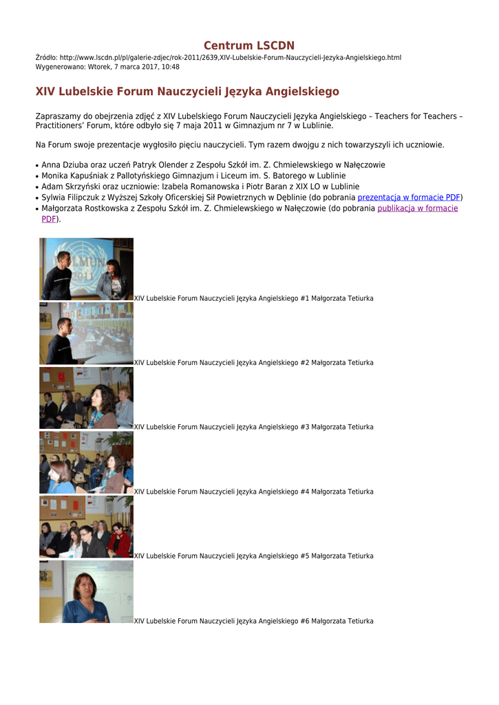 Centrum LSCDN Źródło: http://www.lscdn.pl/pl/galerie-zdjec/rok-2011/2639,XIV-Lubelskie-Forum-Nauczycieli-Jezyka-Angielskiego.html Wygenerowano: Wtorek, 7 marca 2017, 10:48 XIV Lubelskie Forum Nauczycieli Języka Angielskiego Zapraszamy do obejrzenia zdjęć z XIV Lubelskiego Forum Nauczycieli Języka Angielskiego – Teachers for Teachers – Practitioners’ Forum, które odbyło się 7 maja 2011 w Gimnazjum nr 7 w Lublinie. Na Forum swoje prezentacje wygłosiło pięciu nauczycieli. Tym razem dwojgu z nich towarzyszyli ich uczniowie. ● ● ● ● ● Anna Dziuba oraz uczeń Patryk Olender z Zespołu Szkół im. Z. Chmielewskiego w Nałęczowie Monika Kapuśniak z Pallotyńskiego Gimnazjum i Liceum im. S. Batorego w Lublinie Adam Skrzyński oraz uczniowie: Izabela Romanowska i Piotr Baran z XIX LO w Lublinie Sylwia Filipczuk z Wyższej Szkoły Oficerskiej Sił Powietrznych w Dęblinie (do pobrania prezentacja w formacie PDF) Małgorzata Rostkowska z Zespołu Szkół im. Z. Chmielewskiego w Nałęczowie (do pobrania publikacja w formacie PDF). XIV Lubelskie Forum Nauczycieli Języka Angielskiego #1 Małgorzata Tetiurka XIV Lubelskie Forum Nauczycieli Języka Angielskiego #2 Małgorzata Tetiurka XIV Lubelskie Forum Nauczycieli Języka Angielskiego #3 Małgorzata Tetiurka XIV Lubelskie Forum Nauczycieli Języka Angielskiego #4 Małgorzata Tetiurka XIV Lubelskie Forum Nauczycieli Języka Angielskiego #5 Małgorzata Tetiurka XIV Lubelskie Forum Nauczycieli Języka Angielskiego #6 Małgorzata Tetiurka XIV Lubelskie Forum Nauczycieli Języka Angielskiego #7 Małgorzata Tetiurka XIV Lubelskie Forum Nauczycieli Języka Angielskiego #8 Małgorzata Tetiurka XIV Lubelskie Forum Nauczycieli Języka Angielskiego #9 Małgorzata Tetiurka XIV Lubelskie Forum Nauczycieli Języka Angielskiego #10 Małgorzata Tetiurka XIV Lubelskie Forum Nauczycieli Języka Angielskiego #11 Małgorzata Tetiurka XIV Lubelskie Forum Nauczycieli Języka Angielskiego #12 Małgorzata Tetiurka XIV Lubelskie Forum Nauczycieli Języka Angielskiego #13 Małgorzata Tetiurka XIV Lubelskie Forum Nauczycieli Języka Angielskiego #14 Małgorzata Tetiurka XIV Lubelskie Forum Nauczycieli Języka Angielskiego #15 Małgorzata Tetiurka XIV Lubelskie Forum Nauczycieli Języka Angielskiego #16 Małgorzata Tetiurka XIV Lubelskie Forum Nauczycieli Języka Angielskiego #17 Małgorzata Tetiurka XIV Lubelskie Forum Nauczycieli Języka Angielskiego #18 Małgorzata Tetiurka XIV Lubelskie Forum Nauczycieli Języka Angielskiego #19 Małgorzata Tetiurka XIV Lubelskie Forum Nauczycieli Języka Angielskiego #20 Małgorzata Tetiurka XIV Lubelskie Forum Nauczycieli Języka Angielskiego #21 Małgorzata Tetiurka XIV Lubelskie Forum Nauczycieli Języka Angielskiego #22 Małgorzata Tetiurka XIV Lubelskie Forum Nauczycieli Języka Angielskiego #23 Małgorzata Tetiurka