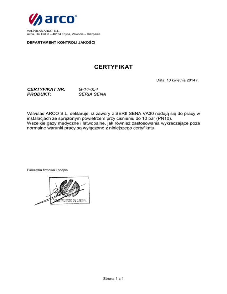 VALVULAS ARCO, S.L. Avda. Del Cid, 8 – 46134 Foyos, Valencia – Hiszpania DEPARTAMENT KONTROLI JAKOŚCI CERTYFIKAT Data: 10 kwietnia 2014 r. CERTYFIKAT NR: PRODUKT: G-14-054 SERIA SENA Válvulas ARCO S.L. deklaruje, iż zawory z SERII SENA VA30 nadają się do pracy w instalacjach ze sprężonym powietrzem przy ciśnieniu do 10 bar (PN10). Wszelkie gazy medyczne i łatwopalne, jak również zastosowania wykraczające poza normalne warunki pracy są wyłączone z niniejszego certyfikatu. Pieczątka firmowa i podpis Strona 1 z 1 VALVULAS ARCO, S.L. Avda. del Cid, 8 - 46134 Foyos, Valencia - ESPAÑA QUALITY ASSURANCE DEPARTMENT CERTIFICATE Date: CERTIFICATE Nº 10th April 2014 G-14-054 CLIENT: SERIES ARTICLE ARTICLE SERIES SENA Válvulas ARCO S.L. certifies that its SERIES SENA VA30 is suitable for working in compressed air networks, until pressures of 10 bar (PN10). All medicinal and inflammable gases are excluded of this certification as well as uses out of normal working conditions. Firma y Sello. Página 1 de 1