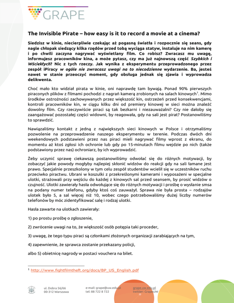 The Invisible Pirate – how easy is it to record a movie at a cinema? Siedzisz w kinie, niecierpliwie czekając aż pogasną światła i rozpocznie się seans, gdy nagle chłopak siedzący kilka rzędów przed tobą wyciąga statyw, instaluje na nim kamerę i po chwili zaczyna nagrywać wyświetlany film. Co robisz? Zwracasz mu uwagę, informujesz pracowników kina, a może pytasz, czy ma już najnowszą część Szybkich i Wściekłych? Nic z tych rzeczy. Jak wynika z eksperymentu przeprowadzonego przez zespół iPiracy w ogóle nie zwracasz uwagi na to niecodzienne wydarzenie. Ba, jesteś nawet w stanie przeoczyć moment, gdy obsługa jednak się zjawia i wyprowadza delikwenta. Choć mało kto widział pirata w kinie, oni naprawdę tam bywają. Ponad 90% pierwszych piraconych plików z filmami pochodzi z nagrań kamerą zrobionych na salach kinowych1. Mimo środków ostrożności zachowywanych przez większość kin, ostrzeżeń przed konsekwencjami, kontroli pracowników kin, w ciągu kilku dni od premiery kinowej w sieci można znaleźć dowolny film. Czy rzeczywiście piraci są tak bezkarni i niezauważalni? Czy nie dałoby się zaangażować pozostałej części widowni, by reagowała, gdy na sali jest pirat? Postanowiliśmy to sprawdzić. Nawiązaliśmy kontakt z jedną z największych sieci kinowych w Polsce i otrzymaliśmy pozwolenie na przeprowadzenie naszego eksperymentu w terenie. Podczas dwóch dni weekendowych podstawieni przez nas piraci mieli nagrywać filmy wprost z ekranu, do momentu aż ktoś zgłosi ich ochronie lub gdy po 15-minutach filmu wejdzie po nich (także podstawiony przez nas) ochroniarz, by ich wyprowadzić. Żeby uczynić sprawę ciekawszą postanowiliśmy odwołać się do różnych motywacji, by zobaczyć jakie powody mogłyby najlepiej skłonić widzów do reakcji gdy na sali łamane jest prawo. Specjalnie przeszkolony w tym celu zespół studentów wcielił się w uczestników ruchu przeciwko piractwu. Ubrani w koszulki z przekreślonymi kamerami i wyposażeni w specjalne ulotki, strażowali przy wejściu do każdej z kinowych sal przed seansem, by prosić widzów o czujność. Ulotki zawierały hasła odwołujące się do różnych motywacji i prośbę o wysłanie smsa na podany numer telefonu, gdyby ktoś coś zauważył. Sprawa nie była prosta – rodzajów ulotek było 5, a sal więcej niż 10, wobec czego potrzebowaliśmy dużej liczby numerów telefonów by móc zidentyfikować salę i rodzaj ulotki. Hasła zawarte na ulotkach zawierały: 1) po prostu prośbę o zgłoszenie, 2) zwrócenie uwagi na to, że większość osób potępia taki proceder, 3) uwagę, że tego typu piraci są członkami złożonych organizacji zarabiających na tym, 4) zapewnienie, że sprawca zostanie przekazany policji, albo 5) obietnicę nagrody w postaci vouchera na bilet. 1 http://www.fightfilmtheft.org/docs/BP_US_English.pdf ul. Dobra 56/66 00-312 Warszawa e-mail: [email protected] tel: 88 722 8 722 grape.uw.edu.pl twitter: GrapeUW W ciągu dwóch dni eksperymentu nasi działacze rozdali łącznie ok. 1250 ulotek podczas niemal 50 filmów. W międzyczasie naszych czterech `piratów’ miało zupełnie inne zadanie. Wchodzili oni na salę tak jak wszyscy inni widzowie i ustawiali się w jednym z przednich rzędów na środku. Gdy kończyły się reklamy i rozpoczynał właściwy film, piraci wyciągali ze swych toreb kamery, które następnie ustawiali obok siebie na statywach. Po 15 minutach od rozpoczęcia filmu – niezależnie od otrzymania przez nas smsów – na salę wchodził podstawiony przez nas ochroniarz i wyprowadzał pirata, (który, zniknąwszy z oczu widzom, udawał się na kolejny film). Dwa dni, 49 filmów, ponad 1250 ulotek i jeszcze więcej widzów (np.: pary często otrzymywały jedną ulotkę!). Liczba smsów... 22. Co poszło nie tak? Czy nasz eksperyment został przejrzany? Drugiego dnia postanowiliśmy odpytywać losowo wybranych widzów, gdy wychodzili z sal po filmie. Czy widzieli pirata? Dlaczego (nie) zareagowali? W 82% przypadków widzowie twierdzili, że nie widzieli żadnego pirata, , w 9% zorientowali się gdy był wyprowadzany, a tylko kilka osób domyśliło się, że byli badani. Nasi piraci siedzieli z przodu, na środku, a kamera znajdywała się co najmniej na poziomie ich głowy – obok nich. Jak sprawdziliśmy, byli widoczni z góry sali, ale może śledzenie filmu było dla widzów ważniejsze? Czy nasz pirat był tak niezauważalny jak goryl podczas gry w kosza?2 2 W słynnym eksperymencie z 1999 roku Dan Simmons i Christopher Chabris pokazali jak łatwo przegapić coś podczas wytężonego skupienia na innej rzeczy. Nawet jeśli tym co przegapiamy jest bijący się w pierś goryl pośród grupy ludzi wymieniających się piłkami. ul. Dobra 56/66 00-312 Warszawa e-mail: [email protected] tel: 88 722 8 722 grape.uw.edu.pl twitter: GrapeUW Wysłaliśmy nagrody dla tych uczestników, którzy odpowiedzieli na obietnicę wygranej i zastanawialiśmy się co dalej. Postanowiliśmy wykonać jeszcze krótki test w jednym z mniejszych warszawskich kin, za zgodą jego zarządu – czy ich publika mogła mieć inne podejście? Tym razem podeszliśmy do zadania bez ulotek. Na sali był pirat, wyprowadzany po pewnym czasie przez kinowego ochroniarza. Ktoś inny z naszej grupy siedział wśród widowni by zapytać oglądających czy widzieli, co się stało. Oglądacze byli jednak niezaaferowani sprawą. Podczas jednego z seansów, ktoś z widzów wyszedł w trakcie filmu z telefonem w ręku. Wychodząc przeszedł tuż za plecami pirata musząc zauważyć jego kamerę! Będąc tym akurat kinowym piratem byłem wówczas pewien, że za chwilę ktoś po mnie przyjdzie. Telefon w ręku to szybki sposób na powiadomienie władz, a z drugiej strony na terenie kina jest mnóstwo jego pracowników – nawet, jeśli widz wyszedł odebrać telefon, to wspomnienie komuś o piracie na sali zajęłoby mu pięć sekund. Widz jednak wkrótce wrócił