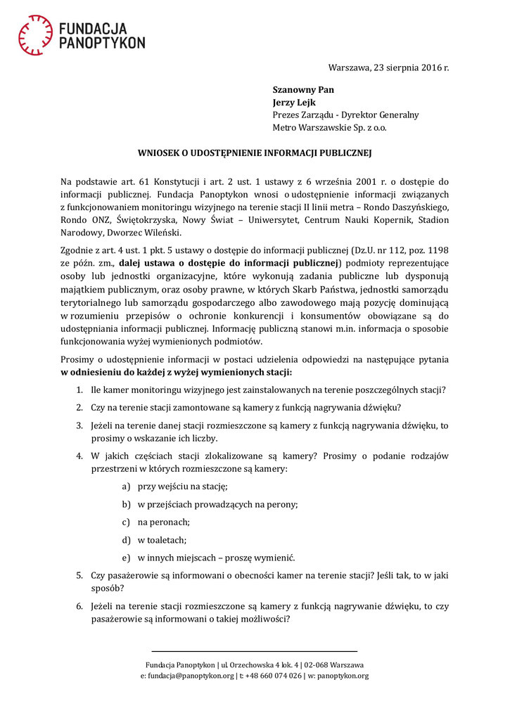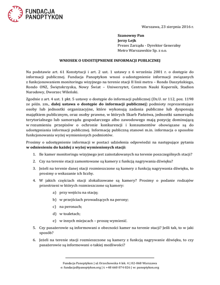 Warszawa, 23 sierpnia 2016 r. Szanowny Pan Jerzy Lejk Prezes Zarządu - Dyrektor Generalny Metro Warszawskie Sp. z o.o. WNIOSEK O UDOSTĘPNIENIE INFORMACJI PUBLICZNEJ Na podstawie art. 61 Konstytucji i art. 2 ust. 1 ustawy z 6 września 2001 r. o dostępie do informacji publicznej. Fundacja Panoptykon wnosi o udostępnienie informacji związanych z funkcjonowaniem monitoringu wizyjnego na terenie stacji II linii metra – Rondo Daszyńskiego, Rondo ONZ, Świętokrzyska, Nowy Świat – Uniwersytet, Centrum Nauki Kopernik, Stadion Narodowy, Dworzec Wileński. Zgodnie z art. 4 ust. 1 pkt. 5 ustawy o dostępie do informacji publicznej (Dz.U. nr 112, poz. 1198 ze późn. zm., dalej ustawa o dostępie do informacji publicznej) podmioty reprezentujące osoby lub jednostki organizacyjne, które wykonują zadania publiczne lub dysponują majątkiem publicznym, oraz osoby prawne, w których Skarb Państwa, jednostki samorządu terytorialnego lub samorządu gospodarczego albo zawodowego mają pozycję dominującą w rozumieniu przepisów o ochronie konkurencji i konsumentów obowiązane są do udostępniania informacji publicznej. Informację publiczną stanowi m.in. informacja o sposobie funkcjonowania wyżej wymienionych podmiotów. Prosimy o udostępnienie informacji w postaci udzielenia odpowiedzi na następujące pytania w odniesieniu do każdej z wyżej wymienionych stacji: 1. Ile kamer monitoringu wizyjnego jest zainstalowanych na terenie poszczególnych stacji? 2. Czy na terenie stacji zamontowane są kamery z funkcją nagrywania dźwięku? 3. Jeżeli na terenie danej stacji rozmieszczone są kamery z funkcją nagrywania dźwięku, to prosimy o wskazanie ich liczby. 4. W jakich częściach stacji zlokalizowane są kamery? Prosimy o podanie rodzajów przestrzeni w których rozmieszczone są kamery: a) przy wejściu na stację; b) w przejściach prowadzących na perony; c) na peronach; d) w toaletach; e) w innych miejscach – proszę wymienić. 5. Czy pasażerowie są informowani o obecności kamer na terenie stacji? Jeśli tak, to w jaki sposób? 6. Jeżeli na terenie stacji rozmieszczone są kamery z funkcją nagrywanie dźwięku, to czy pasażerowie są informowani o takiej możliwości? Fundacja Panoptykon | ul. Orzechowska 4 lok. 4 | 02-068 Warszawa e: [email protected] | t: +48 660 074 026 | w: panoptykon.org 7. Czy obraz z kamer jest wyłącznie nagrywany, wyłącznie oglądany w czasie rzeczywistym, czy zarówno nagrywany, jak i oglądany? 8. Czy ustalono i upubliczniono zasady korzystania z monitoringu? Jeżeli tak, to w jakiej formie powyższe zasady zostały upublicznione? 9. Kto jest uprawniony do dostępu do: a) obrazu z monitoringu w czasie rzeczywistym; b) do nagrań z monitoringu? 10. Czy istnieją procedury wglądu do przechowywanych nagrań przez osoby, których wizerunek został na nich zarejestrowany? 11. W jaki sposób nagrania są zabezpieczone przed dostępem osób nieuprawionych? 12. Jak długo przechowywane są nagrania z kamer monitoringu? Jeżeli na terenie danej stacji stosowane są kamery z funkcją nagrywania dźwięku, to prosimy o wyszczególnienie okresu przechowywania nagrań z dźwiękiem. *** Zgodnie z art. 11 pkt 2 ustawy z dn. 10 czerwca 2016 r. Szef Agencji Bezpieczeństwa Wewnętrznego może nieodpłatnie uzyskać dostęp do obrazu zdarzeń rejestrowanego przez urządzenia rejestrujące obraz umieszczone w obiektach użyteczności publicznej, przy drogach publicznych i innych miejscach publicznych oraz otrzymywać nieodpłatnie kopię zarejestrowanego zapisu tego obrazu. Zgodnie z art. 34 ust. 2a administrator zbioru danych udostępnia Szefowi ABW w drodze teletransmisji informacje zgromadzone w zbiorach danych bez konieczności każdorazowego przedstawiania imiennego upoważnienia wydanego przez Szefa ABW, okazywanego przez funkcjonariusza ABW wraz z legitymacją służbową, o których mowa w ust. 2, jeśli jednostka ABW spełnia określone w tym przepisie warunki. W związku z powyższym prosimy o udostępnienie informacji, czy Metro Warszawskie udostępnia Agencji Bezpieczeństwa Wewnętrznego w drodze teletransmisji obraz z kamer zamontowanych na stacjach I oraz II linii metra warszawskiego. Prosimy o przesłanie informacji drogą elektroniczną w otwartym formacie umożliwiającym kopiowanie (pdf, odt, doc, rtf, xls lub ods) na adres mailowy: [email protected]. W imieniu Fundacji Panoptykon _______________________________ Małgorzata Szumańska Wiceprezeska 2 3