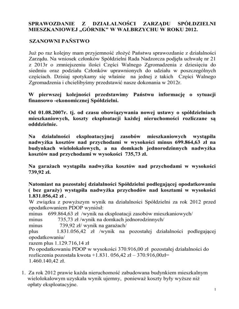 SPRAWOZDANIE Z DZIAŁALNOŚCI ZARZĄDU SPÓŁDZIELNI MIESZKANIOWEJ „GÓRNIK" W WAŁBRZYCHU W ROKU 2012. SZANOWNI PAŃSTWO Już po raz kolejny mam przyjemność złożyć Państwu sprawozdanie z działalności Zarządu. Na wniosek członków Spółdzielni Rada Nadzorcza podjęła uchwałę nr 21 z 2013r o zmniejszeniu ilości Części Walnego Zgromadzenia z dziesięciu do siedmiu oraz podziału Członków uprawnionych do udziału w poszczególnych częściach. Dzisiaj spotykamy się właśnie na jednej z takich Części Walnego Zgromadzenia i chcielibyśmy przedstawić nasze dokonania w 2012r. W pierwszej kolejności przedstawimy Państwu informację o sytuacji finansowo -ekonomicznej Spółdzielni. Od 01.08.2007r. tj. od czasu obowiązywania nowej ustawy o spółdzielniach mieszkaniowych, koszty eksploatacji każdej nieruchomości rozliczane są odddzielnie. Na działalności eksploatacyjnej zasobów mieszkaniowych wystąpiła nadwyżka kosztów nad przychodami w wysokości minus 699.864,63 zł na budynkach wielolokalowych, a na domkach jednorodzinnych nadwyżka kosztów nad przychodami w wysokości 735,73 zł. Na garażach wystąpiła nadwyżka kosztów nad przychodami w wysokości 739,92 zł. Natomiast na pozostałej działalności Spółdzielni podlegającej opodatkowaniu ( bez garaży) wystąpiła nadwyżka przychodów nad kosztami w wysokości 1.831.056,42 zł . W związku z powyższym wynik na działalności Spółdzielni za rok 2012 przed opodatkowaniem PDOP wyniósł: minus 699.864,63 zł /wynik na eksploatacji zasobów mieszkaniowych/ minus 735,73 zł /wynik na domkach jednorodzinnych/ minus 739,92 zł/ wynik na garażach/ plus 1.831.056,42 zł /wynik na pozostałej działalności podlegającej opodatkowaniu/ razem plus 1.129.716,14 zł Po opodatkowaniu PDOP w wysokości 370.916,00 zł pozostałej działalności do rozliczenia pozostała kwota +1.831. 056,42 zł – 370.916,00zł= 1.460.140,42 zł. 1. Za rok 2012 prawie każda nieruchomość zabudowana budynkiem mieszkalnym wielolokalowym uzyskała wynik ujemny, ponieważ koszty były wyższe niż opłaty eksploatacyjne. 1 2. Na pokrycie różnicy między kosztami, a przychodami zgodnie ze Statutem Spółdzielni /par.63 ust.1/ została podjęta przez Radę Nadzorczą uchwała nr 101/2011 z dnia 13.12.2011r. o przekazaniu kwoty 800.305,00 zł z pozostałej działalności /po opodatkowaniu/,co przekłada się na zmniejszenie stawek opłat eksploatacyjnych dla członków Spółdzielni. Na pokrycie kosztów związanych z eksploatacją i utrzymaniem nieruchomości w zakresie obciążającym członków przekazano kwotę 514.954,47 zł ,a pozostałą różnicę w wysokości 285.350,53 zł zgodnie z art.6 ust.1 ustawy o spółdzielniach mieszkaniowych z dnia 14.06.2007r. przeniesiono na rozliczenia międzyokresowe . Pomimo dofinansowania, na niektórych nieruchomościach w dalszym ciągu pozostał wynik ujemny w wysokości: - 184.910,16 zł /dot. budynków mieszkalnych/, 735,73 zł /dot. domków jednorodzinnych/ 739,92 zł /dot. garaży/ razem:186.385,81 zł. Kwota 31.457,15 zł została przekazana na dofinansowanie do opłat eksploatacyjnych dla członków Spółdzielni zamieszkujących we wspólnotach zarządzanych przez Spółdzielnię. Pozostała kwota w wysokości 628.378,27 zł. została przeksięgowana na wspólny fundusz remontowy pod datą 31.12.2012r. Bilans Spółdzielni sporządzony na 31 grudnia 2012r. zamyka się po stronie aktywów i pasywów sumą 69.578.548,43 zł. Po stronie aktywów, na w/w sumę składają się : 1. aktywa trwałe 2. aktywa obrotowe 60.224.489,20 zł, 9.354.059,23 zł Po stronie pasywów na w/w sumę składają się : 1. Fundusze własne 52.975.586,95 zł 2. Zobowiązania i rezerwy na zobowiązania 16.602.961,48 zł Pomimo zmniejszenia dochodów z działalności gospodarczej Spółdzielni, wskutek wprowadzenia podatku dochodowego, osiągnęliśmy dobry wynik finansowy dzięki zachowaniu dyscypliny wydatków, dobrze przygotowanym planom oraz prawidłowej gospodarce lokalami użytkowymi. Muszę tu zaznaczyć, że dzięki utrzymaniu pełnej płynności finansowej, Spółdzielnia nie płaciła odsetek od nieterminowych regulowań zobowiązań. 2 Dużym problemem w działalności Spółdzielni są zadłużenia członków wobec Spółdzielni w opłatach za lokale mieszkalne i użytkowe i wynoszą one na 31.12.2012 r. 1. lokale mieszkalne 2. lokale użytkowe 3.872.452 zł 633.260.zł razem : 4.505.712 zł Spółdzielnia nasza posiada 6 budynków wybudowanych ze środków kredytowych, i są to 4 budynki w Głuszycy, 1 w Jedlinie i 1 w Wałbrzychu przy ul. Kasztanowej. Zadłużenie członków zamieszkałych w tych budynkach jest bardzo wysokie i wynosi 677.727 zł. Zarząd prowadzi dość rygorystyczną politykę działań wobec dłużników, i tak: • Uzyskano prawomocne wyroki eksmisyjne dla trzech lokali mieszkalnych. • Do sądu wystąpiono z 8 (- ośmioma) nowymi pozwami o eksmisję. • W wyniku zawartego porozumienia z gminami: Wałbrzych, Głuszyca oraz Boguszów – Gorce, Fundacją Tarkowskich Herbu Klamry przeprowadzono eksmisję z 7 -miu mieszkań do lokali socjalnych i pomieszczenia tymczasowego . • Wystąpiono do Sądu łącznie z 85 (-ma) pozwami , z tego: z 28- oma pozwami o zapłatę na kwotę 244.433,18 zł z lokali mieszkalnych i z 36-oma pozwami dotyczącymi samowolnej rezygnacji z podzielników przez członków wspólnoty mieszkaniowej przy ulicy Łukasiewicza 33-39 na łączną kwotę 4.862,99zł, z lokali użytkowych z 5 –oma na kwotę 16.993,26zł, z 8 –oma pozwami o eksmisję z lokali mieszkalnych i z 4-oma pozwami o odzyskanie lokalu użytkowego oraz z 4-oma innymi sprawami. 3 • Postępowanie komornicze prowadzone jest w 29 -ciu sprawach na łączną kwotę 246.830 zł. Wpłaty egzekucyjne od komornika we wszystkich postępowaniach egzekucyjnych Spółdzielni zamknęły się kwotą 264.197,13zł. • Spółdzielnia prowadzi także przy udziale komornika -na podstawie naka