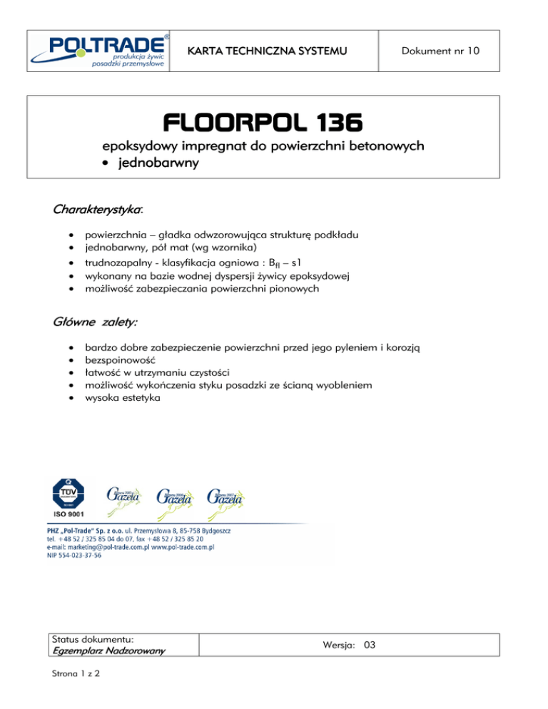 KARTA TECHNICZNA SYSTEMU Dokument nr 10 FLOORPOL 136 epoksydowy impregnat do powierzchni betonowych • jednobarwny Charakterystyka: • • powierzchnia – gładka odwzorowująca strukturę podkładu jednobarwny, pół mat (wg wzornika) • • • trudnozapalny - klasyfikacja ogniowa : Bfl – s1 wykonany na bazie wodnej dyspersji żywicy epoksydowej możliwość zabezpieczania powierzchni pionowych Główne zalety: • • • • • bardzo dobre zabezpieczenie powierzchni przed jego pyleniem i korozją bezspoinowość łatwość w utrzymaniu czystości możliwość wykończenia styku posadzki ze ścianą wyobleniem wysoka estetyka Status dokumentu: Egzemplarz Nadzorowany Strona 1 z 2 Wersja: 03 FLOORPOL 136 epoksydowy impregnat do powierzchni betonowych Zastosowanie: Impregnat przeznaczony dla podłoży narażonych na trudne warunki eksploatacji: • Obciążenia III grupy − Obciążenia I grupy- ciężkie- występują tam , gdzie odbywa się transport pojazdów na kołach ogumionych o nacisku na oś ponad 50 kN, pojazdów o kołach twardych o nacisku na oś powyżej 6 kN, intensywny ruch pieszy − Obciążenia II grupy- średnie- występują tam , gdzie odbywa się transport pojazdów na kołach ogumionych o nacisku na oś od 20 kN do 50 kN, pojazdów o kołach twardych o nacisku na oś do 6 kN, intensywny ruch pieszy − Obciążenia III grupy- lekkie- występują tam , gdzie odbywa się transport pojazdów na kołach ogumionych o nacisku na oś nie przekraczającym 20 kN oraz ruch pieszy o niewielkim nasileniu o o • • Temperatura eksploatacji – 50 C - +70 C Obciążenia chemiczne wg karty nr 21 Typ obiektów Hale przemysłowe, pomieszczenia produkcyjne i magazynowe, pomieszczenia techniczne, gospodarcze i socjalne o obciążeniach odpowiadających w/w parametrom. Wymagania dla podkładu Konstrukcja podkładu powinna być wystarczająco nośna, wytrzymałość na ściskanie powinna wynosić min. 25 MPa , a minimalna wytrzymałość na zrywanie - 1,5 N/mm2. Dopuszczalna wilgotność wagowa podkładu – 4%. Wymagania dla podkładu betonowego – karta nr 16. mieszadła elektrycznego (czas mieszania ca’ 3 minuty). UWAGA: Składnik B powinien być mieszany tak długo aż osiągnie jednolity biały kolor. Układanie materiału : Prawidłowo przygotowany materiał należy równomiernie rozprowadzić na zagruntowanej powierzchni przy użyciu wałka nylonowego. Pozostawić do utwardzenia na ok. 24 godziny UWAGA: W przypadku materiałów UWAGA bezwzględnie przestrzegać: − zachowania proporcji składników A i B − dokładnego mieszania składników epoksydowych należy − czasu pracy na gotowej mieszance. W temperaturze +20 oC wynosi 20-30 min. Tabela zużyć: kg/m GRUNTOWANIE • PT 130 A – 6 (2:1) WARSTWA WIERZCHNIA WIERZCHNIA • PT 130 A – 6 (2:1) 2 0,30 0,15 Zalecenia dla użytkowników • Eksploatacja – Impregnat można obciążać po okresie : - ruch pieszy – około 24 godzin w temperaturze 20 C - obciążenie mechaniczne – około 48 godz. w temperaturze 20 C - pełne utwardzenie – 7 dni • Czyszczenie – W celu utrzymania estetycznego wyglądu posadzki należy usuwać wszelkie wycieki, zachlapania ,itp. natychmiast po ich powstaniu. Posadzka musi być regularnie myta za pomocą myjki mechanicznej, odkurzacza, itp. Należy używać odpowiednich detergentów max. pH 11. UWAGA: UWAGA Renowację uszkodzonych fragmentów powierzchni powinien przeprowadzać autoryzowany wykonawca. o o Przygotowanie podkładu Powierzchnie przeznaczone pod posadzki epoksydowe muszą być suche (wilgotność max 4%) oraz chłonne. Podkład musi być uszorstniony, pozbawiony luźnych i osypujących się części oraz zatłuszczeń, a także resztek starych powłok. Wszelkiego rodzaju zabrudzenia, względnie warstwy krzemianowe należy usunąć stosując szlifowanie, frezowanie lub śrutowanie. Przed zagruntowaniem podkład musi być dokładnie odkurzony. Warunki wykonywania posadzki • Temperatura – min. 15 oC przy podkładzie • Wilgotność podkładu – max 4% wagowo • Wilgotność powietrza – max 75% Instrukcja wykonania Żywice epoksydowe występują w postaci dwóch komponentów A - żywica, B – utwardzacz. Do sporządzenia gotowego materiału należy przygotować składniki A i B w odpowiednich proporcjach. Gruntowanie • PT 130 A – 6 ( 2 : 1 ) - dwukomponentowa, kolorowa, bezrozpuszczalnikowa wodna dyspersja żywicy epoksydowej (zużycie zależy od chłonności podłoża ) Przygotowanie materiału : Rozmieszać osobno składnik A i osobno składnik B, połączyć składniki A i B, wymieszać składniki za pomocą mieszadła elektrycznego (czas mieszania ca’ 3 minuty). UWAGA: Składnik B powinien być mieszany tak długo aż osiągnie jednolity biały kolor. Układanie materiału : Prawidłowo przygotowany materiał należy rozprowadzić na podkładzie przy użyciu wałka nylonowego. W przypadku podłoży o dużej chłonności gruntowanie należy powtórzyć. Pozostawić do utwardzenia na 15 - 24 godzin. Warstwa wierzchnia • PT 130 A – 6 ( 2 : 1 ) dwukomponentowa kolorowa, bezrozpuszczalnikowa wodna dyspersja żywicy epoksydowej Przygotowanie materiału : Rozmieszać osobno składnik A i osobno składnik B, połączyć składniki A i B, wymieszać składniki za pomocą Strona 2 z 2 Warunki BHP W czasie aplikacji używać ubrań ochronnych (rękawic, okularów). Przed aplikacją ręce należy posmarować kremem ochronnym. Bezpośredni kontakt ze skórą może prowadzić do powstawania podrażnień i zaczerwienień. W razie kontaktu produktu z oczami należy natychmiast przemyć oczy dużą ilością czystej, ciepłej wody, a następnie skorzystać z porady lekarza. Powyższe informacje o systemie FLOORPOL 136 zostały zestawione wg najnowszego stanu wiedzy. Ze względu na brak kontroli nad sposobem zastosowań materiałów wchodzących w skład systemu, POL-TRADE Sp. z o.o. zastrzega, iż z treści niniejszej karty nie wynika żadna odpowiedzialnoś