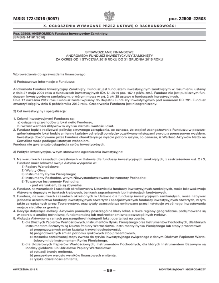 MSIG 172/2016 (5057) poz. 22508–22508 X . O G Ł O S Z E N I A W Y M A G A N E P R Z E Z U S TAW Ę O R A C H U N K O W O Ś C I Poz. 22508. ANDROMEDA Fundusz Inwestycyjny Zamknięty. [BMSiG-14161/2016] SPRAWOZDANIE FINANSOWE ANDROMEDA FUNDUSZ INWESTYCYJNY ZAMKNIĘTY ZA OKRES OD 1 STYCZNIA 2015 ROKU DO 31 GRUDNIA 2015 ROKU Wprowadzenie do sprawozdania finansowego 1) Podstawowe informacje o Funduszu: Andromeda Fundusz Inwestycyjny Zamknięty. Fundusz jest funduszem inwestycyjnym zamkniętym w rozumieniu ustawy z dnia 27 maja 2004 roku o funduszach inwestycyjnych (Dz. U. 2014 poz. 157 z późn. zm.). Fundusz nie jest publicznym funduszem inwestycyjnym zamkniętym, o którym mowa w art. 2 pkt 39 ustawy o funduszach inwestycyjnych. Dnia 17 września 2012 roku Fundusz został wpisany do Rejestru Funduszy Inwestycyjnych pod numerem RFI 791. Fundusz otworzył księgi w dniu 5 października 2012 roku. Czas trwania Funduszu jest nieograniczony. 2) Cel inwestycyjny i specjalizacja: 1. Celami inwestycyjnymi Funduszu są: a) osiąganie przychodów z lokat netto Funduszu, b) wzrost wartości Aktywów w wyniku wzrostu wartości lokat. 2. Fundusz będzie realizował politykę aktywnego zarządzania, co oznacza, że stopień zaangażowania Funduszu w poszczególne kategorie lokat będzie zmienny i zależny od relacji pomiędzy oczekiwanymi stopami zwrotu a ponoszonym ryzykiem. Inwestycje dokonywane przez Fundusz charakteryzuje wysoki poziom ryzyka, co oznacza, iż Wartość Aktywów Netto na Certyfikat może podlegać istotnym wahaniom. Fundusz nie gwarantuje osiągnięcia celów inwestycyjnych. 3) Polityka Inwestycyjna, w tym stosowane ograniczenia inwestycyjne: 1. Na warunkach i zasadach określonych w Ustawie dla funduszy inwestycyjnych zamkniętych, z zastrzeżeniem ust. 2 i 3, Fundusz może lokować swoje Aktywa wyłącznie w: 1) Papiery Wartościowe; 2) Waluty Obce; 3) Instrumenty Rynku Pieniężnego; 4) Instrumenty Pochodne, w tym Niewystandaryzowane Instrumenty Pochodne; 5) Towarowe Instrumenty Pochodne; - pod warunkiem, że są zbywalne. 2. Fundusz, na warunkach i zasadach określonych w Ustawie dla funduszy inwestycyjnych zamkniętych, może lokować swoje Aktywa w depozyty w bankach krajowych, bankach zagranicznych lub instytucjach kredytowych. 3. Fundusz, na warunkach i zasadach określonych w Ustawie dla funduszy inwestycyjnych zamkniętych, może nabywać jednostki uczestnictwa funduszy inwestycyjnych otwartych i specjalistycznych funduszy inwestycyjnych otwartych, w tym także zarządzanych przez Towarzystwo, oraz tytuły uczestnictwa emitowane przez instytucje wspólnego inwestowania mające siedzibę za granicą. 4. Decyzje dotyczące alokacji Aktywów pomiędzy poszczególne klasy lokat, a także regiony geograficzne, podejmowane są w oparciu o analizę techniczną, fundamentalną lub makroekonomiczną poszczególnych rynków. 5. Alokacja Aktywów w ramach poszczególnych kategorii lokat oparta jest na ocenie: 1) dla Dłużnych Papierów Wartościowych, Instrumentów Rynku Pieniężnego oraz Instrumentów Pochodnych, dla których Instrumentem Bazowym są Dłużne Papiery Wartościowe, Instrumenty Rynku Pieniężnego lub stopy procentowe: a) prognozowanych zmian kształtu krzywej dochodowości, b) prognozowanych zmian poziomu rynkowych stóp procentowych, c) stosunku oczekiwanej stopy zwrotu do ryzyka inwestycyjnego związanego z danym Dłużnym Papierem Wartościowym lub Instrumentem Rynku Pieniężnego. 2) dla Udziałowych Papierów Wartościowych, Instrumentów Pochodnych, dla których Instrumentem Bazowym są indeksy giełdowe lub Udziałowe Papiery Wartościowe: a) sytuacji branży emitenta, b) perspektyw wzrostu wyników finansowych emitenta, c) ryzyka działalności emitenta, 6 WRZEŚNIA 2016 R. – 59 – MONITOR SĄDOWY I GOSPODARCZY MSIG 172/2016 (5057) poz. 22508–22508 X . O G Ł O S Z E N I A W Y M A G A N E P R Z E Z U S TAW Ę O R A C H U N K O W O Ś C I d) relacji oczekiwanej stopy zwrotu do ponoszonego ryzyka. 3) dla Towarowych Instrumentów Pochodnych: a) sytuacji makroekonomicznej - prognozowanego wzrostu gospodarczego, stopy inflacji, podaży pieniądza, kursów walutowych oraz innych istotnych zmiennych mających wpływ na kształtowanie się cen towarów, b) sytuację fundamentalną danego towaru, surowca, produktu rolnego, nośnika energii lub powiązanej z nimi branży - bilansu popytu i podaży, handlu międzynarodowego, istnienie substytutów, elastyczność popytu na dany towar, c) sytuację fundamentalną poszczególnych instrumentów finansowych i określenie stopnia ich korelacji z danym towarem/surowcem. 4) dla Walut Obcych: a) bilansu płatniczego kraju, w którym Waluta Obca stanowi środek płatniczy, b) finansów publicznych kraju, w którym Waluta Obca stanowi środek płatniczy, c) prognozowanych zmian poziomu rynkowych stóp procentowych w kraju, w którym Waluta Obca stanowi środek płatniczy. 5) dla Instrumentów Pochodnych, dla których Instrumentem Bazowym są Waluty Obce: a) bilansu płatniczego kraju, w którym Waluta Obca stanowi środek płatniczy, b) finansów publicznych kraju, w którym Waluta Obca stanowi środek płatniczy, c) prognozowanych zmian poziomu rynkowych stóp procentowych w kraju, w którym Waluta Obca stanowi środek płatniczy. 6) dla jednostek uczestnictwa funduszy inwestycyjnych otwartych mających siedzibę na terytorium Rzeczypospolitej Polskiej, certyfikatów inwestycyjnych funduszy inwestycyjnych zamkniętych mających siedzibę na terytorium Rzeczypospolitej Polskiej, tytułów uczestnictwa emitowanych przez fundusze zagraniczne oraz tytułów uczestnictwa emitowanych przez instytucje wspólnego inwestowania mające siedzibę za granicą: a) oczekiwanych stóp zwrotu tych funduszy inwestycyjnych otwartych, funduszy inwestycyjnych zamkniętych, funduszy zagranicznych lub instytucji wspólnego inwestowania mających siedzibę za granicą (w oparciu o przewidywane zachowanie klas aktywów, na które te fundusze i