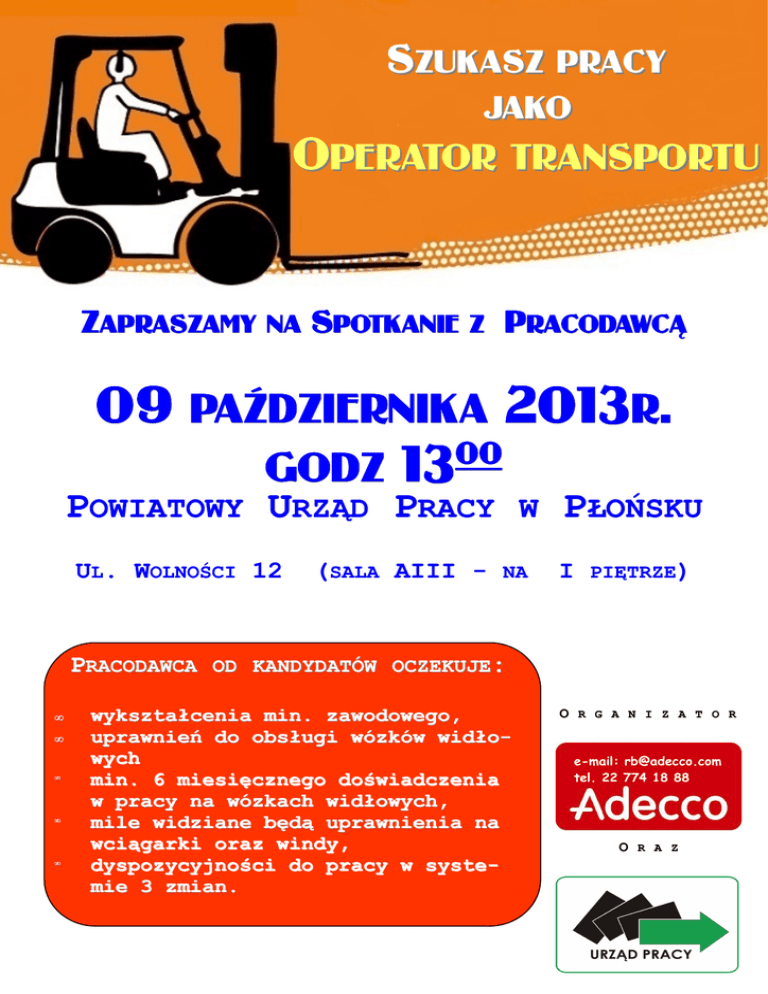 SZUKASZPRACY JAKO OPERATORTRANSPORTU ZAPRASZAMYNASPOTKANIEZ PRACODAWCĄ P 09PAŹDZIERNIKA2013R. 00 00 GODZ13 POWIATOWY URZĄD PRACY UL. WOLNOŚCI 12 PRACODAWCA • • • • • (SALA AIII - W NA PŁOŃSKU I PIĘTRZE) OD KANDYDATÓW OCZEKUJE: wykształcenia min. zawodowego, uprawnień do obsługi wózków widłowych min. 6 miesięcznego doświadczenia w pracy na wózkach widłowych, mile widziane będą uprawnienia na wciągarki oraz windy, dyspozycyjności do pracy w systemie 3 zmian. O R G A N I Z A T O R e-mail: [email protected] tel. 22 774 18 88 O R A Z