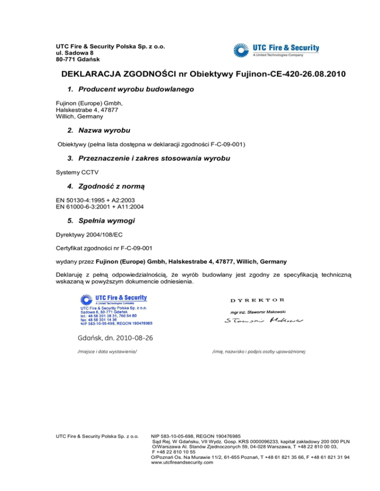 UTC Fire & Security Polska Sp. z o.o. ul. Sadowa 8 80-771 Gdańsk DEKLARACJA ZGODNOŚCI nr Obiektywy Fujinon-CE-420-26.08.2010 1. Producent wyrobu budowlanego Fujinon (Europe) Gmbh, Halskestrabe 4, 47877 Willich, Germany 2. Nazwa wyrobu Obiektywy (pełna lista dostępna w deklaracji zgodności F-C-09-001) 3. Przeznaczenie i zakres stosowania wyrobu Systemy CCTV 4. Zgodność z normą EN 50130-4:1995 + A2:2003 EN 61000-6-3:2001 + A11:2004 5. Spełnia wymogi Dyrektywy 2004/108/EC Certyfikat zgodności nr F-C-09-001 wydany przez Fujinon (Europe) Gmbh, Halskestrabe 4, 47877, Willich, Germany Deklaruję z pełną odpowiedzialnością, że wyrób budowlany jest zgodny ze specyfikacją techniczną wskazaną w powyższym dokumencie odniesienia. Gdańsk, dn. 2010-08-26 /miejsce i data wystawienia/ UTC Fire & Security Polska Sp. z o.o. /imię, nazwisko i podpis osoby upoważnionej NIP 583-10-05-698, REGON 190476985 Sąd Rej. W Gdańsku, VII Wydz. Gosp. KRS 0000096233, kapitał zakładowy 200 000 PLN O/Warszawa Al. Stanów Zjednoczonych 59, 04-028 Warszawa, T +48 22 810 00 03, F +48 22 810 10 55 O/Poznań Os. Na Murawie 11/2, 61-655 Poznań, T +48 61 821 35 66, F +48 61 821 31 94 www.utcfireandsecurity.com