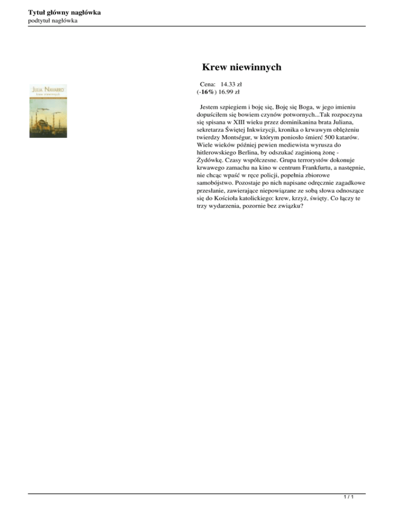 Tytuł główny nagłówka podtytuł nagłówka Krew niewinnych Cena: 14.33 zł (-16%) 16.99 zł Jestem szpiegiem i boję się, Boję się Boga, w jego imieniu dopuściłem się bowiem czynów potwornych...Tak rozpoczyna się spisana w XIII wieku przez dominikanina brata Juliana, sekretarza Świętej Inkwizycji, kronika o krwawym oblężeniu twierdzy Montségur, w którym poniosło śmierć 500 katarów. Wiele wieków później pewien mediewista wyrusza do hitlerowskiego Berlina, by odszukać zaginioną żonę Żydówkę. Czasy współczesne. Grupa terrorystów dokonuje krwawego zamachu na kino w centrum Frankfurtu, a następnie, nie chcąc wpaść w ręce policji, popełnia zbiorowe samobójstwo. Pozostaje po nich napisane odręcznie zagadkowe przesłanie, zawierające niepowiązane ze sobą słowa odnoszące się do Kościoła katolickiego: krew, krzyż, święty. Co łączy te trzy wydarzenia, pozornie bez związku? 1/1 Powered by TCPDF (www.tcpdf.org)