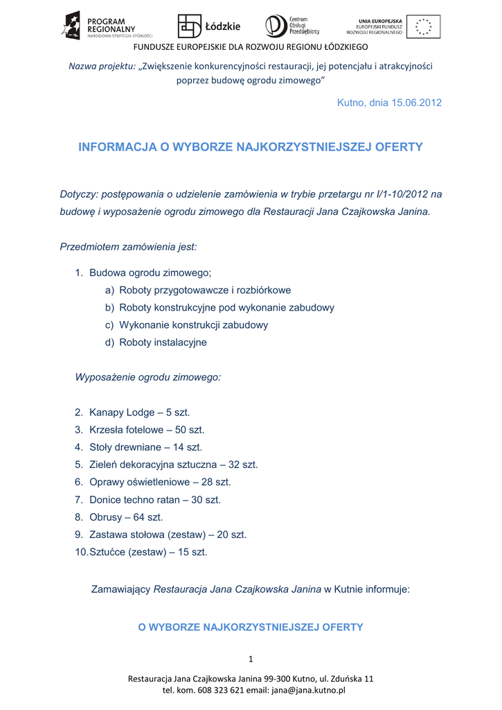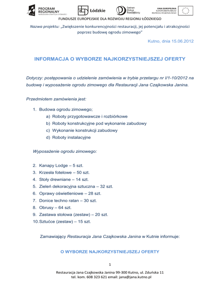 FUNDUSZE EUROPEJSKIE DLA ROZWOJU REGIONU ŁÓDZKIEGO Nazwa projektu: „Zwiększenie konkurencyjności restauracji, jej potencjału i atrakcyjności poprzez budowę ogrodu zimowego” Kutno, dnia 15.06.2012 INFORMACJA O WYBORZE NAJKORZYSTNIEJSZEJ OFERTY Dotyczy: postępowania o udzielenie zamówienia w trybie przetargu nr I/1-10/2012 na budowę i wyposażenie ogrodu zimowego dla Restauracji Jana Czajkowska Janina. Przedmiotem zamówienia jest: 1. Budowa ogrodu zimowego; a) Roboty przygotowawcze i rozbiórkowe b) Roboty konstrukcyjne pod wykonanie zabudowy c) Wykonanie konstrukcji zabudowy d) Roboty instalacyjne Wyposażenie ogrodu zimowego: 2. Kanapy Lodge – 5 szt. 3. Krzesła fotelowe – 50 szt. 4. Stoły drewniane – 14 szt. 5. Zieleń dekoracyjna sztuczna – 32 szt. 6. Oprawy oświetleniowe – 28 szt. 7. Donice techno ratan – 30 szt. 8. Obrusy – 64 szt. 9. Zastawa stołowa (zestaw) – 20 szt. 10. Sztućce (zestaw) – 15 szt. Zamawiający Restauracja Jana Czajkowska Janina w Kutnie informuje: O WYBORZE NAJKORZYSTNIEJSZEJ OFERTY 1 Restauracja Jana Czajkowska Janina 99-300 Kutno, ul. Zduńska 11 tel. kom. 608 323 621 email: [email protected] FUNDUSZE EUROPEJSKIE DLA ROZWOJU REGIONU ŁÓDZKIEGO Oferta z ceną 529 789,33 PLN brutto (430 725,03 PLN netto), którą złożyła firma Ellegance Sp. z o.o., 18-400 Łomża, ul. Rzemieślnicza 9A. Oferta uzyskała 124,23 pkt. Uzasadnienie: W postępowaniu o udzielenie zamówienia w trybie przetargu wpłynęła jedna oferta została złożona przez Wykonawcę firmę Ellegance Sp. z o.o. 18-400 Łomża, ul. Rzemieślnicza 9A z ceną brutto 529 789,33 złotych. Zgodnie z treścią zamówienia w trybie przetargu nr I/1-10/2012, rozdział VII. Warunki udziału w postępowaniu oraz opis sposobu dokonywania oceny spełnienia tych warunków, pkt 6 - Przetarg odbędzie się również w przypadku, gdyby wpłynęła tylko jedna oferta spełniająca warunki określone w ogłoszeniu o zamówieniu oraz opisie przedmiotu zamówienia. Ponieważ Wykonawca spełnia warunki udziału w postępowaniu o udzielenie zamówienia w trybie przetargu, a jego oferta jest ważna, podlegała ocenie według kryteriów postępowania przetargowego: cena przy znaczeniu - 60%, parametry techniczne - 40%. Zasada ta dotyczy budowy ogrodu zimowego i wyposażenia. Wykonawca uzyskał 100 punktów rozliczeniowych w części budowa ogrodu zimowego i 100 punktów w części wyposażenie. Zgodnie z treścią zamówienia do sumarycznej ilości punktów rozliczeniowych dotyczącej budowy ogrodu zimowego dodanych będzie 24,23% punktów rozliczeniowych przyznanych w części dotyczącej wyposażenia. Ogólna najwyższa ilość punktów rozliczeniowych (budowa ogrodu + wyposażenie) wyniosła 124,23 punkty i jest ofertą najkorzystniejszą. Kierownik Zamawiającego Janina Czajkowska 2 Restauracja Jana Czajkowska Janina 99-300 Kutno, ul. Zduńska 11 tel. kom. 608 323 621 email: [email protected] FUNDUSZE EUROPEJSKIE DLA ROZWOJU REGIONU ŁÓDZKIEGO 3 Restauracja Jana Czajkowska Janina 99-300 Kutno, ul. Zduńska 11 tel. kom. 608 323 621 email: [email protected]