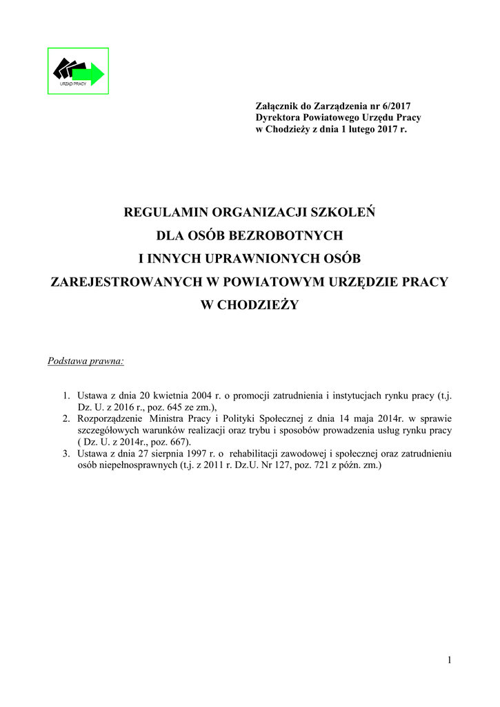 Załącznik do Zarządzenia nr 6/2017 Dyrektora Powiatowego Urzędu Pracy w Chodzieży z dnia 1 lutego 2017 r. REGULAMIN ORGANIZACJI SZKOLEŃ DLA OSÓB BEZROBOTNYCH I INNYCH UPRAWNIONYCH OSÓB ZAREJESTROWANYCH W POWIATOWYM URZĘDZIE PRACY W CHODZIEŻY Podstawa prawna: 1. Ustawa z dnia 20 kwietnia 2004 r. o promocji zatrudnienia i instytucjach rynku pracy (t.j. Dz. U. z 2016 r., poz. 645 ze zm.), 2. Rozporządzenie Ministra Pracy i Polityki Społecznej z dnia 14 maja 2014r. w sprawie szczegółowych warunków realizacji oraz trybu i sposobów prowadzenia usług rynku pracy ( Dz. U. z 2014r., poz. 667). 3. Ustawa z dnia 27 sierpnia 1997 r. o rehabilitacji zawodowej i społecznej oraz zatrudnieniu osób niepełnosprawnych (t.j. z 2011 r. Dz.U. Nr 127, poz. 721 z późn. zm.) 1 ROZDZIAŁ I POSTANOWIENIA OGÓLNE §1 Niniejszy Regulamin normuje procedurę postępowania związaną z organizacją szkoleń prowadzonych przez Powiatowy Urząd Pracy w Chodzieży. §2 Ilekroć w Regulaminie jest mowa o: 1. Staroście – należy przez to rozumieć Starostę Chodzieskiego; 2. PUP Chodzież – oznacza to Powiatowy Urząd Pracy w Chodzieży. 3. Dyrektorze – oznacza to Dyrektora Powiatowego Urzędu Pracy w Chodzieży, działającego w imieniu i z upoważnienia starosty. 4. ustawie – należy przez to rozumieć ustawę o promocji zatrudnienia i instytucjach rynku pracy z dnia 20 kwietnia 2004 r. (Dz.U. z 2016 r., poz. 645 ze zm.). 5. szkoleniu indywidualnym – należy przez to rozumieć szkolenie wskazane przez wnioskodawcę, realizowane zgodnie z ar. 40 ust. 3 ustawy. 6. przeciętnym wynagrodzeniu – oznacza to przeciętne wynagrodzenie w poprzednim kwartale, ogłoszone przez Prezesa Głównego Urzędu Statystycznego w Dzienniku Urzędowym RP „Monitor Polski”, na podstawie art. 20 pkt. 2 ustawy z dnia 17 grudnia 1998 r. o emeryturach i rentach z Funduszu Ubezpieczeń Społecznych (Dz. U. z 2013 r. poz. 1440 z późn. zm.). 7. Pracodawcy – oznacza to jednostkę organizacyjną, chociażby nie posiadała osobowości prawnej, a także osoba fizyczna, jeżeli zatrudnia, co najmniej jednego pracownika. Pracodawcą nie jest osoba prowadząca działalność gospodarczą niezatrudniająca żadnego pracownika. 8. Instytucji Szkoleniowej – oznacza to instytucję oferującą szkolenia dla bezrobotnych i poszukujących pracy, która może uzyskać zlecenie finansowane ze środków publicznych na prowadzenie tych szkoleń po wpisie do rejestru instytucji szkoleniowych prowadzonego przez wojewódzki urząd pracy właściwy ze względu na siedzibę instytucji szkoleniowej. §3 1. Powiatowy Urząd Pracy w Chodzieży inicjuje, organizuje i finansuje w ramach limitu środków szkolenia dla: a) osób bezrobotnych, zakwalifikowanych do II profilu pomocy, a w uzasadnionych przypadkach również do I profilu pomocy, b) osób poszukujących pracy, które: 2 są w okresie wypowiedzenia stosunku pracy lub stosunku służbowego z przyczyn dotyczących zakładu pracy, są zatrudnione u pracodawcy, wobec którego ogłoszono upadłość lub który jest w stanie likwidacji, z wyłączeniem likwidacji w celu prywatyzacji, otrzymują świadczenie socjalne przysługujące na urlopie górniczym lub górniczy zasiłek socjalny, określone w odrębnych przepisach, uczestniczą w zajęciach w centrum integracji społecznej lub indywidualnym programie integracji, o którym mowa w przepisach o pomocy społecznej, są żołnierzami rezerwy, pobierają rentę szkoleniową, pobierają świadczenie szkoleniowe przyznane przez pracodawcę na wniosek pracownika, przysługujące po rozwiązaniu stosunku pracy lub stosunku służbowego na czas udziału pracownika w szkoleniach, w okresie nie dłuższym niż 6 miesięcy, podlegają ubezpieczeniu społecznemu rolników w pełnym zakresie na podstawie przepisów o ubezpieczeniu społecznym rolników jako domownik lub małżonek rolnika, jeżeli zamierza podjąć zatrudnienie, inną pracę zarobkową lub działalność gospodarczą poza rolnictwem, będących cudzoziemcem, o którym mowa w art. 1 ust. 3 pkt. 2 lit. h oraz lit. ha, z zastrzeżeniem art. 1 ust. 6. c) pracowników oraz osób wykonujących inną pracę zarobkową lub działalność gospodarczą w wieku 45 lat i powyżej. 2. Przy rozpatrywaniu wniosków na szkolenia indywidualne oraz kart kandydatów na szkolenie preferowane będą osoby, które: a) w okresie 12 miesięcy poprzedzających złożenie wniosku nie odmówiły bez uzasadnionej przyczyny przyjęcia propozycji odpowiedniej pracy, innej pracy zarobkowej, szkolenia, stażu, skierowania do prac interwencyjnych i robót publicznych. 3. Celem szkolenia jest podniesienie kwalifikacji zawodowych i innych kwalifikacji zwiększających szansę na podjęcie lub utrzymanie zatrudnienia, innej pracy zarobkowej lub działalności gospodarczej, w szczególności w przypadku: a) braku kwalifikacji zawodowych, b) konieczności zmiany lub uzupełnienia kwalifikacji, c) utraty zdolności do wykonywania pracy w dotychczasowym wykonywanym zawodzie, d) braku umiejętności aktywnego poszukiwania pracy. 3 4. W przypadku zawodów wymagających szczególnych predyspozycji psychofizycznych, skierowanie na szkolenie będzie poprzedzone określeniem przez doradcę zawodowego predyspozycji do wykonywania zawodu a w uzasadnionych przypadkach szkolenie będzie poprzedzone skierowaniem na badania lekarskie lub psychologiczne. 5. W przypadku, gdy szkolenie wymaga posiadania aktualnego orzeczenia lekarskiego o braku przeciwwskazań zdrowotnych do udziału w szkoleniu, osoba bezrobotna zostanie skierowana na takie badania. 6. Pomoc dla osób uprawnionych realizowana na podstawie niniejszych zasad musi zostać poprzedzona ustaleniem profilu pomocy. Potrzeba udzielenia konkretnej pomocy musi wynikać z założeń Indywidualnego Planu Działania IPD dla danej osoby uprawnionej. §4 1. Szkolenia organizowane są w formie kursu, realizowanego według planu nauczania obejmującego przeciętnie nie mniej niż