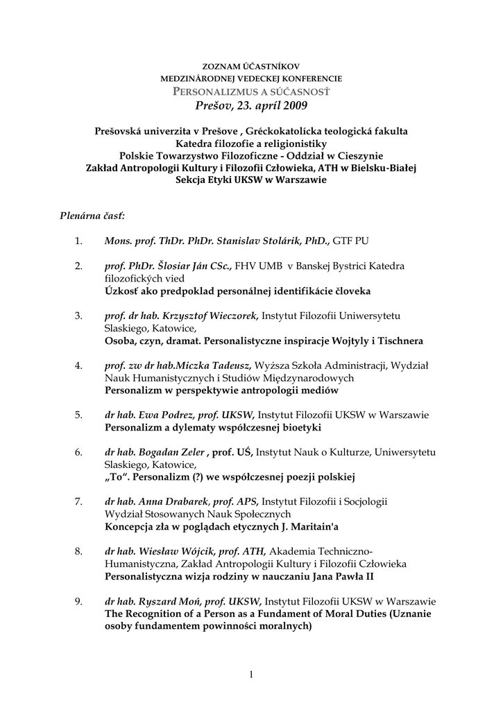 ZOZNAM ÚČASTNÍKOV MEDZINÁRODNEJ VEDECKEJ KONFERENCIE PERSONALIZMUS A SÚČASNOSŤ Prešov, 23. apríl 2009 Preńovská univerzita v Preńove , Gréckokatolícka teologická fakulta Katedra filozofie a religionistiky Polskie Towarzystwo Filozoficzne - Oddział w Cieszynie Zakład Antropologii Kultury i Filozofii Człowieka, ATH w Bielsku-Białej Sekcja Etyki UKSW w Warszawie Plenárna časť: 1. Mons. prof. ThDr. PhDr. Stanislav Stolárik, PhD., GTF PU 2. prof. PhDr. Šlosiar Ján CSc., FHV UMB v Banskej Bystrici Katedra filozofických vied Úzkosť ako predpoklad personálnej identifikácie človeka 3. prof. dr hab. Krzysztof Wieczorek, Instytut Filozofii Uniwersytetu Slaskiego, Katowice, Osoba, czyn, dramat. Personalistyczne inspiracje Wojtyly i Tischnera 4. prof. zw dr hab.Miczka Tadeusz, Wyższa Szkoła Administracji, Wydział Nauk Humanistycznych i Studiów Międzynarodowych Personalizm w perspektywie antropologii mediów 5. dr hab. Ewa Podrez, prof. UKSW, Instytut Filozofii UKSW w Warszawie Personalizm a dylematy współczesnej bioetyki 6. dr hab. Bogadan Zeler , prof. UŚ, Instytut Nauk o Kulturze, Uniwersytetu Slaskiego, Katowice, „To“. Personalizm (?) we współczesnej poezji polskiej 7. dr hab. Anna Drabarek, prof. APS, Instytut Filozofii i Socjologii Wydział Stosowanych Nauk Społecznych Koncepcja zła w poglądach etycznych J. Maritain'a 8. dr hab. Wiesław Wójcik, prof. ATH, Akademia TechnicznoHumanistyczna, Zakład Antropologii Kultury i Filozofii Człowieka Personalistyczna wizja rodziny w nauczaniu Jana Pawła II 9. dr hab. Ryszard Moń, prof. UKSW, Instytut Filozofii UKSW w Warszawie The Recognition of a Person as a Fundament of Moral Duties (Uznanie osoby fundamentem powinności moralnych) 1 10. dr hab. Artur Andrzejuk, prof. UKSW Jaki personalizm? Szerokie i wąskie rozumienie personalizmu 11. dr hab. Michał Drożdż, prof. PWSZ, Papieska Akdemia Teologiczna w Krakowie, Wydział Nauk Społecznych, Katedra Mediów i Komunikacji Społecznej Komunikowanie medialne jako manifestacja osoby 1. Sekcia: Moderátor: dr hab. Ryszard Moń, prof. UKSW i doc. Andrej Slodička, PhD. 12. dr Stanisław Cader, Akademia Techniczno-Humanistyczna w Bielsku – Białej Indywidualność człowieka a kultura popularna 13. Doc. Dr. Roman Králik, ThD., Ing. Tibor Máhrik, FF UKF NITRA. KVAE Ja a Ty (Kierkegaardov koncept blýžneho) 14. dr Izabella Andrzejuk, UKSW Osoba i relacje osobowe w tomizmie konsekwentnym 15. Ondrej Štefaňak, PhDr., PhD., Pedagogická fakulta Katolíckej univerzity v Ružomberku Bonum Comunae v chápaní predstaviteľov personalizmu lublinskej filozofickej ńkoly 16. dr Agnieszka Lenartowicz,, Wyższa Szkoła Humanistyczno – Ekonomiczna w Łodzi, Wydział Kulturoznawstwa Pośredniość w filozofii ks. Józefa Tischnera 17. Peter Grečo, Antipersonálnost demokracie ako formy vlády vo filozofii Nikolaja Berďajeva 18. dr Dariusz Juruś, Uniwersytet Śląski, WEiNoE, Ciszyn Personalizm ekonomiczny 19. dr Beata Szluz, Uniwersytet Rzeszowski Instytut Pedagogiki Godność osoby podstawą działań we współczesnej pomocy społecznej 20. dr Sławomira Ruchała, Uniwersytet Śląski w Katowicach, Wydział Etnologii i Nauk o Edukacji w Cieszynie, Rola personalizmu we współczesnej dyskusji nad prawami człowieka 21. dr Bogdan Więckiewicz, Katolicki Uniwersytet Lubelski Wydział Kultura rozwojem osobowym człowieka 2 2. Sekcia: Moderátor: dr Marek Rembierz i doc. PhDr. Pavol Dancák, PhD 22. dr Marek Rembierz, Instytut Nauk o Edukacji, Uniwersytet Śląski, Katowice-Cieszyn, Personalizm i metafilozofia. Odkrywanie osoby filozofa 23. dr Aleksy Kowalski, Instytut Teologiczny w Częstochowie, WSD w Częstochowie Personalizm w „Stromatach“ Klemensa Aleksandryjskiego 24. Peter Fotta OP, Ing., PhDr., PhD., Trnavská univerzita (Filozofická Fakulta, Katedra politológie) Substanciálnosť osoby a jej súčasné znehodnotenia 25. dr Andrzej Kobyliński, Instytut Filozofii UKSW w Warszawie The phenomenological-axiological Personalism of Max Scheler (Personalizm fenomenologiczno-aksjologiczny Maxa Schelera) 26. Jozef Dronzek. Mgr. PhDr., Katedra filozofie TF – Košice Wojtylovské chápanie ja-ty a my 27. Mgr. Tomáš Gerbery, UPJŠ Košice Metafyzika konca metafyziky (niekoľko poznámok k súčasnej potrebe transcendencie) 28. dr Różańska Aniela, Zakład Pedagogiki Ogólnej, Instytut Nauk o Edukacji, Wydział Etnologii i Nauk o Edukacji w Cieszynie, Uniwersytet Śląski Wdzięczność jako wartość w kontekście wychowania personalistycznego 29. dr Lucjan Wroński, Uniwersytet Śląski, Wydział Etnologii i Nauk o Edukacji w Cieszynie, Szacunek dla osoby a posłuszeństwo władzy 3. Sekcia: Moderátor: prof. dr hab. Krzysztof Wieczorek i PhDr. Dušan Hruška 30. PhDr. Dušan Hruška, GTF PU Prešov 31. Szaniszló Inocent-Mária V., Doc., ThDr., Ing., PhD., Teologická fakulta Katolíckej univerzity Ružomberok v Košiciach Osoba a osobnosť zoči-voči teórii druhizmu 32. dr Adam Świeżyński, Instytut Filozofii UKSW, Warszawa Personalistyczne uwarunkowania semejotycznej koncepcji cudu 33. Dr. Jan Visnovsky, FMK UCM v Trnave 34. dr Dariusz Rymar, Instytut Sztuki; Katedra Teorii Sztuki 3 Doświadczenie religijne, jako apsekt etycznego samopoznania 35. Róbert Sarka, Thdr. PaedDr. Phd., Katolícka univerzita Ružomberok Personalizmus pred súčasnými kultúrnymi výzvami 36. dr Stanisław Ciupka, Zakład Antropologii Kultury i Filozofii, ATH Bielsko- Biała Główne tematy pedagogiki personalistyczne 37. dr Klajmon-Lech Urszula, Instytut Nauk o Edukacji, Katedra Pedagogiki Ogólnej Polska pedagogika inspirowana chrześcijaństwem wobec współczesnych idei edukacyjnych 38. dr Mirosław Rewera, Katolicki Uniwersytet Lubelski Od autorytetu instytucjonalnego do autorytetu osobowego: w kierunku personalistycznej koncepcji autorytetu 39. dr hab. Piotr Mazur, ul. Górna 6, 22-400 Zamość Personalistyczne podstawy edukacji według Jana Pawła II. 4. Sekcia: Mod