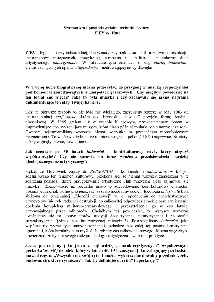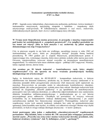 Szamanizm i postindustrialne techniki ekstazy. Z’EV vs. Hati Z’EV – legenda sceny industrialnej, charyzmatyczny perkusista, performer, twórca instalacji i instrumentów muzycznych, muzykolog, terapeuta i kabalista – niepokorny duch artystycznego undergroundu. W kilkudziesięciu zdaniach o surf music, industrialu, elektroakustycznych operach, Sefer Jecira i uzdrawiającej mocy dźwięku. W Twojej nocie biograficznej można przeczytać, że przygodę z muzyką rozpoczynałeś pod koniec lat sześćdziesiątych w „zespołach garażowych”. Czy mógłbyś powiedzieć na ten temat coś więcej? Jaka to była muzyka i czy zachowały się jakieś nagrania dokumentujące ten etap Twojej kariery? Cóż, te pierwsze zespoły to nie było nic wielkiego, zaczęliśmy jeszcze w roku 1963 od instrumentalnej surf music, która po „brytyjskiej inwazji” przyjęła formę bardziej piosenkową. W 1965 grałem już w zespole bluesowym, przekształconym potem w improwizujące trio, wykonujące muzykę, która nieco później zyskała sobie nazwę jazz-rock. Owszem, rejestrowaliśmy wówczas niemal wszystko na przenośnym monofonicznym magnetofonie. To właściwie było nasze ulubione zajęcie – połknąć LSD i nagrywać. Niestety, taśmy zaginęły dawno, dawno temu. Jak oceniasz po 30 latach industrial – kontrkulturowy ruch, który niegdyś współtworzyłeś? Czy nie sprawia on teraz wrażenia przedsięwzięcia bardziej ideologicznego niż artystycznego? Sądzę, że ktokolwiek zajrzy do RE/SEARCH – kompendium industrialu, w którym zdefiniowano ten fenomen kulturowy, przekona się, że niemal wszyscy zamieszani w te zdarzenia posiadali dobre przygotowanie artystyczne i/lub muzyczne (jeśli zajmowali się muzyką). Rzeczywiście na początku miało to zdecydowanie kontrkulturowy charakter, później jednak, jak wolno przypuszczać, zyskało nieco inny odcień. Ideologia industrialu była zbliżona do oryginalnej „filozofii punkowej” w jej upodobaniu do anarchistycznych pryncypiów (nie tyle radosnej destrukcji, co całkowitej odpowiedzialności) oraz zamierzeniu obalenia kompleksu militarno-przemysłowego i przekształcenia go w coś łatwiej przyswajalnego przez odbiorców. Chciałbym też powiedzieć, że wszyscy wówczas uważaliśmy się za kontynuatorów tradycji dadaistycznej, futurystycznej i po części surrealistycznej (jednak bez futurystycznej mizoginii!). Postrzegaliśmy industrial jako współczesny wyraz tych samych tendencji, jednakże bez całej tej postmodernistycznej ignorancji, która kazałaby nam myśleć, że robimy coś całkowicie nowego! Można więc chyba powiedzieć, że była to swego rodzaju ideologia artystyczna – w teorii i praktyce. Jesteś postrzegany jako jeden z najbardziej „charakterystycznych” współczesnych perkusistów. Mój dziadek, który w latach 40. i 50. zaczynał jako swingujący perkusista, mawiał często: „Wszystko ma swój rytm i można wykorzystać dowolny przedmiot, żeby budować struktury rytmiczne”. Jak Ty definiujesz „rytm” i „perkusję”? Zacznijmy od tego, że przyznam się, iż moją pierwszą muzyczną fascynacją był dixieland, za którym zresztą do dziś przepadam. Tak więc moje muzyczne korzenie nie są odległe od tego, co grywał twój dziadek. Moja definicja rytmu? Cóż, pojmuję rytm szeroko i wykorzystuję nie tylko formy składające się z szeregu uderzeń. Każda z tych form wyraża własną, szczególną strukturę proporcjonalną. Każda też posiada swoją wartość. Moją najważniejszą intencją w trakcie budowania rytmu jest zawsze ustanowienie równowagi między mną, instrumentem i publicznością a czasem i miejscem, w jakim rzecz się rozgrywa. I czas oraz miejsce, choć niejawnie, mają w tym swój udział nie mniejszy niż bezpośrednio dostępne aspekty koncertu. Jak powiada komentarz do YÜ – szesnastego heksagramu I Cing: „Uczyń z muzyki most do niedostępnych światów”. Jeśli zaś idzie o perkusję. Perkusja to przede wszystkim uderzenie i poprzedzająca je chwila ciszy, od której wszystko się rozpoczyna. By wyjaśnić to nieco dokładniej, posłużę się definicjami z metafizyki wedyjskiej, która wyróżnia cztery aspekty dźwięku: Sphota to twórcza zasada uniwersum i świata czystego bytu, wieczny element czystego, nieobjawionego dźwięku, znajdującego się poza percepcją. Nada – niesłyszalny, choć obecny dźwięk. Mówiąc metaforycznie, tak jak nie można dostrzec kolorów w ciemności, tak bez uprzedniego treningu nie uda się usłyszeć nada, mimo że rozbrzmiewa wokół. Anahata – dźwięk wzorcowy, idealny, lecz sytuujący się na krawędzi słyszalności. Ahata – słyszalny dźwięk, będący wynikiem kontaktu przedmiotów fizycznych, zawierający całe continuum dźwięków dostępnych i niedostępnych ludzkiemu uchu. Ahata posiada przy tym cztery kolejne aspekty: Spanda – pulsowanie lub drgania poprzedzające pojawienie się dźwięku. Paryanti – punkt, z którego dźwięk zaczyna płynąć. Pashyanti – rozchodzenie się dźwięku, poprzedzające jego usłyszenie. Vaikhari – słyszalny dźwięk, który do nas dociera. Jak postrzegasz miejsce sztuki w świecie „ponowoczesnym”? Czy sądzisz, że zmieniają się jej podstawowe funkcje? Jak już wspominałem, nie jestem zwolennikiem postmodernizmu, zwłaszcza w znaczeniu, jakie przypisuje się temu pojęciu obecnie. Pomijając jednak tę kwestię, postrzegam sztukę jako siłę życiową kultury. Przez kulturę rozumiem zaś konkretną społeczność w konkretnym stadium istnienia, wraz z całą jej wiedzą i uznawanymi wartościami. Tak więc, powołaniem artysty jest reinterpretowanie, poszerzanie i rozwijanie tradycji kulturowej oraz jej wartości tak, by uczynić je adekwatnymi względem czasu, w jakim przyszło mu żyć. A jak przedstawia się kwestia inspiracji kabalistycznych w Twojej twórczości? The Sapphire Nature to jedna z najbardziej enigmatycznych i hermetycznych 