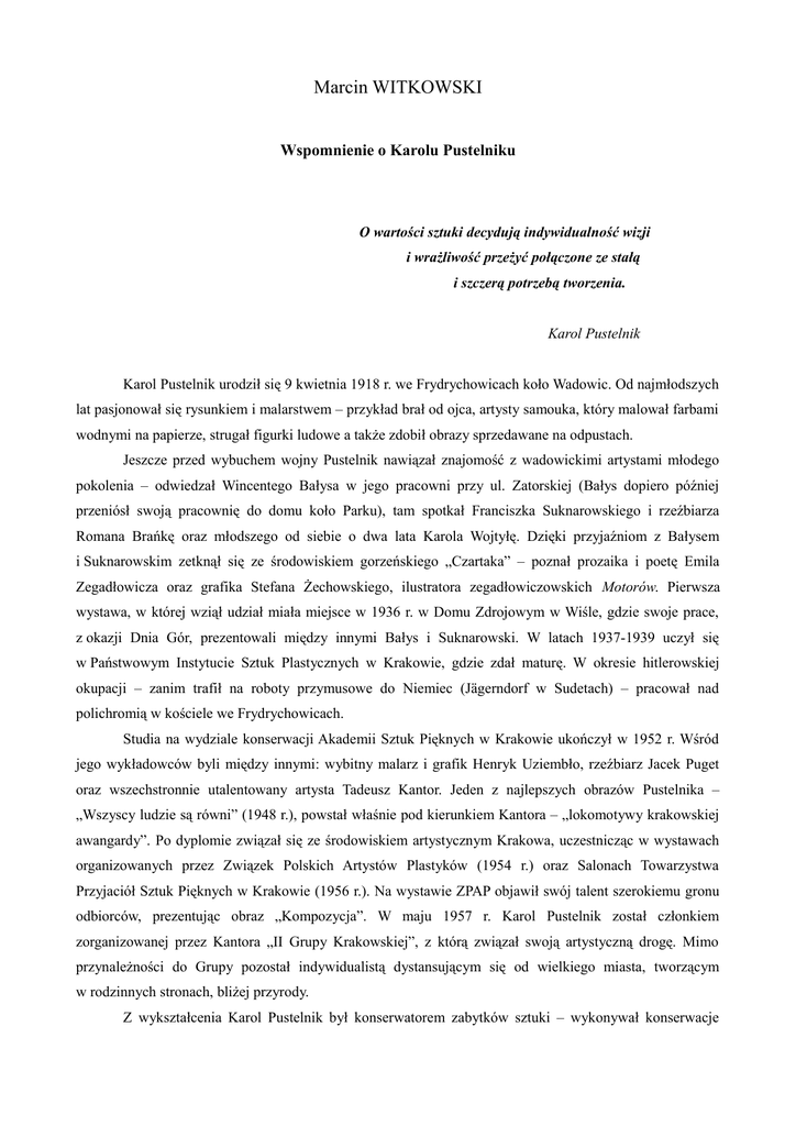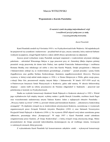 Marcin WITKOWSKI Wspomnienie o Karolu Pustelniku O wartości sztuki decydują indywidualność wizji i wrażliwość przeżyć połączone ze stałą i szczerą potrzebą tworzenia. Karol Pustelnik Karol Pustelnik urodził się 9 kwietnia 1918 r. we Frydrychowicach koło Wadowic. Od najmłodszych lat pasjonował się rysunkiem i malarstwem – przykład brał od ojca, artysty samouka, który malował farbami wodnymi na papierze, strugał figurki ludowe a także zdobił obrazy sprzedawane na odpustach. Jeszcze przed wybuchem wojny Pustelnik nawiązał znajomość z wadowickimi artystami młodego pokolenia – odwiedzał Wincentego Bałysa w jego pracowni przy ul. Zatorskiej (Bałys dopiero później przeniósł swoją pracownię do domu koło Parku), tam spotkał Franciszka Suknarowskiego i rzeźbiarza Romana Brańkę oraz młodszego od siebie o dwa lata Karola Wojtyłę. Dzięki przyjaźniom z Bałysem i Suknarowskim zetknął się ze środowiskiem gorzeńskiego „Czartaka” – poznał prozaika i poetę Emila Zegadłowicza oraz grafika Stefana Żechowskiego, ilustratora zegadłowiczowskich Motorów. Pierwsza wystawa, w której wziął udział miała miejsce w 1936 r. w Domu Zdrojowym w Wiśle, gdzie swoje prace, z okazji Dnia Gór, prezentowali między innymi Bałys i Suknarowski. W latach 1937-1939 uczył się w Państwowym Instytucie Sztuk Plastycznych w Krakowie, gdzie zdał maturę. W okresie hitlerowskiej okupacji – zanim trafił na roboty przymusowe do Niemiec (Jägerndorf w Sudetach) – pracował nad polichromią w kościele we Frydrychowicach. Studia na wydziale konserwacji Akademii Sztuk Pięknych w Krakowie ukończył w 1952 r. Wśród jego wykładowców byli między innymi: wybitny malarz i grafik Henryk Uziembło, rzeźbiarz Jacek Puget oraz wszechstronnie utalentowany artysta Tadeusz Kantor. Jeden z najlepszych obrazów Pustelnika – „Wszyscy ludzie są równi” (1948 r.), powstał właśnie pod kierunkiem Kantora – „lokomotywy krakowskiej awangardy”. Po dyplomie związał się ze środowiskiem artystycznym Krakowa, uczestnicząc w wystawach organizowanych przez Związek Polskich Artystów Plastyków (1954 r.) oraz Salonach Towarzystwa Przyjaciół Sztuk Pięknych w Krakowie (1956 r.). Na wystawie ZPAP objawił swój talent szerokiemu gronu odbiorców, prezentując obraz „Kompozycja”. W maju 1957 r. Karol Pustelnik został członkiem zorganizowanej przez Kantora „II Grupy Krakowskiej”, z którą związał swoją artystyczną drogę. Mimo przynależności do Grupy pozostał indywidualistą dystansującym się od wielkiego miasta, tworzącym w rodzinnych stronach, bliżej przyrody. Z wykształcenia Karol Pustelnik był konserwatorem zabytków sztuki – wykonywał konserwacje i renowacje zabytków kościelnych. Pracował nad polichromiami, obrazami i feretronami między innymi w kościołach Małopolski, w Świętokrzyskiem, na Rzeszowszczyźnie i Sądecczyźnie. Prowadził także prace konserwatorskie w Wadowicach – jego dziełem jest złocenie ołtarza w Bazylice Ofiarowania NMP, prace u Księży Pallotynów na Kopcu i Sióstr Nazaretanek oraz Ojców Karmelitów „na Górce”, gdzie oprócz renowacji ołtarza wykonał także obraz św. Rafała Kalinowskiego (obecny obraz w nawie bocznej jest już innego autorstwa). Artysta traktował jednak konserwację zabytków w kategoriach źródła utrzymania – był przede wszystkim malarzem a malarstwo było Jego wielką miłością. Czym charakteryzowała się Jego twórczość? Był indywidualistą – gdy artyści Grupy Krakowskiej prezentowali swoje dzieła – obrazy Pustelnika zawsze zwracały uwagę zwiedzających i koneserów sztuki. Zaskakiwał. Był oryginalny i niepowtarzalny. Nigdy nie trzymał się określonego czy obowiązującego aktualnie stylu w sztuce. Gdy triumfy święcił socrealizm Pustelnik zachwycił się kubizmem, później, pod wpływem Kantora, poszedł w kierunku taszyzmu (abstrakcji niegeometrycznej) a jeszcze bardziej zbliżonego do niego informelu – całej gamy swobodnych plam, intensywnych barw nieograniczonych rygorami kompozycji. Jednocześnie żaden z tych nurtów nie zdominował twórczości artysty. Korzystając z nich wszystkich Pustelnik stworzył swój własny, oryginalny i niepowtarzalny styl – dynamiczny, pełen barw i bogactwa kolorów, magii oraz fantazyjnych postaci. Malowałem przede wszystkim z wyobraźni, bo zawsze ważne było dla mnie to, co otacza mnie i co jest we mnie. W swoim malowaniu szukałem przestrzeni. Chciałem, żeby określały ją nie tylko długość i szerokość, ale też dźwięk, nastrój i czas. Najważniejsza w obrazie była perspektywa, a potem kontrastowanie kolorem i dialog ogółu z detalem. Techniki malarskie rozwijały się u Karola Pustelnika wraz z rozwojem artystycznym – zaczynał od pejzaży akwarelą, później zaczął malować olejami i temperą, pod wpływem artystów z Grupy Krakowskiej wykonywał także collage. W jego dorobku znalazły się obrazy olejne, także płótna wielkoformatowe (m. in. cykl „Mity rodzinne”), rzadziej akwarele czy oleje na aluminiowym podobraziu („Pola sygnalizacyjne”, „Trzecie światło”). W jego dorobku artystycznym znalazła się też między innymi olejna kopia obrazu Marcina Wadowity. Brał udział w zbiorowych wystawach Grupy Krakowskiej (od 1957 r.), Wystawach Sztuki Nowoczesnej oraz wystawach objazdowych w kraju i zagranicą (w 1962 r. w USA). Indywidualnie swoje prace prezentował m.in. w galeriach krakowskich: Krzysztofory, DESA, Galery Starmach oraz w galeriach Biura Wystaw Artystycznych w Bielsku-Białej i Lublinie. Kilkakrotnie płótna Karola Pustelnika eksponowano na wystawach indywidualnych w Wadowicach (1980, 1987, 1995, 2001, 2007) oraz na ekspozycji Wadowickiego Środowiska Artystycznego (1995, 2000, 2005, 2010 (pośmiertnie)). Prace artysty znajdują się w zbiorach muzealnych Krakowa, Warszawy, Szczecina, Łodzi, Lublina, Bydgoszczy, Tarnowa, Muzeum Miejski