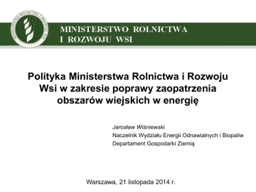 Polityka Ministerstwa Rolnictwa i Rozwoju Wsi w zakresie poprawy zaopatrzenia obszarów wiejskich w energię Jarosław Wiśniewski Naczelnik Wydziału Energii Odnawialnych i Biopaliw Departament Gospodarki Ziemią Warszawa, 21 listopada 2014 r. Często pojawiające się stwierdzenia Energia z odnawialnych źródeł jest za droga. Polska energetyka oparta jest na węglu i tylko ten kierunek gwarantuje bezpieczeństwo energetyczne kraju. Mamy przestarzałą infrastrukturę energetyczną, która wymaga dużych nakładów inwestycyjnych, w tym budowy nowych sieci przesyłowych i dystrybucyjnych. 2 Koszty energii elektrycznej 225 średnia cena energii elektrycznej wytworzonej przez wytwórców eksploatujących jednostki centralnie dysponowane opalane węglem [zł/MWh] 200 175 średnia cena sprzedaży energii elektrycznej na rynku konkurencyjnym (cena zakupu energii z OZE) 150 125 100 2009 2010 Źródło: Informacje Prezesa URE 2011 2012 2013 2014 3 Koszty wsparcia OZE Wyszczególnienie 2009 2010 Krajowe zużycie energii elektrycznej [GWh] 148 718 156 060 157 910 157 013 8 679 10 889 13 137 16 879 Wysokość opłaty zastępczej [zł/MWh] 258,89 267,95 274,92 286,74 Cena świadectwa pochodzenia [zł/MWh] 247,10 254,49 261,79 253,30 2 147 2 793 3 467 4 313 47 441 594 326 2 100 2 352 2 874 3 987 0,01 0,02 0,02 0,03 Produkcja energii elektrycznej z OZE [GWh] Wsparcie OZE [mln zł], w tym: - opłata zastępcza - świadectwa pochodzenia Wsparcie OZE w przeliczeniu na 1 kWh krajowego zużycia energii [zł/kWh] 2011 2012 Źródło: Obliczenia MRiRW na podstawie Informacji URE, GUS, MG 4 Opłaty ponoszone przez odbiorców końcowych energii • cena energii elektrycznej – odzwierciedla koszty jej pozyskania, uzależniona od ilości zużytej energii; ustalana w zł/kWh lub zł/MWh, • składnik zmienny stawki sieciowej – rekompensujący koszty zakupu energii elektrycznej w ilości niezbędnej do pokrycia różnicy bilansowej oraz koszty stałe, w części nieuwzględnionej w składniku stałym stawki opłaty przesyłowej w związku z postanowieniami art. 45 ust. 5 ustawy Prawo energetyczne; jest zależny od ilości pobranej energii, ustalany w zł/kWh lub zł/MWh, • stawka jakościowa – związana z kosztami utrzymania odpowiednich parametrów energii elektrycznej; jest zależna od ilości pobranej energii, ustalana w zł/kWh lub zł/MWh, 5 Opłaty ponoszone przez odbiorców końcowych energii c.d. • stawka opłaty przejściowej – stawka związana z kosztami likwidacji kontraktów długoterminowych; dla gospodarstw domowych jest ona uzależniona od rocznego zużycia energii elektrycznej, a w pozostałych grupach taryfowych zależy od wielkości mocy umownej, ustalana w zł/kW/miesiąc lub w zł/miesiąc dla odbiorców energii elektrycznej grup taryfowych G, • składnik stały stawki sieciowej – rekompensujący przedsiębiorstwu energetycznemu ponoszone przez nie koszty eksploatacji sieci oraz jej odtworzenia, modernizacji i rozwoju; koszty stałe przesyłania energii sieciami innych napięć i sieciami innych przedsiębiorstw sieciowych; składnik zależny jest od wielkości mocy umownej - ustalany w zł/kW/miesiąc a dla odbiorców energii elektrycznej grup taryfowych G składnik stały stawki sieciowej ustalony jest w zł/miesiąc, • stawka opłaty abonamentowej – rekompensuje ponoszone koszty obsługi handlowej, tj. koszty związane z odczytem wskazań układów pomiarowo rozliczeniowych i ich kontrolą; jest uzależniona od długości okresu rozliczeniowego, ustalana w zł/miesiąc. 6 Opłaty za energię elektryczną dla odbiorcy w gospodarstwie domowym Według informacji Prezesa Urzędu Regulacji Energetyki, średnia cena energii elektrycznej dla odbiorcy w gospodarstwie domowym uwzględniająca opłatę za świadczenie usługi dystrybucji energii elektrycznej, obliczonej na podstawie cen zawartych w umowach kompleksowych wyniosła: - za 2013 rok – 0,5048 zł/kWh (bez VAT) - za 2012 rok – 0,5047 zł/kWh (bez VAT) ~ 0,62 zł/kWh z VAT, w tym cena energii elektrycznej to około 30-40% Wytwórca energii z OZE może otrzymać: – zapłatę za energię elektryczną – 181,55 zł/MWh – z tytułu świadectwa pochodzenia – 168,00 zł/MWh 349,55 zł/MWh 7 Struktura zużycia energii w gospodarstwach domowych wg kierunków użytkowania (%) Wyszczególnienie 2002 2009 2012 Ogrzewanie pomieszczeń 71,3 70,2 68,8 Ogrzewanie wody 15,0 14,4 14,8 Gotowanie posiłków 7,1 8,2 8,3 Oświetlenie 2,3 1,8 1,5 Urządzenia elektryczne 4,3 5,4 6,6 Źródło: Zużycie energii w gospodarstwach domowych w 2012 r. (GUS 2014 r.) 8 Jak efektywnie wykorzystać istniejący potencjał OZE w Polsce? • Inwestycje indywidualne i sprzedaż energii do sieci – trudności z przyłączeniem, – niestabilny system wsparcia oraz kolejne zmiany, • Inwestycje prosumenckie i wytwarzanie energii na własne potrzeby – stosunkowo długi okres zwrotu inwestycji dla prosumenta, – konieczność zapewnienia ciągłości dostaw energii (wiatr, słońce), • Inwestycje zbiorowe i tworzenie np. spółdzielni energetycznych – pierwsza spółdzielnia energetyczna powstała w woj. lubelskim, 9 Wyjazdy studyjne do Niemiec sfinansowane w ramach PROW 2007-2013 I. Termin 14 – 16 lipca 2014 r. dla przedstawicieli operatorów sieci dystrybucyjnych, przedstawicieli administracji II. Termin 23 – 25 lipca 2014 r. dla przedstawicieli samorządu terytorialnego Zasięg terytorialny: Brandenburgia, Hesja, Dolna Saksonia i Bawaria 10 Liczba spółdzielni energetycznych w Niemczech Źródło: www.renewables-in-germany.com 11 Znaczenie spółdzielni energetycznych w Niemczech • produkcję tańszej energii na potrzeby energetyczna) oraz wpływy z dywidend, własne (niezależność • obniżenie emisji, wypełnianie celów klimatycznych, poprawa jakości środowiska naturalnego, • integrację i rozwój społeczności lokalnej poprzez stworzenie nowych miejsc pracy i nabycie nowych umiejętności (tzw. „green jobs”), roz