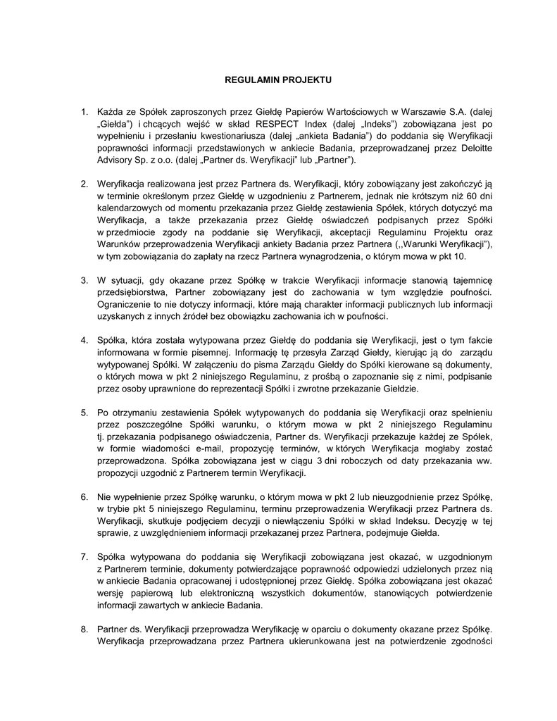 REGULAMIN PROJEKTU 1. Każda ze Spółek zaproszonych przez Giełdę Papierów Wartościowych w Warszawie S.A. (dalej „Giełda”) i chcących wejść w skład RESPECT Index (dalej „Indeks”) zobowiązana jest po wypełnieniu i przesłaniu kwestionariusza (dalej „ankieta Badania”) do poddania się Weryfikacji poprawności informacji przedstawionych w ankiecie Badania, przeprowadzanej przez Deloitte Advisory Sp. z o.o. (dalej „Partner ds. Weryfikacji” lub „Partner”). 2. Weryfikacja realizowana jest przez Partnera ds. Weryfikacji, który zobowiązany jest zakończyć ją w terminie określonym przez Giełdę w uzgodnieniu z Partnerem, jednak nie krótszym niż 60 dni kalendarzowych od momentu przekazania przez Giełdę zestawienia Spółek, których dotyczyć ma Weryfikacja, a także przekazania przez Giełdę oświadczeń podpisanych przez Spółki w przedmiocie zgody na poddanie się Weryfikacji, akceptacji Regulaminu Projektu oraz Warunków przeprowadzenia Weryfikacji ankiety Badania przez Partnera (,,Warunki Weryfikacji”), w tym zobowiązania do zapłaty na rzecz Partnera wynagrodzenia, o którym mowa w pkt 10. 3. W sytuacji, gdy okazane przez Spółkę w trakcie Weryfikacji informacje stanowią tajemnicę przedsiębiorstwa, Partner zobowiązany jest do zachowania w tym względzie poufności. Ograniczenie to nie dotyczy informacji, które mają charakter informacji publicznych lub informacji uzyskanych z innych źródeł bez obowiązku zachowania ich w poufności. 4. Spółka, która została wytypowana przez Giełdę do poddania się Weryfikacji, jest o tym fakcie informowana w formie pisemnej. Informację tę przesyła Zarząd Giełdy, kierując ją do zarządu wytypowanej Spółki. W załączeniu do pisma Zarządu Giełdy do Spółki kierowane są dokumenty, o których mowa w pkt 2 niniejszego Regulaminu, z prośbą o zapoznanie się z nimi, podpisanie przez osoby uprawnione do reprezentacji Spółki i zwrotne przekazanie Giełdzie. 5. Po otrzymaniu zestawienia Spółek wytypowanych do poddania się Weryfikacji oraz spełnieniu przez poszczególne Spółki warunku, o którym mowa w pkt 2 niniejszego Regulaminu tj. przekazania podpisanego oświadczenia, Partner ds. Weryfikacji przekazuje każdej ze Spółek, w formie wiadomości e-mail, propozycję terminów, w których Weryfikacja mogłaby zostać przeprowadzona. Spółka zobowiązana jest w ciągu 3 dni roboczych od daty przekazania ww. propozycji uzgodnić z Partnerem termin Weryfikacji. 6. Nie wypełnienie przez Spółkę warunku, o którym mowa w pkt 2 lub nieuzgodnienie przez Spółkę, w trybie pkt 5 niniejszego Regulaminu, terminu przeprowadzenia Weryfikacji przez Partnera ds. Weryfikacji, skutkuje podjęciem decyzji o niewłączeniu Spółki w skład Indeksu. Decyzję w tej sprawie, z uwzględnieniem informacji przekazanej przez Partnera, podejmuje Giełda. 7. Spółka wytypowana do poddania się Weryfikacji zobowiązana jest okazać, w uzgodnionym z Partnerem terminie, dokumenty potwierdzające poprawność odpowiedzi udzielonych przez nią w ankiecie Badania opracowanej i udostępnionej przez Giełdę. Spółka zobowiązana jest okazać wersję papierową lub elektroniczną wszystkich dokumentów, stanowiących potwierdzenie informacji zawartych w ankiecie Badania. 8. Partner ds. Weryfikacji przeprowadza Weryfikację w oparciu o dokumenty okazane przez Spółkę. Weryfikacja przeprowadzana przez Partnera ukierunkowana jest na potwierdzenie zgodności wszystkich odpowiedzi udzielonych przez Spółkę ze stanem faktycznym. Proces planowania i realizacji Weryfikacji odbywa się z uwzględnieniem standardu ISAE 3000 i ma charakter zlecenia poświadczającego o ograniczonym zakresie. Weryfikacja nie stanowi badania sprawozdania finansowego w rozumieniu Ustawy z dnia 29 września 1994 r. o rachunkowości ani czynności rewizji finansowych w rozumieniu Ustawy z dnia 7 maja 2009 r. o biegłych rewidentach (…). Weryfikacja dokonywana jest (i) z uwzględnieniem standardu ISAE 3000 dotyczącego zlecenia poświadczającego o ograniczonym zakresie, (ii) zgodnie z Regulaminem Projektu, Warunkami Weryfikacji oraz Umową o Współpracy z Giełdą. 9. Weryfikacja odbywa się, w jednym z terminów zaproponowanych przez Partnera i uzgodnionym ze Spółką, w siedzibie Spółki wytypowanej do poddania się Weryfikacji. 10. Z tytułu przeprowadzonej weryfikacji Spółka zobowiązana jest do zapłaty na rzecz Partnera ds. Weryfikacji wynagrodzenia w wysokości równowartości w złotych kwoty 1000 EUR lub 2000 EUR netto, a także pokrycia kosztów związanych z przejazdem, dietą i noclegiem członków zespołu Partnera. Wysokość wynagrodzenia, która ma zastosowanie w przypadku danej Spółki uzależniona jest od poziomu przychodów osiągniętych w ostatnim zamkniętym roku finansowym, poprzedzającym rok, w którym przeprowadzana jest Weryfikacja. Spółki, których przychody skonsolidowane w ww. okresie są niższe niż 2 mld PLN zobowiązane są do uiszczenia wynagrodzenia w wysokości równowartości w złotych kwoty 1000 EUR, natomiast Spółki, których przychody są równe lub przekraczają ten próg uiszczają wynagrodzenie w wysokości równowartości w złotych kwoty 2000 EUR. 11. W sytuacji, gdy ankieta Badania uzupełniona i przesłana przez Spółkę odnosi się nie tylko do Spółki, ale również do jej grupy kapitałowej, Spółka zobowiązana jest okazać członkom zespołu Partnera ds. Weryfikacji w swojej siedzibie wszelkie dokumenty potwierdzające poprawność odpowiedzi udzielonych w ankiecie Badania, a odnoszących się również do pozostałych podmiotów tworzących grupę kapitałową. 12. W przypadku, gdy Spółka nie okazała wszystkich niezbędnych dokumentów w trakcie Weryfikacji przeprowadzanej przez Partnera, jest ona zobowiązana dostarczyć je do siedziby Partnera ds. Weryfikacji w terminie 3 dni roboczych licząc od daty, w której Weryfikacja w siedzibie Spółki była przeprowadzana