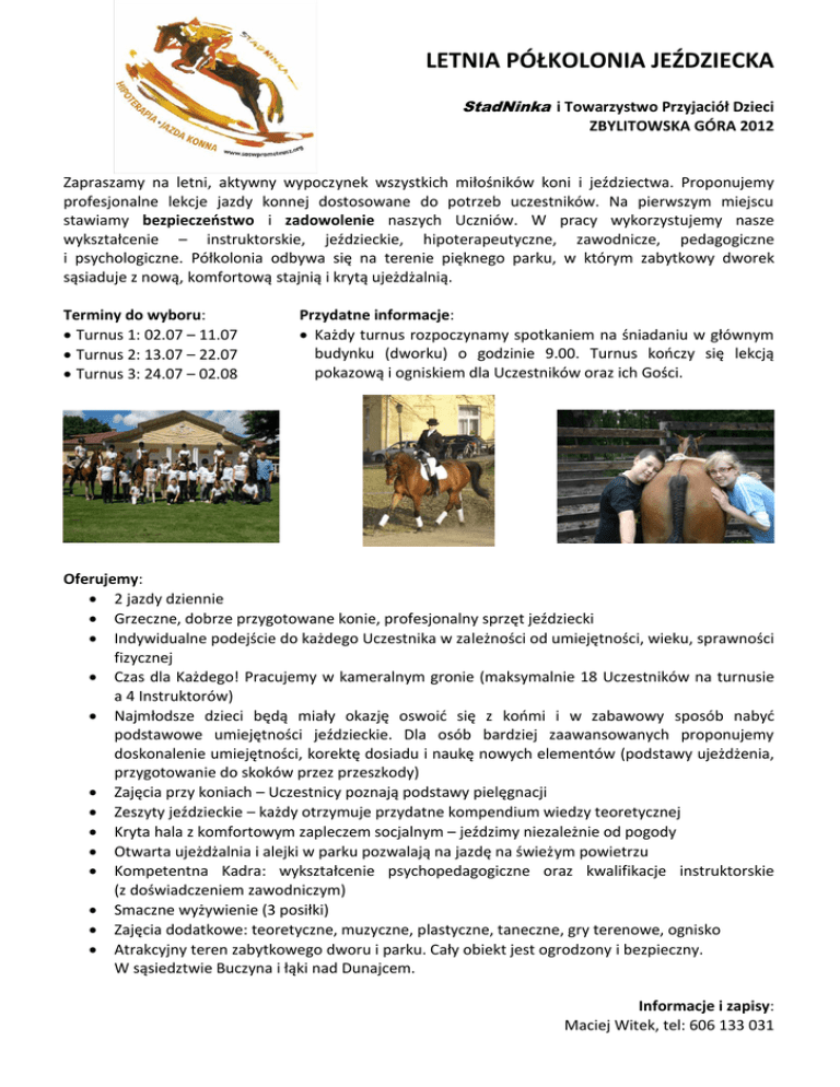 LETNIA PÓŁKOLONIA JEŹDZIECKA StadNinka i Towarzystwo Przyjaciół Dzieci ZBYLITOWSKA GÓRA 2012 Zapraszamy na letni, aktywny wypoczynek wszystkich miłośników koni i jeździectwa. Proponujemy profesjonalne lekcje jazdy konnej dostosowane do potrzeb uczestników. Na pierwszym miejscu stawiamy bezpieczeństwo i zadowolenie naszych Uczniów. W pracy wykorzystujemy nasze wykształcenie – instruktorskie, jeździeckie, hipoterapeutyczne, zawodnicze, pedagogiczne i psychologiczne. Półkolonia odbywa się na terenie pięknego parku, w którym zabytkowy dworek sąsiaduje z nową, komfortową stajnią i krytą ujeżdżalnią. Terminy do wyboru: Turnus 1: 02.07 – 11.07 Turnus 2: 13.07 – 22.07 Turnus 3: 24.07 – 02.08 Przydatne informacje: Każdy turnus rozpoczynamy spotkaniem na śniadaniu w głównym budynku (dworku) o godzinie 9.00. Turnus kończy się lekcją pokazową i ogniskiem dla Uczestników oraz ich Gości. Oferujemy: 2 jazdy dziennie Grzeczne, dobrze przygotowane konie, profesjonalny sprzęt jeździecki Indywidualne podejście do każdego Uczestnika w zależności od umiejętności, wieku, sprawności fizycznej Czas dla Każdego! Pracujemy w kameralnym gronie (maksymalnie 18 Uczestników na turnusie a 4 Instruktorów) Najmłodsze dzieci będą miały okazję oswoić się z końmi i w zabawowy sposób nabyć podstawowe umiejętności jeździeckie. Dla osób bardziej zaawansowanych proponujemy doskonalenie umiejętności, korektę dosiadu i naukę nowych elementów (podstawy ujeżdżenia, przygotowanie do skoków przez przeszkody) Zajęcia przy koniach – Uczestnicy poznają podstawy pielęgnacji Zeszyty jeździeckie – każdy otrzymuje przydatne kompendium wiedzy teoretycznej Kryta hala z komfortowym zapleczem socjalnym – jeździmy niezależnie od pogody Otwarta ujeżdżalnia i alejki w parku pozwalają na jazdę na świeżym powietrzu Kompetentna Kadra: wykształcenie psychopedagogiczne oraz kwalifikacje instruktorskie (z doświadczeniem zawodniczym) Smaczne wyżywienie (3 posiłki) Zajęcia dodatkowe: teoretyczne, muzyczne, plastyczne, taneczne, gry terenowe, ognisko Atrakcyjny teren zabytkowego dworu i parku. Cały obiekt jest ogrodzony i bezpieczny. W sąsiedztwie Buczyna i łąki nad Dunajcem. Informacje i zapisy: Maciej Witek, tel: 606 133 031