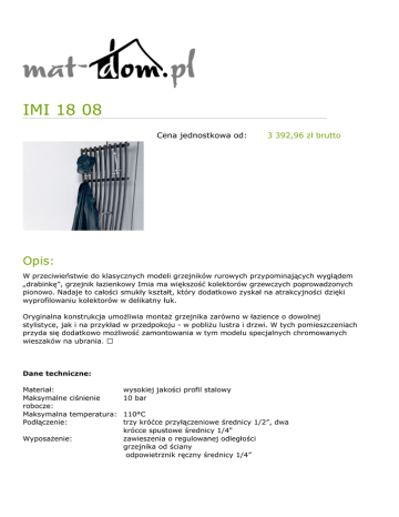 IMI 18 08 Cena jednostkowa od: 3 392,96 zł brutto Opis: W przeciwieństwie do klasycznych modeli grzejników rurowych przypominających wyglądem „drabinkę”, grzejnik łazienkowy Imia ma większość kolektorów grzewczych poprowadzonych pionowo. Nadaje to całości smukły kształt, który dodatkowo zyskał na atrakcyjności dzięki wyprofilowaniu kolektorów w delikatny łuk. Oryginalna konstrukcja umożliwia montaż grzejnika zarówno w łazience o dowolnej stylistyce, jak i na przykład w przedpokoju - w pobliżu lustra i drzwi. W tych pomieszczeniach przyda się dodatkowo możliwość zamontowania w tym modelu specjalnych chromowanych wieszaków na ubrania. Dane techniczne: Materiał: Maksymalne ciśnienie robocze: Maksymalna temperatura: Podłączenie: Wyposażenie: wysokiej jakości profil stalowy 10 bar 110°C trzy króćce przyłączeniowe średnicy 1/2”, dwa krócce spustowe średnicy 1/4" zawieszenia o regulowanej odległości grzejnika od ściany odpowietrznik ręczny średnicy 1/4” Przygotowanie powierzchni: śrutowanie, odtłuszczanie, fosforanowanie, płukanie wodą zdemineralizowaną Malowanie podkładowe: anaforeza Malowanie: napylanie elektrostatyczne Normy, atesty: PN EN 442, ISO 9002, ISO 14001 Zastosowanie: wodne instalacje centralnego ogrzewania Kraj produkcji: Austria Gwarancje: 10 lat Powered by TCPDF (www.tcpdf.org)