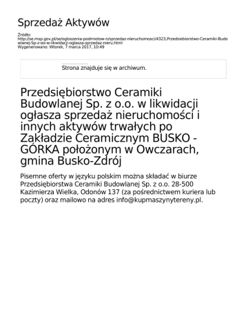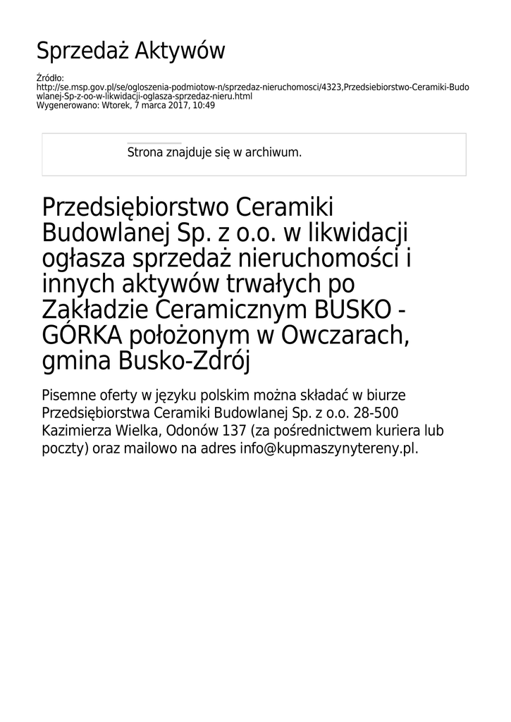 Sprzedaż Aktywów Źródło: http://se.msp.gov.pl/se/ogloszenia-podmiotow-n/sprzedaz-nieruchomosci/4323,Przedsiebiorstwo-Ceramiki-Budo wlanej-Sp-z-oo-w-likwidacji-oglasza-sprzedaz-nieru.html Wygenerowano: Wtorek, 7 marca 2017, 10:49 Strona znajduje się w archiwum. Przedsiębiorstwo Ceramiki Budowlanej Sp. z o.o. w likwidacji ogłasza sprzedaż nieruchomości i innych aktywów trwałych po Zakładzie Ceramicznym BUSKO GÓRKA położonym w Owczarach, gmina Busko-Zdrój Pisemne oferty w języku polskim można składać w biurze Przedsiębiorstwa Ceramiki Budowlanej Sp. z o.o. 28-500 Kazimierza Wielka, Odonów 137 (za pośrednictwem kuriera lub poczty) oraz mailowo na adres [email protected]. Przedsiębiorstwo Ceramiki Budowlanej Sp. z o.o. w likwidacji ogłasza sprzedaż nieruchomości i majątku ruchomego po Zakładzie Ceramicznym BUSKO - GÓRKA położonego w miejscowości Owczary, gmina Busko-Zdrój, województwo świętokrzyskie. Pisemne oferty oraz kontakt w języku polskim pod adresem mailowym [email protected] lub telefonicznie pod numerem +48 535 552 700 (Dariusz Wileczek). OGŁOSZENIE SZCZEGÓŁOWE O SPRZEDAŻY NIERUCHOMOŚCI GRUNTOWEJ ZABUDOWANEJ ZAKŁADEM PRODUKCJI CERAMIKI BUDOWLANEJ ORAZ MASZYN I URZĄDZEŃ DO PRODUKCJI. województwo świętokrzyskie, położony w miejscowości Owczary, w bezpośrednim sąsiedztwie Buska - Zdroju (3 km do Centrum) - lokalizacja na mapie poniżej. Likwidator Spółki Przedsiębiorstwa Ceramiki Budowlanej Sp. z o.o. w likwidacji z siedzibą w 28-500 Kazimierza Wielka, Odonów 137 (zwana dalej Zbywcą lub PCB) ZAPRASZA do zapoznania się z przedmiotową nieruchomością i składania pisemnych i ustnych ofert. I. Opis nieruchomości. Nieruchomość objęta jest wieczystym prawem użytkowanie do 5 grudnia 2089 roku. Grunt przeznaczony do sprzedaży składa się z działki o łącznej powierzchni 37.600 m2. Powierzchnia zabudowy łącznie to 4.921,56 m2 a łączna powierzchnia użytkowa wszystkich zabudowań to 5.015,17 m2. Zabudowa Zakładu jest częściowo ogrodzona ogrodzeniem z siatki w ramach z kątownika na słupkach stalowych oraz ogrodzeniem betonowym. Duża powierzchnia działki jest wybetonowana /betonem wylewanym i płytami drogowymi betonowymi o wym. 3m x1,5 m. gr. 18 cm / powierzchnia ok. 6200 m2 /. W skład zabudowań wchodzą: budynek produkcyjny, suszarnia, budynek warsztatowy ślusarnia, budynek trafo, budynek biurowy, budynek socjalny, magazyn paliw, portiernia, budynek rozdzielni, kotłownia, warsztat elektryczny, warsztat samochodowy Na działce znajdują się również wiaty o konstrukcji stalowej i stalowo - betonowej: ● Wiata na zasilacze o pow - 336,62 m2 ● Wiata na węgiel - 123,19 m2 ● Wiata nad taśmociągiem gliny /zasilacz/ - 20,10 m2 ● Magazyn trocin / z płyt betonowych / - 63,41 m2 Działka uzbrojona jest w energię elektryczną, wodę, szambo, sieć kanalizacji sanitarnej i deszczowej, gaz. Stan techniczny budynków jest dobry. Szczegółowy opis przedmiotowej nieruchomości i zabudowań został dołączony do niniejszego ogłoszenia. Ponadto na terenie Zakładu znajduje się przeznaczony do sprzedania majątek ruchomy w postaci maszyn i urządzeń wykorzystywanych w produkcji ceramiki budowlanej (głównie pustaki MAX). W skład tego majątku wchodzą przede wszystkim: piec tunelowy, suszarnia komorowa, zasilacze skrzyniowe, prasa ślimakowa, przenośniki taśmowe i wiele innych. Szczegółowy wykaz majątku http://www.kup-maszyny-tereny.pl/ ruchomego w zakładce znajduje "Pliki się do pod pobrania" adresem: pozycja "wykaz_maszyn_Busko_Zdroj_26_03_2013.pdf". I. Wizja lokalna Wszystkich zainteresowanych zapraszamy do oglądania nieruchomości w dni robocze po wcześniejszym uzgodnieniu telefonicznym. Kontakt w tej sprawie: Dariusz Wileczek tel. 535 552 700 lub info(małpa)kupmaszynytereny.pl I. Miejsce, tryb składania ofert oraz wymogi stawiane nadsyłanym ofertom Pisemne oferty w języku polskim można składać w biurze Przedsiębiorstwa Ceramiki Budowlanej Sp. z o.o. 28-500 Kazimierza Wielka, Odonów 137 (za pośrednictwem kuriera lub poczty) oraz mailowo na adres [email protected]. W postępowaniu mogą brać udział osoby fizyczne oraz osoby prawne, a także jednostki organizacyjne nie posiadające osobowości prawnej. Wszelkie szczegółowe informacje można uzyskać pod wyżej wymienionym numerem telefonicznym. I. Pozostałe informacje PCB Sp. z o.o. w likwidacji nie ponosi kosztów poniesionych przez podmioty zainteresowane nabyciem nieruchomości, w związku z ich uczestnictwem w postępowaniu w/s sprzedaży przedmiotowej nieruchomości. PCB Sp. z o.o. w likwidacji może w każdym czasie odwołać lub zmienić warunki postępowania lub ogłoszeń, zamknąć postępowanie bez wybrania którejkolwiek z ofert. Ogłoszenie znajduje się również na stronie internetowej: www.kupmaszynytereny.pl w zakładce "Kompleksy Przemysłowe". Załączniki do strony Opis nieruchomości (pdf, 55.09 KB) Opublikowane przez: Aleksandra Sierpińska Ostatnia zmiana: 12.06.2013 , 17.04.2014 Autor: Przedsiębiorstwo Ceramiki Aleksandra Sierpińska Budowlanej Sp. z o.o. w likwidacji Rejestr zmian