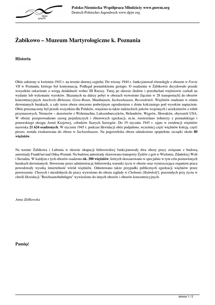 Polsko-Niemiecka Współpraca Młodzieży www.pnwm.org Deutsch-Polnisches Jugendwerk www.dpjw.org Żabikowo – Muzeum Martyrologiczne k. Poznania Historia Obóz założony w kwietniu 1943 r. na terenie dawnej cegielni. Do wiosny 1944 r. funkcjonował równolegle z obozem w Forcie VII w Poznaniu, którego był kontynuacją. Podlegał poznańskiemu gestapo. O osadzeniu w Żabikowie decydowało przede wszystkim oskarżenie o wrogą działalność wobec III Rzeszy. Tutaj po okresie śledztw i przesłuchań więźniowie czekali na wydanie lub wykonanie wyroków. Skazanych na dalszy pobyt w obozach wywożono [łącznie w 28 transportach] do obozów koncentracyjnych Auschwitz-Birkenau, Gross-Rosen, Mauthausen, Sachsenhausen, Ravensbrück. Więźniów osadzano w ośmiu drewnianych barakach, a cały teren obozu otoczono podwójnym ogrodzeniem z drutu kolczastego pod wysokim napięciem. Obóz przeznaczony był przede wszystkim dla Polaków, więziono tu także radzieckich jeńców wojennych i uciekinierów z robót przymusowych, Niemców – dezerterów z Wehrmachtu, Luksemburczyków, Holendrów, Węgrów, Słowaków, obywateli USA. W obozie przeprowadzono szereg pojedynczych i zbiorowych egzekucji, m.in. rozstrzelano żołnierzy z poznańskiego i pomorskiego okręgu Armii Krajowej, członków Szarych Szeregów. Do 19 stycznia 1945 r. ujęto w ewidencji więźniów nazwiska 21 624 osadzonych. W styczniu 1945 r. podczas likwidacji obóz podpalono, wcześniej część więźniów koleją, część pieszo, została ewakuowana do obozu w Sachsenhausen. Na pogorzelisku obozu odnaleziono spopielone szczątki około 80 więźniów. Na terenie Żabikowa i Lubonia w okresie okupacji hitlerowskiej funkcjonowały dwa obozy pracy związane z budową autostrady Frankfurt nad Odrą–Poznań. Na budowę autostrady skierowano transporty Żydów z gett w Wieluniu, Zduńskiej Woli i Sieradzu. W każdym z tych obozów osadzono ok. 300 więźniów, których skoszarowano w specjalnie w tym celu postawionych barakach drewnianych. Stworzone przez administrację hitlerowską warunki życia w obozie oraz wyniszczająca organizm praca powodowały wysoką śmiertelność wśród więźniów. Odnotowano także przypadki publicznych egzekucji więźniów przez powieszenie. Chorych i niezdolnych do pracy wywożono do obozu zagłady w Chełmnie [Kulmholf], pozostałych przy życiu w chwili likwidacji "Reichsautobahnlagru" wywieziono do innych obozów i obozów koncentracyjnych. Anna Ziółkowska Pamięć strona 1 / 2 Polsko-Niemiecka Współpraca Młodzieży www.pnwm.org Deutsch-Polnisches Jugendwerk www.dpjw.org Teren byłego więzienia policji bezpieczeństwa i wychowawczego obozu pracy jest zachowany częściowo. Centralnie usytuowany jest pomnik „Nigdy wojny”, a także liczne głazy narzutowe z tablicami upamiętniającymi pomordowanych harcerzy, żołnierzy AK i więźniów z Luksemburga oraz pomnik ku czci więźniów radzieckich. Przy pomniku znajduje się symboliczna „ściana śmierci” – fragment ogrodzenia obozowego z tablicami z nazwiskami pomordowanych w obozie. W pobliżu muzeum, na koronie wału przebiegającej obok autostrady, znajduje się pomnik martyrologii ludności żydowskiej zatrudnionej w okresie okupacji przy budowie autostrady. Muzeum gromadzi dokumenty, fotografie, pamiątki po więźniach osadzonych w obozie, a także dokumentację dotyczącą funkcjonowania 140 obozów pracy przymusowej dla Żydów w Wielkopolsce, w tym przede wszystkim obozów związanych z budową autostrady Frankfurt nad Odrą – Poznań. W poobozowym baraku, w latach 1945-1948 służącym internowanej cywilnej ludności niemieckiej, umieszczona jest wystawa stała dotycząca historii obozu, w tzw. łączniku wystawa stała „Reichsautobahnlager. Obozy pracy przymusowej dla Żydów 1941-1943”. W byłej willi komendanta odbywają się wystawy czasowe. Anna Ziółkowska Informacje praktyczne Żabikowo – Muzeum Martyrologiczne k. Poznania Dojazd: Luboń leży na południowych przedmieściach Poznania; dojazd koleją (rozkłady jazdy na www.pkp.pl); plan miasta na stronie www.lubon.pl. Muzeum Martyrologiczne w Żabikowie, ul. Niezłomnych 2, 62-031 Luboń tel. +48 61 813 06 81 faks: +48 61 810 34 11 http://www.zabikowo.home.pl e-mail [email protected] Czynne: wtorek-piątek 9.00-15.00; sobota i niedziela 10.00-14.00. Wstęp: bezpłatny strona 2 / 2 Powered by TCPDF (www.tcpdf.org)