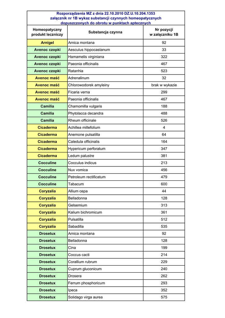 Rozporządzenia MZ z dnia 22.10.2010 DZ.U.10.204.1353 załącznik nr 1B wykaz substancji czynnych homeopatycznych dopuszczonych do obrotu w punktach aptecznych Homeopatyczny produkt leczniczy Substancja czynna Nr pozycji w załączniku 1B Arnica montana 92 Avenoc czopki Aesculus hippocastanum 33 Avenoc czopki Hamamelis virginiana 322 Avenoc czopki Paeonia officinalis 467 Avenoc czopki Ratanhia 523 Avenoc maść Adrenalinum 32 Avenoc maść Chlorowodorek amyleiny Avenoc maść Ficaria verna 299 Avenoc maść Paeonia officinalis 467 Camilia Chamomilla vulgaris 188 Camilia Phytolacca decandra 488 Camilia Rheum officinale 526 Arnigel brak w wykazie Cicaderma Achillea millefolium 4 Cicaderma Anemone pulsatilla 64 Cicaderma Caledula officinalis 164 Cicaderma Hypericum perforatum 347 Cicaderma Ledum palustre 381 Cocculine Cocculus indicus 213 Cocculine Nux vomica 456 Cocculine Petroleum rectificatum 479 Cocculine Tabacum 600 Coryzalia Allium cepa 44 Coryzalia Belladonna 128 Coryzalia Gelsemium 313 Coryzalia Kalium bichromicum 361 Coryzalia Pulsatilla 512 Coryzalia Sabadilla 535 Drosetux Arnica montana 92 Drosetux Belladonna 128 Drosetux Cina 199 Drosetux Coccus cacti 214 Drosetux Corallium rubrum 229 Drosetux Cuprum gluconicum 240 Drosetux Drosera 262 Drosetux Ferrum phosphoricum 293 Drosetux Ipeca 352 Drosetux Solidago virga aurea 575 Rozporządzenia MZ z dnia 22.10.2010 DZ.U.10.204.1353 załącznik nr 1B wykaz substancji czynnych homeopatycznych dopuszczonych do obrotu w punktach aptecznych Homeopatyczny produkt leczniczy Substancja czynna Nr pozycji w załączniku 1B Gastrocynesine Abies nigra 1 Gastrocynesine Carbo vegetabilis 174 Gastrocynesine Nux vomica 456 Gastrocynesine Robinia pseudo-acacia 530 Hepato-drainol Berberis vulgaris 131 Hepato-drainol Chelidonium majus 189 Hepato-drainol Hydrastis canadensis 344 Hepato-drainol Juglans regia 357 Hepato-drainol Leptandra virginica 384 Hepato-drainol Mercurius solubilis Hahnemanni 416 Hepato-drainol Rana bufo 520 Hepato-drainol Silybum marianum 565 Homeogene 46 Ballota foetida 122 Homeogene 46 Hyoscyamus niger 345 Homeogene 46 Nux moschata 455 Homeogene 46 Passiflora incarnata 473 Homeogene 46 Stramonium 586 Homeogene 9 Arnica montana 92 Homeogene 9 Arum triphyllum 102 Homeogene 9 Belladonna 128 Homeogene 9 Bromum 143 Homeogene 9 Bryonia 145 Homeogene 9 Mercurius solubilis Hahnemanni 416 Homeogene 9 Phytolacca decandra 488 Homeogene 9 Pulsatilla 512 Homeogene 9 Spongia tosta 577 Homeoplasmine Acidum boricum 13 Homeoplasmine Benzoe 130 Homeoplasmine Bryonia dioica 148 Homeoplasmine Caledula officinalis 164 Homeoplasmine Phytolacca decandra 488 Homeoptic Calcarea fluorica 154 Homeoptic Caledula officinalis 164 Homeoptic Cineraria maritima 202 Homeoptic Euphrasia officinalis 288 Homeoptic Kalium muriaticum 366 Homeoptic Magnesia carbonica 396 Rozporządzenia MZ z dnia 22.10.2010 DZ.U.10.204.1353 załącznik nr 1B wykaz substancji czynnych homeopatycznych dopuszczonych do obrotu w punktach aptecznych Homeopatyczny produkt leczniczy Substancja czynna Nr pozycji w załączniku 1B Homeoptic Silicea 564 Homeotuss Anemone pulsatilla 64 Homeotuss Antimonium tartaricum 68 Homeotuss Bryonia 145 Homeotuss Coccus cacti 214 Homeotuss Drosera 262 Homeotuss Ipecacuanha 353 Homeotuss Rumex crispus 533 Homeotuss Spongia tosta 577 Homeotuss Sticta pulmonaria 585 Homeovox Aconitum napellus 28 Homeovox Arum triphyllum 102 Homeovox Belladonna 128 Homeovox Bryonia dioica 148 Homeovox Caledula officinalis 164 Homeovox Ferrum phosphoricum 293 Homeovox Hepar sulfuris calcareum 332 Homeovox Kalium bichromicum 361 Homeovox Mercurius solubilis Hahnemanni 416 Homeovox Populus candicans 503 Homeovox Spongia tosta 577 Anas barbariae hepatis et cordis extractum 63 Osteocynesine Calcarea carbonica ostrearum 153 Osteocynesine Calcarea fluorica 154 Osteocynesine Calcarea phosphorica 157 Osteocynesine Sulfur iodatum 596 Paragrippe Arnica montana 92 Paragrippe Belladonna 128 Paragrippe Eupatorium perfoliatum 283 Paragrippe Gelsemium sempervirens 314 Paragrippe Sulfur 594 Rhinallergy Allium cepa 44 Rhinallergy Ambrosia artemisiaefolia 51 Rhinallergy Euphrasia officinalis 288 Rhinallergy Histaminum muriaticum 334 Rhinallergy Sabadilla 535 Rhinallergy Solidago virga aurea 575 Oscillococcinum Rozporządzenia MZ z dnia 22.10.2010 DZ.U.10.204.1353 załącznik nr 1B wykaz substancji czynnych homeopatycznych dopuszczonych do obrotu w punktach aptecznych Homeopatyczny produkt leczniczy Substancja czynna Nr pozycji w załączniku 1B Sedalia Chamomilla vulgaris 188 Sedalia Gelsemium 313 Sedalia Hyoscyamus niger 345 Sedalia Kalium bromatum 362 Sedalia Passiflora incarnata 473 Sedalia Stramonium 586 Sedatif PC Abrus precatorius 3 Sedatif PC Aconitum napellus 28 Sedatif PC Belladonna 128 Sedatif PC Caledula officinalis 164 Sedatif PC Chelidonium majus 189 Sedatif PC Viburnum opulus 634 Stodal granulki Antimonium tartaricum 68 Stodal granulki Bryonia 145 Stodal granulki Coccus cacti 214 Stodal granulki Ipeca 352 Stodal granulki Myocardium 427 Stodal granulki Pulsatilla 512 Stodal granulki Rumex crispus 533 Stodal granulki Spongia tosta 577 Stodal granulki Sticta pulmonaria 585 Stodal syrop Antimonium tartaricum 68 Stodal syrop Bryonia 145 Stodal syrop Coccus cacti 214 Stodal syrop Drosera 262 Stodal syrop Ipeca 352 Stodal syrop Myocardium 427 Stodal syrop Pulsatilla 512 Stodal syrop Rumex crispus 533 Stodal syrop Spongia tosta 577 Stodal syrop Sticta pulmonaria 585