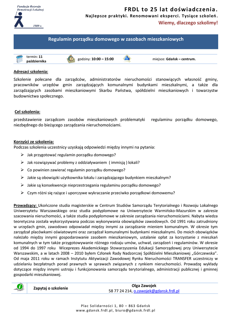 FRDL to 25 lat doświadczenia . Najlepsze praktyki. Renomowani eksperci. Tysiące szkoleń . Wiemy, dlaczego szkolimy! Regulamin porządku domowego w zasobach mieszkaniowych termin: 11 października godziny: 10:00 – 15:00 miejsce: Gdańsk – centrum. Adresaci szkolenia: Szkolenie polecane dla zarządców, administratorów nieruchomości stanowiących własność gminy, pracowników urzędów gmin zarządzających komunalnymi budynkami mieszkalnymi, a także dla zarządzających zasobami mieszkaniowymi Skarbu Państwa, spółdzielni mieszkaniowych i towarzystw budownictwa społecznego. Cel szkolenia: przedstawienie zarządcom zasobów mieszkaniowych problematyki niezbędnego do bieżącego zarządzania nieruchomościami. regulaminu porządku domowego, Korzyści ze szkolenia: Podczas szkolenia uczestnicy uzyskają odpowiedzi między innymi na pytania: Jak przygotować regulamin porządku domowego? Jak rozwiązywać problemy z oddziaływaniem ( immisją ) lokali? Co powinien zawierać regulamin porządku domowego? Jakie są obowiązki użytkownika lokalu i zarządzającego budynkiem mieszkalnym? Jakie są konsekwencje nieprzestrzegania regulaminu porządku domowego? Czym różni się rażące i uporczywe wykraczanie przeciwko porządkowi domowemu? Prowadzący: Ukończone studia magisterskie w Centrum Studiów Samorządu Terytorialnego i Rozwoju Lokalnego Uniwersytetu Warszawskiego oraz studia podyplomowe na Uniwersytecie Warmińsko-Mazurskim w zakresie szacowania nieruchomości, a także studia podyplomowe w zakresie zarządzania nieruchomościami. Nabyta wiedza teoretyczna została wykorzystywana podczas wykonywania obowiązków zawodowych. Od 1991 roku zatrudniony w urzędach gmin, zawodowo odpowiadał między innymi za zarządzanie mieniem komunalnym. W okresie tym zarządzał placówkami oświatowymi oraz zarządzał komunalnymi budynkami mieszkalnymi. Do moich obowiązków należało między innymi gospodarowanie zasobem mieszkaniowym, ustalanie opłat za korzystanie z mieszkań komunalnych w tym także przygotowywanie różnego rodzaju umów, uchwał, zarządzeń i regulaminów. W okresie od 1994 do 1997 roku Wiceprezes Akademickiego Stowarzyszenia Edukacji Samorządowej przy Uniwersytecie Warszawskim, a w latach 2008 – 2010 byłem Członek Rady Nadzorczej Spółdzielni Mieszkaniowej „Górczewska”. Od maja 2011 roku w ramach Instytutu Aktywizacji Zawodowej Rynku Nieruchomości TRANSFER uczestniczy w udzielaniu bezpłatnych porad prawnych w sprawach związanych z rynkiem nieruchomości. Prowadzę wykłady dotyczące między innymi ustroju i funkcjonowania samorządu terytorialnego, administracji publicznej i gminnej gospodarki mieszkaniowej. Zapytaj o szkolenie Olga Zawojek 58 77 24 214, [email protected] Pla c S ol id ar n o śc i 1, 8 0 – 86 3 Gd ań s k w w w. gd an sk .f rd l .p l , b iu ro @gd a n sk. frd l.p l Program: 1. UWARUNKOWANIA PRAWNE a) Definicja Regulaminu Porządku Domowego, b) Regulamin Porządku Domowego w przepisach prawa, c) Wykraczanie w sposób rażący lub uporczywy przeciwko porządkowi domowemu, d) Skutki prawne nieprzestrzegania Regulaminu porządku domowego, e) zagrożenie pożarowe budynków wielorodzinnych, f) Zakres obowiązywania Regulaminu Porządku Domowego : lokale mieszkalne, lokale użytkowe, pomieszczenia ogólnodostępne i tereny przynależne do budynku, g) Organy uprawnione do przycięcia regulaminu porządku domowego w budynkach komunalnych, Skarbu Państwa, wspólnot mieszkaniowych, spółdzielni mieszkaniowych, towarzystw budownictwa społecznego, 2. WYBRANE ZAGADNIENIA PRAWA SĄSIEDZKIEGO a) prawo własności, b) oddziaływanie lokali ( immisja ), 3. NAJCZĘSTSZE UCIĄŻLIWOŚCI PODCZAS KORZYSTANIA Z LOKALU a) źródła hałasu i cisza nocna, b) zapachy, c) zwierzęta domowe, d) działalność gospodarcza w lokalu. 4 . PRZEPISY PORZĄDKOWE DOTYCZĄCE MIĘDZY INNYMI : a) terenu nieruchomości, b) pomieszczeń ogólnodostępnych, c) piwnic przypisanych do lokali, d) balkonów, loggii, dachów i elewacji, e) zakazów i ostrzeżeń w Regulaminie Porządku Domowego , 5. DYSKUSJA WYŚLIJ ZGŁOSZENIE DO: 06.10.2016r, 15:00 [email protected] 58 550 32 39 FORMULARZ ZGŁOSZENIOWY: Regulamin porządku domowego podatkowej - 11 października 2016r. Nazwa Instytucji/Firmy (dane do FV): Adres: NIP: Telefon: Faks: 1. Imię, nazwisko , stanowisko e-mail Imię, nazwisko , stanowisko e-mail 2. Cena netto: 399,89zł TAK / NIE 339,90zł TAK / NIE Zgłoszenie w terminie do 30 września 2016r. Dla kolejnej osoby zgłoszonej z tej samej instytucji 10% rabatu Udział w szkoleniu jest finansowane przynajmniej w 70 % ze środków publicznych Należność należy zapłacić przelewem po szkoleniu po otrzymaniu faktury VAT TAK / NIE TAK / NIE Zgodnie z Ust. o Ochronie Danych Osobowych z dnia 29.08.1997 r. wyrażam zgodę na przetwarzanie moich danych osobowych dla potrzeb działalności szkoleniowej FRDL Brak pisemnej rezygnacji ze szkolenia na 5 dni przed terminem będzie równoznaczny z obciążeniem Państwa 50 % kosztów ogólnych. Data: Podpis: Uwaga! Braku kontaktu ze strony FRDL minimum 2 dni przed terminem szkolenia może oznaczać, że karta zgłoszeniowa nie dotarła. W takim przypadku prosimy o kontakt telefoniczny lub mailowy: 58 772 42 14, [email protected]