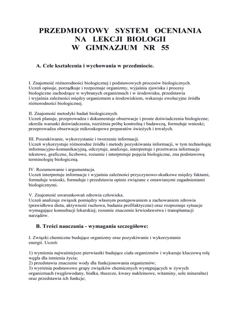 PRZEDMIOTOWY SYSTEM OCENIANIA NA LEKCJI BIOLOGII W GIMNAZJUM NR 55 A. Cele kształcenia i wychowania w przedmiocie. I. Znajomość różnorodności biologicznej i podstawowych procesów biologicznych. Uczeń opisuje, porządkuje i rozpoznaje organizmy, wyjaśnia zjawiska i procesy biologiczne zachodzące w wybranych organizmach i w środowisku, przedstawia i wyjaśnia zależności między organizmem a środowiskiem, wskazuje ewolucyjne źródła różnorodności biologicznej. II. Znajomość metodyki badań biologicznych. Uczeń planuje, przeprowadza i dokumentuje obserwacje i proste doświadczenia biologiczne; określa warunki doświadczenia, rozróżnia próbę kontrolną i badawczą, formułuje wnioski; przeprowadza obserwacje mikroskopowe preparatów świeżych i trwałych. III. Poszukiwanie, wykorzystanie i tworzenie informacji. Uczeń wykorzystuje różnorodne źródła i metody pozyskiwania informacji, w tym technologię informacyjno-komunikacyjną, odczytuje, analizuje, interpretuje i przetwarza informacje tekstowe, graficzne, liczbowe, rozumie i interpretuje pojęcia biologiczne, zna podstawową terminologię biologiczną. IV. Rozumowanie i argumentacja. Uczeń interpretuje informacje i wyjaśnia zależności przyczynowo-skutkowe między faktami, formułuje wnioski, formułuje i przedstawia opinie związane z omawianymi zagadnieniami biologicznymi. V. Znajomość uwarunkowań zdrowia człowieka. Uczeń analizuje związek pomiędzy własnym postępowaniem a zachowaniem zdrowia (prawidłowa dieta, aktywność ruchowa, badania profilaktyczne) oraz rozpoznaje sytuacje wymagające konsultacji lekarskiej; rozumie znaczenie krwiodawstwa i transplantacji narządów. B. Treści nauczania - wymagania szczegółowe: I. Związki chemiczne budujące organizmy oraz pozyskiwanie i wykorzystanie energii. Uczeń: 1) wymienia najważniejsze pierwiastki budujące ciała organizmów i wykazuje kluczową rolę węgla dla istnienia życia; 2) przedstawia znaczenie wody dla funkcjonowania organizmów; 3) wyróżnia podstawowe grupy związków chemicznych występujących w żywych organizmach (węglowodany, białka, tłuszcze, kwasy nukleinowe, witaminy, sole mineralne) oraz przedstawia ich funkcje; 4) przedstawia fotosyntezę, oddychanie tlenowe oraz fermentację mlekową i alkoholową jako procesy dostarczające energii; wymienia substraty i produkty tych procesów oraz określa warunki ich przebiegu; 5) wymienia czynniki niezbędne do życia dla organizmów samożywnych i cudzo żywnych; ocenia, czy dany organizm jest samożywny czy cudzożywny. II. Budowa i funkcjonowanie komórki. Uczeń: 1) dokonuje obserwacji mikroskopowych komórki i rozpoznaje (pod mikroskopem, na schemacie, na zdjęciu lub po opisie) podstawowe elementy budowy komórki (błona komórkowa, cytoplazma, jądro, chloroplast, mitochondrium, wakuola, ściana komórkowa); 2) przedstawia podstawowe funkcje poszczególnych elementów komórki; 3) porównuje budowę komórki bakterii, roślin i zwierząt, wskazując cechy umożliwiające ich rozróżnienie. III. Systematyka – zasady klasyfikacji, sposoby identyfikacji i przegląd różnorodności organizmów. Uczeń: 1) uzasadnia potrzebę klasyfikowania organizmów i przedstawia zasady systemu klasyfikacji biologicznej (system jako sposób katalogowania organizmów, jednostki taksonomiczne, podwójne nazewnictwo); 2) posługuje się prostym kluczem do oznaczania organizmów; 3) wymienia cechy, którymi wirusy różnią się od organizmów zbudowanych z komórek; 4) podaje znaczenie czynności życiowych organizmu (jednokomórkowego i wielokomórkowego): odżywiania, oddychania, wydalania, ruchu, reakcji na bodźce, rozmnażania, wzrostu i rozwoju; 5) przedstawia podstawowe czynności życiowe organizmu jednokomórkowego na przykładzie wybranego protista samożywnego (np. eugleny) i cudzo żywnego (np. pantofelka); 6) przedstawia miejsca występowania bakterii i protistów oraz ich znaczenie w przy rodzie i dla człowieka; 7) wymienia cechy umożliwiające zaklasyfikowanie organizmu do grzybów oraz identyfikuje nieznany organizm jako przedstawiciela grzybów na podstawie obecności tych cech; wskazuje miejsca występowania grzybów (w tym grzybów porostowych); 8) obserwuje okazy i porównuje cechy morfologiczne glonów i roślin lądowych (mchów, widłaków, skrzypów, paproci, nagozalążkowych i okryto zalążkowych), wymienia cechy umożliwiające zaklasyfikowanie organizmu do wymienionych wyżej grup oraz identyfikuje nie znany organizm jako przedstawiciela jednej z nich na podstawie obecności tych cech; 9) wymienia cechy umożliwiające zaklasyfikowanie organizmu do parzydełkowców, płazińców, nicieni, pierścienic, stawonogów (skorupiaków, owadów i pajęczaków), mięczaków, ryb, płazów, gadów, ptaków, ssaków oraz identyfikuje nieznany organizm jako przedstawiciela jednej z wymienionych grup na podstawie obecności tych cech; 10) porównuje cechy morfologiczne, środowisko i tryb życia grup zwierząt wymienionych w pkt 9, w szczególności porównuje grupy kręgowców pod kątem pokrycia ciała, narządów wymiany gazowej, ciepłoty ciała, rozmnażania i rozwoju; 11) przedstawia znaczenie poznanych grzybów, roślin i zwierząt w środowisku i dla człowieka. IV. Ekologia. Uczeń: 1) przedstawia czynniki środowiska niezbędne do prawidłowego funkcjonowania organizmów w środowisku lądowym i wodnym; 2) wskazuje, na przykładzie dowolnie wybranego gatunku, zasoby, o które konkurują jego przedstawiciele między sobą i z innymi gatunkami, przedstawia skutki konkurencji wewnątrzgatunkowej i międzygatunkowej; 3) przedstawia, na przykładzie poznanych wcześniej roślinożernych ssaków, adaptacje zwierząt do odżywiania się pokarmem roślinnym; podaje przykłady przystosowań roślin służących obronie przed zgryzaniem; 4) przedstawia, na przykładzie poznanych wcześniej mięsożernych ssaków, adaptacje drapieżników do chwytania zdobyczy; podaje p