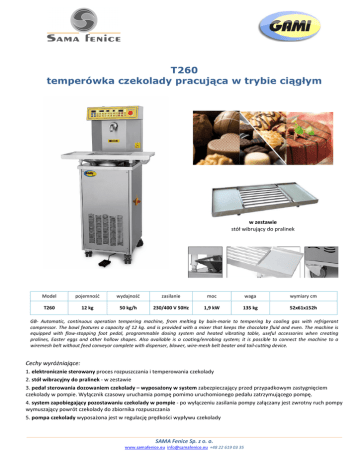 T260 temperówka czekolady pracująca w trybie ciągłym w zestawie stół wibrujący do pralinek Model pojemność wydajność zasilanie moc waga wymiary cm T260 12 kg 50 kg/h 230/400 V 50Hz 1,9 kW 135 kg 52x61x152h GB- Automatic, continuous operation tempering machine, from melting by bain-marie to tempering by cooling gas with refrigerant compressor. The bowl features a capacity of 12 kg. and is provided with a mixer that keeps the chocolate fluid and even. The machine is equipped with flow-stopping foot pedal, programmable dosing system and heated vibrating table, useful accessories when creating pralines, Easter eggs and other hollow shapes. Also available is a coating/enrobing system; it is possible to connect the machine to a wiremesh belt without feed conveyor complete with dispenser, blower, wire-mesh belt beater and tail-cutting device. Cechy wyróżniające: 1. elektronicznie sterowany proces rozpuszczania i temperowania czekolady 2. stół wibracyjny do pralinek - w zestawie 3. pedał sterowania dozowaniem czekolady – wyposażony w system zabezpieczający przed przypadkowym zastygnięciem czekolady w pompie. Wyłącznik czasowy uruchamia pompę pomimo uruchomionego pedału zatrzymującego pompę. 4. system zapobiegający pozostawaniu czekolady w pompie - po wyłączeniu zasilania pompy załączany jest zwrotny ruch pompy wymuszający powrót czekolady do zbiornika rozpuszczania 5. pompa czekolady wyposażona jest w regulację prędkości wypływu czekolady ____________________________________________________________________________________________________________________________________________________________________ SAMA Fenice Sp. z o. o. www.samafenice.eu [email protected] +48 22 619 03 35 Wyposażenie opcjonalne - wyłącznie do T260 NT260S stół roboczy z taśmą siatkową i transporterem z taśmą papierową DSR400 dekorowanie spodów DR400 – DR400A pełne oblanie (max 100mm) AF400 urządzenie obniżające siatkę celem głębszego zanurzenia produktów w czekoladzie DEC250 dekorowanie ciastek w linie ZIG ZAG ____________________________________________________________________________________________________________________________________________________________________ SAMA Fenice Sp. z o. o. www.samafenice.eu [email protected] +48 22 619 03 35