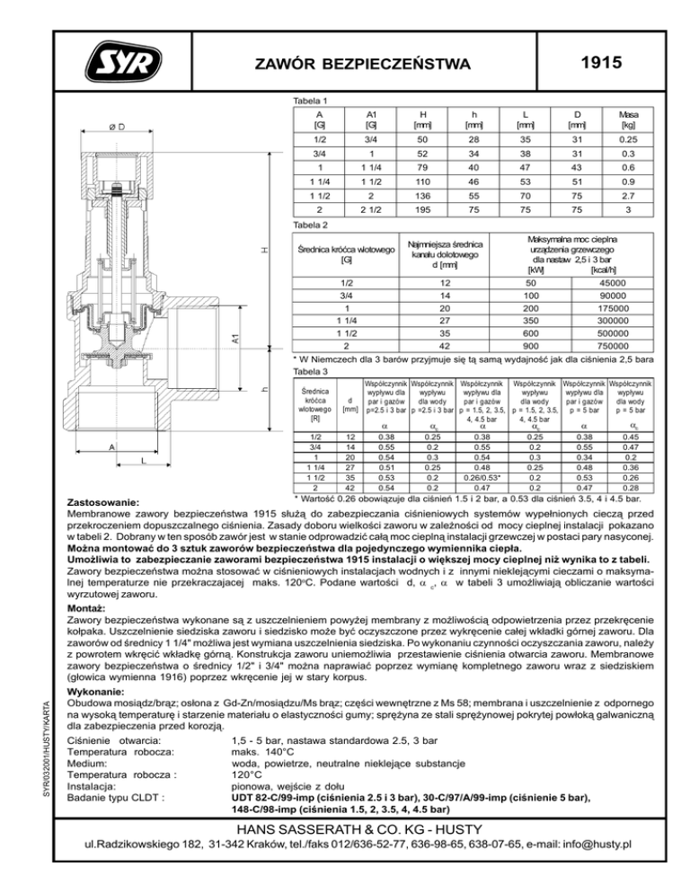 1915 ZAWÓR BEZPIECZEŃSTWA Tabela 1 A [G] A1 [G] H [mm] h [mm] L [mm] D [mm] Masa [kg] 1/2 3/4 50 28 35 31 0.25 3/4 1 52 34 38 31 0.3 1 1 1/4 79 40 47 43 0.6 1 1/4 1 1/2 110 46 53 51 0.9 1 1/2 2 136 55 70 75 2.7 2 2 1/2 195 75 75 75 3 Tabela 2 Średnica króćca wlotowego [G] Najmniejsza średnica kanału dolotowego d [mm] 1/2 3/4 1 1 1/4 1 1/2 2 12 14 20 27 35 42 Maksymalna moc cieplna urządzenia grzewczego dla nastaw 2,5 i 3 bar [kW] [kcal/h] 50 100 200 350 600 900 45000 90000 175000 300000 500000 750000 * W Niemczech dla 3 barów przyjmuje się tą samą wydajność jak dla ciśnienia 2,5 bara Tabela 3 Średnica króćca wlotowego [R] 1/2 3/4 1 1 1/4 1 1/2 2 Współczynnik Współczynnik Współczynnik Współczynnik Współczynnik Współczynnik wypływu dla wypływu wypływu dla wypływu wypływu dla wypływu d par i gazów dla wody par i gazów dla wody par i gazów dla wody [mm] p=2.5 i 3 bar p =2.5 i 3 bar p = 1.5, 2, 3.5, p = 1.5, 2, 3.5, p = 5 bar p = 5 bar 4, 4.5 bar 4, 4.5 bar 12 14 20 27 35 42 α αc α αc α 0.38 0.55 0.54 0.51 0.53 0.54 0.25 0.2 0.3 0.25 0.2 0.2 0.38 0.55 0.54 0.48 0.26/0.53* 0.47 0.25 0.2 0.3 0.25 0.2 0.2 0.38 0.55 0.34 0.48 0.53 0.47 αc 0.45 0.47 0.2 0.36 0.26 0.28 * Wartość 0.26 obowiązuje dla ciśnień 1.5 i 2 bar, a 0.53 dla ciśnień 3.5, 4 i 4.5 bar. Zastosowanie: Membranowe zawory bezpieczeństwa 1915 służą do zabezpieczania ciśnieniowych systemów wypełnionych cieczą przed przekroczeniem dopuszczalnego ciśnienia. Zasady doboru wielkości zaworu w zależności od mocy cieplnej instalacji pokazano w tabeli 2. Dobrany w ten sposób zawór jest w stanie odprowadzić całą moc cieplną instalacji grzewczej w postaci pary nasyconej. Można montować do 3 sztuk zaworów bezpieczeństwa dla pojedynczego wymiennika ciepła. Umożliwia to zabezpieczanie zaworami bezpieczeństwa 1915 instalacji o większej mocy cieplnej niż wynika to z tabeli. Zawory bezpieczeństwa można stosować w ciśnieniowych instalacjach wodnych i z innymi nieklejącymi cieczami o maksymalnej temperaturze nie przekraczajacej maks. 120oC. Podane wartości d, α c, α w tabeli 3 umożliwiają obliczanie wartości wyrzutowej zaworu. SYR/032001/HUSTY/KARTA Montaż: Zawory bezpieczeństwa wykonane są z uszczelnieniem powyżej membrany z możliwością odpowietrzenia przez przekręcenie kołpaka. Uszczelnienie siedziska zaworu i siedzisko może być oczyszczone przez wykręcenie całej wkładki górnej zaworu. Dla zaworów od średnicy 1 1/4" możliwa jest wymiana uszczelnienia siedziska. Po wykonaniu czynności oczyszczania zaworu, należy z powrotem wkręcić wkładkę górną. Konstrukcja zaworu uniemożliwia przestawienie ciśnienia otwarcia zaworu. Membranowe zawory bezpieczeństwa o średnicy 1/2" i 3/4" można naprawiać poprzez wymianę kompletnego zaworu wraz z siedziskiem (głowica wymienna 1916) poprzez wkręcenie jej w stary korpus. Wykonanie: Obudowa mosiądz/brąz; osłona z Gd-Zn/mosiądzu/Ms brąz; części wewnętrzne z Ms 58; membrana i uszczelnienie z odpornego na wysoką temperaturę i starzenie materiału o elastyczności gumy; sprężyna ze stali sprężynowej pokrytej powłoką galwaniczną dla zabezpieczenia przed korozją. Ciśnienie otwarcia: Temperatura robocza: Medium: Temperatura robocza : Instalacja: Badanie typu CLDT : 1,5 - 5 bar, nastawa standardowa 2.5, 3 bar maks. 140°C woda, powietrze, neutralne nieklejące substancje 120°C pionowa, wejście z dołu UDT 82-C/99-imp (ciśnienia 2.5 i 3 bar), 30-C/97/A/99-imp (ciśnienie 5 bar), 148-C/98-imp (ciśnienia 1.5, 2, 3.5, 4, 4.5 bar) HANS SASSERATH & CO. KG - HUSTY ul.Radzikowskiego 182, 31-342 Kraków, tel./faks 012/636-52-77, 636-98-65, 638-07-65, e-mail: [email protected]