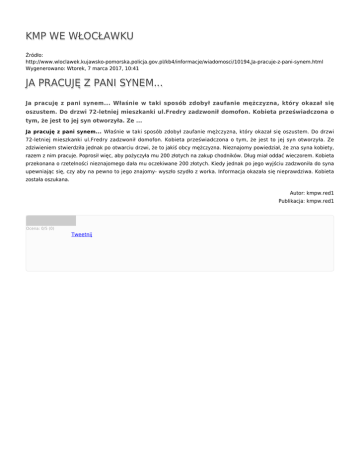 KMP WE WŁOCŁAWKU Źródło: http://www.wloclawek.kujawsko-pomorska.policja.gov.pl/kb4/informacje/wiadomosci/10194,Ja-pracuje-z-pani-synem.html Wygenerowano: Wtorek, 7 marca 2017, 10:41 JA PRACUJĘ Z PANI SYNEM... Ja pracuję z pani synem... Właśnie w taki sposób zdobył zaufanie mężczyzna, który okazał się oszustem. Do drzwi 72-letniej mieszkanki ul.Fredry zadzwonił domofon. Kobieta przeświadczona o tym, że jest to jej syn otworzyła. Ze ... Ja pracuję z pani synem... Właśnie w taki sposób zdobył zaufanie mężczyzna, który okazał się oszustem. Do drzwi 72-letniej mieszkanki ul.Fredry zadzwonił domofon. Kobieta przeświadczona o tym, że jest to jej syn otworzyła. Ze zdziwieniem stwierdziła jednak po otwarciu drzwi, że to jakiś obcy mężczyzna. Nieznajomy powiedział, że zna syna kobiety, razem z nim pracuje. Poprosił więc, aby pożyczyła mu 200 złotych na zakup chodników. Dług miał oddać wieczorem. Kobieta przekonana o rzetelności nieznajomego dała mu oczekiwane 200 złotych. Kiedy jednak po jego wyjściu zadzwoniła do syna upewniając się, czy aby na pewno to jego znajomy- wyszło szydło z worka. Informacja okazała się nieprawdziwa. Kobieta została oszukana. Autor: kmpw.red1 Publikacja: kmpw.red1 Ocena: 0/5 (0) Tweetnij