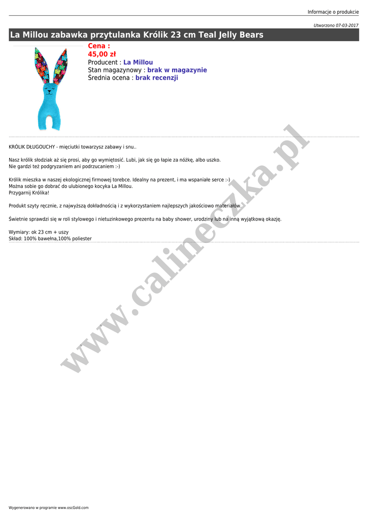 Informacje o produkcie Utworzono 07-03-2017 La Millou zabawka przytulanka Królik 23 cm Teal Jelly Bears Cena : 45,00 zł KRÓLIK DŁUGOUCHY - mięciutki towarzysz zabawy i snu.. zk a. Nasz królik słodziak aż się prosi, aby go wymiętosić. Lubi, jak się go łapie za nóżkę, albo uszko. Nie gardzi też podgryzaniem ani podrzucaniem :-) pl Producent : La Millou Stan magazynowy : brak w magazynie Średnia ocena : brak recenzji Królik mieszka w naszej ekologicznej firmowej torebce. Idealny na prezent, i ma wspaniałe serce :-) Można sobie go dobrać do ulubionego kocyka La Millou. Przygarnij Królika! Produkt szyty ręcznie, z najwyższą dokładnością i z wykorzystaniem najlepszych jakościowo materiałów. ec Świetnie sprawdzi się w roli stylowego i nietuzinkowego prezentu na baby shower, urodziny lub na inną wyjątkową okazję. w w w .c al in Wymiary: ok 23 cm + uszy Skład: 100% bawełna,100% poliester Wygenerowano w programie www.oscGold.com