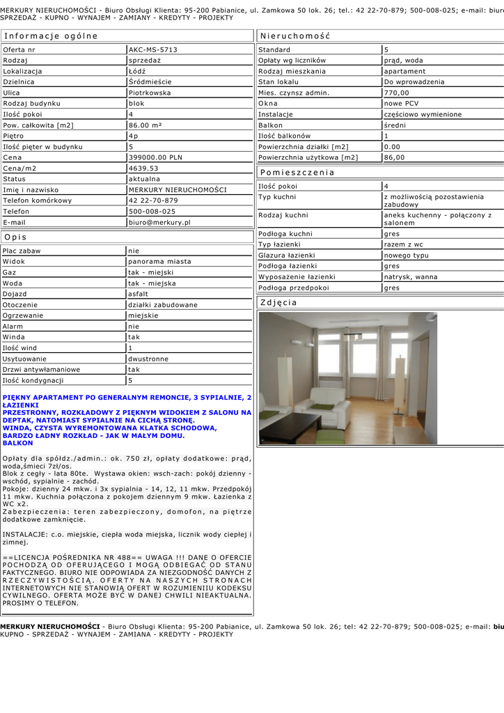 MERKURY NIERUCHOMOŚCI - Biuro Obsługi Klienta: 95-200 Pabianice, ul. Zamkowa 50 lok. 26; tel.: 42 22-70-879; 500-008-025; e-mail: biuro SPRZEDAŻ - KUPNO - WYNAJEM - ZAMIANY - KREDYTY - PROJEKTY Informacje ogólne Nieruchomość Oferta nr AKC-MS-5713 Standard 5 Rodzaj sprzedaż Opłaty wg liczników prąd, woda Lokalizacja Łódź Rodzaj mieszkania apartament Dzielnica Śródmieście Stan lokalu Do wprowadzenia Ulica Piotrkowska Mies. czynsz admin. 770,00 Rodzaj budynku blok Okna nowe PCV Ilość pokoi 4 Instalacje częściowo wymienione Pow. całkowita [m2] 86.00 m² Balkon średni Piętro 4p Ilość balkonów 1 Ilość pięter w budynku 5 Powierzchnia działki [m2] 0.00 Cena 399000.00 PLN Powierzchnia użytkowa [m2] 86,00 Cena/m2 4639.53 Status aktualna Imię i nazwisko MERKURY NIERUCHOMOŚCI Telefon komórkowy 42 22-70-879 Telefon 500-008-025 E-mail [email protected] Opis Plac zabaw nie Widok panorama miasta Gaz tak - miejski Woda tak - miejska Dojazd asfalt Otoczenie działki zabudowane Ogrzewanie miejskie Alarm nie Winda tak Ilość wind 1 Usytuowanie dwustronne Drzwi antywłamaniowe tak Ilość kondygnacji 5 Pomieszczenia Ilość pokoi 4 Typ kuchni z możliwością pozostawienia zabudowy Rodzaj kuchni aneks kuchenny - połączony z salonem Podłoga kuchni gres Typ łazienki razem z wc Glazura łazienki nowego typu Podłoga łazienki gres Wyposażenie łazienki natrysk, wanna Podłoga przedpokoi gres Zdjęcia PIĘKNY APARTAMENT PO GENERALNYM REMONCIE, 3 SYPIALNIE, 2 ŁAZIENKI PRZESTRONNY, ROZKŁADOWY Z PIĘKNYM WIDOKIEM Z SALONU NA DEPTAK, NATOMIAST SYPIALNIE NA CICHĄ STRONĘ. WINDA, CZYSTA WYREMONTOWANA KLATKA SCHODOWA, BARDZO ŁADNY ROZKŁAD - JAK W MAŁYM DOMU. BALKON Opłaty dla spółdz./admin.: ok. 750 zł, opłaty dodatkowe: prąd, woda,śmieci 7zł/os. Blok z cegły - lata 80te. Wystawa okien: wsch-zach: pokój dzienny wschód, sypialnie - zachód. Pokoje: dzienny 24 mkw. i 3x sypialnia - 14, 12, 11 mkw. Przedpokój 11 mkw. Kuchnia połączona z pokojem dziennym 9 mkw. Łazienka z WC x2. Zabezpieczenia: teren zabezpieczony, domofon, na piętrze dodatkowe zamknięcie. INSTALACJE: c.o. miejskie, ciepła woda miejska, licznik wody ciepłej i zimnej. ==LICENCJA POŚREDNIKA NR 488== UWAGA !!! DANE O OFERCIE POCHODZĄ OD OFERUJĄCEGO I MOGĄ ODBIEGAĆ OD STANU FAKTYCZNEGO. BIURO NIE ODPOWIADA ZA NIEZGODNOŚĆ DANYCH Z RZECZYWISTOŚCIĄ. OFERTY NA NASZYCH STRONACH INTERNETOWYCH NIE STANOWIĄ OFERT W ROZUMIENIIU KODEKSU CYWILNEGO. OFERTA MOŻE BYĆ W DANEJ CHWILI NIEAKTUALNA. PROSIMY O TELEFON. MERKURY NIERUCHOMOŚCI - Biuro Obsługi Klienta: 95-200 Pabianice, ul. Zamkowa 50 lok. 26; tel: 42 22-70-879; 500-008-025; e-mail: biu KUPNO - SPRZEDAŻ - WYNAJEM - ZAMIANA - KREDYTY - PROJEKTY