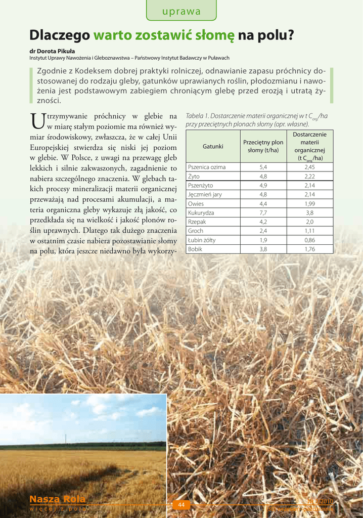 uprawa Dlaczego warto zostawić słomę na polu? dr Dorota Pikuła Instytut Uprawy Nawożenia i Gleboznawstwa – Państwowy Instytut Badawczy w Puławach Zgodnie z Kodeksem dobrej praktyki rolniczej, odnawianie zapasu próchnicy dostosowanej do rodzaju gleby, gatunków uprawianych roślin, płodozmianu i nawożenia jest podstawowym zabiegiem chroniącym glebę przed erozją i utratą żyzności. U trzymywanie próchnicy w glebie na w miarę stałym poziomie ma również wymiar środowiskowy, zwłaszcza, że w całej Unii Europejskiej stwierdza się niski jej poziom w glebie. W Polsce, z uwagi na przewagę gleb lekkich i silnie zakwaszonych, zagadnienie to nabiera szczególnego znaczenia. W glebach takich procesy mineralizacji materii organicznej przeważają nad procesami akumulacji, a materia organiczna gleby wykazuje złą jakość, co przedkłada się na wielkość i jakość plonów roślin uprawnych. Dlatego tak dużego znaczenia w ostatnim czasie nabiera pozostawianie słomy na polu, która jeszcze niedawno była wykorzy- Nasza Rola więcej z pola Tabela 1. Dostarczenie materii organicznej w t Corg./ha przy przeciętnych plonach słomy (opr. własne). Gatunki Pszenica ozima Żyto Pszenżyto Jęczmień jary Owies Kukurydza Rzepak Groch Łubin żółty Bobik 44 Przeciętny plon słomy (t/ha) 5,4 4,8 4,9 4,8 4,4 7,7 4,2 2,4 1,9 3,8 Dostarczenie materii organicznej (t Corg./ha) 2,45 2,22 2,14 2,14 1,99 3,8 2,0 1,11 0,86 1,76 Nr 2/2010 (30) wrzesień–październik stywana przede wszystkim na cele inwentarskie. Przyorując słomę, np. zbóż ok. 4,5 t/ha, zawierającą przeciętnie 42% Corg., zostawiamy w glebie prawie 2 t węgla organicznego (4,5 × 0,42 = 1, 89 t). Zakładając, że współczynnik humifikacji, czyli przemian dostarczonej masy organicznej w próchnicę, wynosi 0,25, to w glebie pozostanie 0, 4725 t/ha nowo utworzonej próchnicy (472,5 kg). słomą zostaną wykonane poprawnie. Jeśli słoma nie zostanie właściwie rozdrobniona i równomiernie rozrzucona na polu, będzie rozkładać się znacznie dłużej. Z tego względu zaleca się ciąć słomę na odcinki do maksymalnie 8 cm długości i tak przygotowaną równomiernie pokrywać pole. Do rozłożenia słomy w glebie niezbędne jest również zastosowanie azotu, a także dokładne wymieszanie jej z 10-centymetrową warstwą gleby. Takie postępowanie zapewni odpowiednią ilość azotu dla bakterii, rozkładających słomę i zapobiegnie okresowemu unieruchomieniu pierwiastka w glebie. Zwykle zaleca się zastosować 6–8 kg azotu na tonę słomy, gdyż bakterie na rozłożenie tony słomy zużywają do 8 kg azotu. Do tego celu można wykorzystać RSM, gnojówkę, gnojowicę lub mocznik. Następnie po- Reżim bardzo zalecany Przyorywanie słomy wiąże się jednak ze spełnieniem pewnego reżimu technologicznego. Istotne są również określone warunki pogodowe. Słoma po przyoraniu rozkłada się dość długo, przeciętnie prawie 7 miesięcy, oczywiście jeśli wszystkie zabiegi związane z nawożeniem Tabela 2. Przeciętna zawartość składników pokarmowych w słomie różnych gatunków roślin („Chemia rolna”, 2002). Gatunek Rośliny Makroelementy w g∙kg-1 s.m. Azot (N) Fosfor (P) Potas (K) Wapń (Ca) Magnez (Mg) 5,3 6,4 6,5 7,8 10,0 12 0,8 1,1 1,2 1,5 4,0 6,0 10,3 11,7 17,0 22,8 30,0 20,0 2,0 2,7 5,1 4,8 3,0 1,5 0,7 0,9 1,2 1,2 1,5 0,25 Żyto Pszenica Jęczmień Owies Rzepak Groch i bobik Mikroelementy w mg ∙kg-1 s.m. Żyto Pszenica Jęczmień Owies Rzepak Groch i bobik Mangan (Mn) 32 25 24 70 22 44 Nr 2/2010 (30) wrzesień–październik Bor (B) 1,8 2,8 4,8 4,0 17,0 13,0 Miedź (Cu) 1,8 5,1 4,1 3,6 2,5 4,0 45 Molibden (Mo) 0,26 0,33 0,28 0,31 0,23 0,11 Cynk (Zn) 8,0 20,0 22,0 48,0 15,0 28,0 Nasza Rola więcej z pola Danuta Szwemin uprawa uprawa winno się zaorać słomę. Na glebach cięższych zaleca się zmieszać słomę z glebą co najmniej dwa razy i następnie zaorać. Nierozłożona w glebie słoma może utrudniać wschody ozimin (okres od przyorania słomy do siewu ozimin i rzepaku ozimego jest krótki), dlatego należy bezwzględnie przestrzegać technologicznego reżimu nawożenia słomą. W celu przyspieszenia rozkładu słomy w glebie, można dodać dostępne na rynku preparaty stymulujące jej rozkład. Jeśli ze względów pogodowych gleba jest bardzo przesuszona, należy zrezygnować z przyorywania słomy. Dlaczego? W warunkach zbyt niskiej wilgotności gleby słoma nie ulegnie rozkładowi. W takim przypadku najlepiej wykorzystać ją jako mulcz, który doskonale ochroni glebę przed nadmiernym parowaniem do późnej jesieni. składników pokarmowych w glebie, wpływając dodatnio na saldo ich bilansu, który należy uwzględnić w ustalaniu potrzeb nawozowych roślin. Dane dotyczące zawartości składników pokarmowych w słomie różnych gatunków roślin zamieszczone w tabeli 2 są orientacyjne i należy pamiętać, że pod wpływem czynników klimatycznych, nawożenia, zabiegów agrotechnicznych czy doboru odmiany mogą ulegać wahaniom. Z tego względu zaleca się zawsze wykonać analizę słomy, którą zostawiamy na przeoranie, w celu określenia w niej aktualnej zawartości składników pokarmowych. Pozwoli to, wykorzystując wyniki analiz oraz znając masę przyorywanej, dokładnie obliczyć ilości składników makro- i mikroelementów wprowadzanych do gleby. Na przykład, przyorując słomę pszenicy o masie 4,5 t, wprowadza się do gleby ok. 29 kg azotu (N), 5 kg fosforu (P2O5), 53 kg potasu (K2O), 12 kg wapnia (CaO) oraz 4 kg magnezu (Mg), co należy uwzględnić w potrzebach nawozowych planowanych roślin. ■ Köckerling Ile składników pokarmowych w słomie? Słoma, oprócz znaczącego wpływu na saldo bilansu próchnicy w glebie, jest również źródłem składników pokarmowych: makro- i mikroelementów. Nawożenie słomą zwiększa pulę Nasza Rola więcej z pola 46 Nr 2/2010 (30) wrzesień–październik