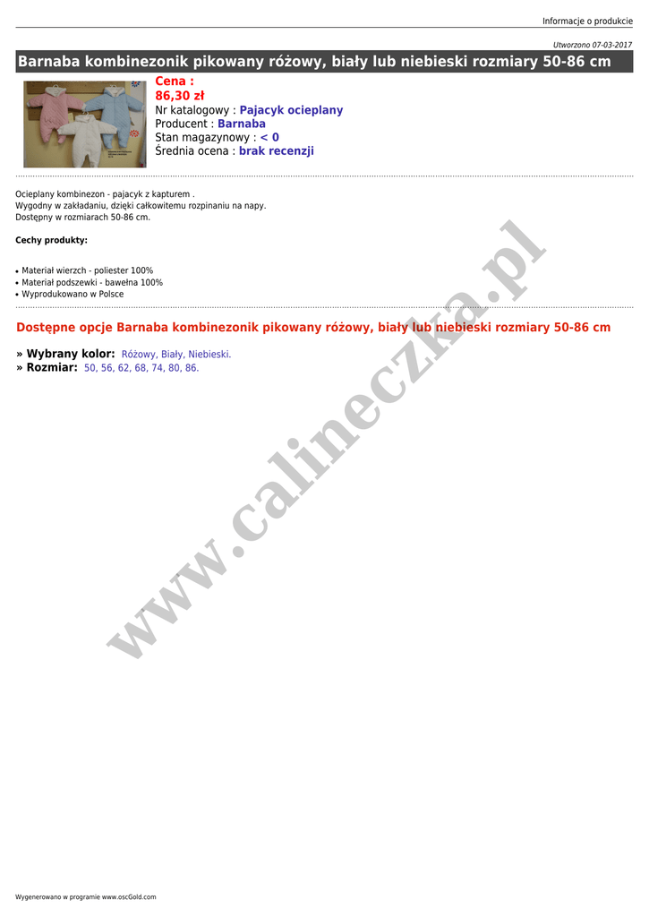 Informacje o produkcie Utworzono 07-03-2017 Barnaba kombinezonik pikowany różowy, biały lub niebieski rozmiary 50-86 cm Cena : 86,30 zł Nr katalogowy : Pajacyk ocieplany Producent : Barnaba Stan magazynowy : < 0 Średnia ocena : brak recenzji Ocieplany kombinezon - pajacyk z kapturem . Wygodny w zakładaniu, dzięki całkowitemu rozpinaniu na napy. Dostępny w rozmiarach 50-86 cm. ● ● Materiał wierzch - poliester 100% Materiał podszewki - bawełna 100% Wyprodukowano w Polsce zk a. ● pl Cechy produkty: Dostępne opcje Barnaba kombinezonik pikowany różowy, biały lub niebieski rozmiary 50-86 cm w w w .c al in ec » Wybrany kolor: Różowy, Biały, Niebieski. » Rozmiar: 50, 56, 62, 68, 74, 80, 86. Wygenerowano w programie www.oscGold.com