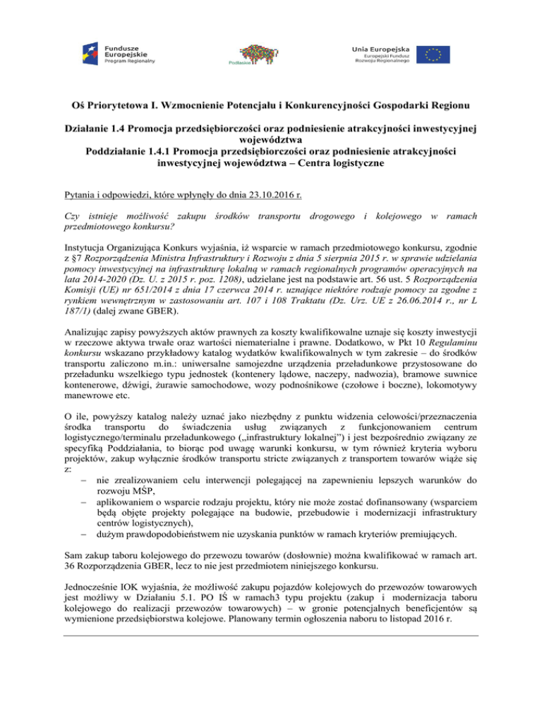 Oś Priorytetowa I. Wzmocnienie Potencjału i Konkurencyjności Gospodarki Regionu Działanie 1.4 Promocja przedsiębiorczości oraz podniesienie atrakcyjności inwestycyjnej województwa Poddziałanie 1.4.1 Promocja przedsiębiorczości oraz podniesienie atrakcyjności inwestycyjnej województwa – Centra logistyczne Pytania i odpowiedzi, które wpłynęły do dnia 23.10.2016 r. Czy istnieje możliwość zakupu środków transportu drogowego i kolejowego w ramach przedmiotowego konkursu? Instytucja Organizująca Konkurs wyjaśnia, iż wsparcie w ramach przedmiotowego konkursu, zgodnie z §7 Rozporządzenia Ministra Infrastruktury i Rozwoju z dnia 5 sierpnia 2015 r. w sprawie udzielania pomocy inwestycyjnej na infrastrukturę lokalną w ramach regionalnych programów operacyjnych na lata 2014-2020 (Dz. U. z 2015 r. poz. 1208), udzielane jest na podstawie art. 56 ust. 5 Rozporządzenia Komisji (UE) nr 651/2014 z dnia 17 czerwca 2014 r. uznające niektóre rodzaje pomocy za zgodne z rynkiem wewnętrznym w zastosowaniu art. 107 i 108 Traktatu (Dz. Urz. UE z 26.06.2014 r., nr L 187/1) (dalej zwane GBER). Analizując zapisy powyższych aktów prawnych za koszty kwalifikowalne uznaje się koszty inwestycji w rzeczowe aktywa trwałe oraz wartości niematerialne i prawne. Dodatkowo, w Pkt 10 Regulaminu konkursu wskazano przykładowy katalog wydatków kwalifikowalnych w tym zakresie – do środków transportu zaliczono m.in.: uniwersalne samojezdne urządzenia przeładunkowe przystosowane do przeładunku wszelkiego typu jednostek (kontenery lądowe, naczepy, nadwozia), bramowe suwnice kontenerowe, dźwigi, żurawie samochodowe, wozy podnośnikowe (czołowe i boczne), lokomotywy manewrowe etc. O ile, powyższy katalog należy uznać jako niezbędny z punktu widzenia celowości/przeznaczenia środka transportu do świadczenia usług związanych z funkcjonowaniem centrum logistycznego/terminalu przeładunkowego („infrastruktury lokalnej”) i jest bezpośrednio związany ze specyfiką Poddziałania, to biorąc pod uwagę warunki konkursu, w tym również kryteria wyboru projektów, zakup wyłącznie środków transportu stricte związanych z transportem towarów wiąże się z: nie zrealizowaniem celu interwencji polegającej na zapewnieniu lepszych warunków do rozwoju MŚP, aplikowaniem o wsparcie rodzaju projektu, który nie może zostać dofinansowany (wsparciem będą objęte projekty polegające na budowie, przebudowie i modernizacji infrastruktury centrów logistycznych), dużym prawdopodobieństwem nie uzyskania punktów w ramach kryteriów premiujących. Sam zakup taboru kolejowego do przewozu towarów (dosłownie) można kwalifikować w ramach art. 36 Rozporządzenia GBER, lecz to nie jest przedmiotem niniejszego konkursu. Jednocześnie IOK wyjaśnia, że możliwość zakupu pojazdów kolejowych do przewozów towarowych jest możliwy w Działaniu 5.1. PO IŚ w ramach3 typu projektu (zakup i modernizacja taboru kolejowego do realizacji przewozów towarowych) – w gronie potencjalnych beneficjentów są wymienione przedsiębiorstwa kolejowe. Planowany termin ogłoszenia naboru to listopad 2016 r. Szanowni Państwo, działając w imieniu ABC, w związku z naborem wniosków o dofinansowanie projektów ze środków Europejskiego Funduszu Rozwoju Regionalnego w ramach Osi Priorytetowej I Wzmocnienie Potencjału i Konkurencyjności Gospodarki Regionu, Działania 1.4 Promocja przedsiębiorczości oraz podniesienie atrakcyjności inwestycyjnej województwa, Poddziałania 1.4.1 Promocja przedsiębiorczości oraz podniesienie atrakcyjności inwestycyjnej województwa - Centra Logistyczne, wnosimy zapytanie o wyjaśnienie: 1. Jak należy kwalifikować w systemie intermodalnym przesyłki towarów jakimi są: a) biomasy w postaci zrębków drewna, dostarczanej węglarkami odkrytymi szerokotorowymi, - po przeładunku na terenie terminalu do kontenerów 20 ft, odkrytych typu open top, dalej wysyłana koleją w głąb kraju do odbiorców, b) gazu płynnego propan, butan, dostarczanego w cysternach szerokotorowych, - po przeładunku na terenie terminala za pomocą urządzeń i instalacji technologicznych do zbiorników magazynowych, konfekcjonowaniu do butli 11kg, transportowany w kontenerach typu BDF, samochodami ciężarowymi do odbiorców. 2. W jaki sposób firma ABC dokonywać powinna zakupów rzeczy aby były one zakupami kwalifikowanymi możliwymi do uwzględnienia w przedmiotowym projekcie? Instytucja Organizująca Konkurs, informuje, co następuje. Ad. 1 Biorąc pod uwagę, udzieloną odpowiedź na pierwsze zapytanie w niniejszym dokumencie, IOK wyjaśnia, iż o ujęciu danego środka transportu jako kosztu kwalifikowalnego w projekcie, decyduje miejsce jego wykorzystania. W ramach niniejszego konkursu, możliwy jest zakup urządzeń, które będą wykorzystywane na terenie terminalu/centrum logistycznego objętego wsparciem, w tym np. zaproponowane kontenery służące do przeładowywania na terenie terminalu. W przypadku, gdy przesyłka towarów odbywa się poza dopuszczalny obszar, wydatków tych nie można potraktować jako kwalifikowalne bowiem nie związane będą z przedmiotem konkursu i zakresem interwencji – dotyczy np. cystern, czy samochodów ciężarowych. Jednocześnie, należy pamiętać, że w ramach kryterium pn. Kwalifikowalność wydatków, Oceniający weryfikuje, czy dane wydatki są niezbędne z punktu widzenia celów realizacji projektu, racjonalne i uzasadnione. Ad. 2 Sposób dokonywania zakupu w szczególności regulują zapisy Rozdziału 6.5 Wytycznych w zakresie kwalifikowalności wydatków w ramach Europejskiego Funduszu Rozwoju Regionalnego, Europejskiego Funduszu Społecznego oraz Funduszu Spójności na lata 2014-2020, przy czym należy zauważyć, że aktualna wersja dokumentu obowiązuje od 14 października 2016 r. IOK zwraca uwagę na ich prawidłowe stosowanie, bowiem w przypadku naruszenia przez warunków i procedur postępowania o udzielenie zamówienia, Ins