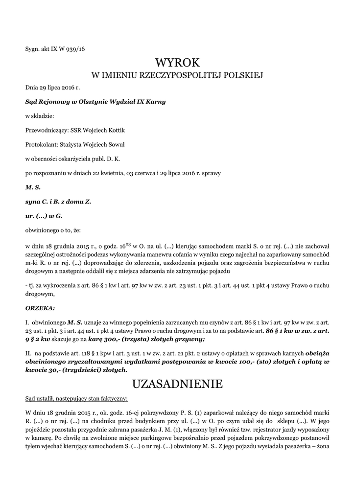 Sygn. akt IX W 939/16 WYROK W IMIENIU RZECZYPOSPOLITEJ POLSKIEJ Dnia 29 lipca 2016 r. Sąd Rejonowy w Olsztynie Wydział IX Karny w składzie: Przewodniczący: SSR Wojciech Kottik Protokolant: Stażysta Wojciech Sowul w obecności oskarżyciela publ. D. K. po rozpoznaniu w dniach 22 kwietnia, 03 czerwca i 29 lipca 2016 r. sprawy M. S. syna C. i B. z domu Z. ur. (...) w G. obwinionego o to, że: w dniu 18 grudnia 2015 r., o godz. 1603 w O. na ul. (...) kierując samochodem marki S. o nr rej. (...) nie zachował szczególnej ostrożności podczas wykonywania manewru cofania w wyniku czego najechał na zaparkowany samochód m-ki R. o nr rej. (...) doprowadzając do zderzenia, uszkodzenia pojazdu oraz zagrożenia bezpieczeństwa w ruchu drogowym a następnie oddalił się z miejsca zdarzenia nie zatrzymując pojazdu - tj. za wykroczenia z art. 86 § 1 kw i art. 97 kw w zw. z art. 23 ust. 1 pkt. 3 i art. 44 ust. 1 pkt 4 ustawy Prawo o ruchu drogowym, ORZEKA: I. obwinionego M. S. uznaje za winnego popełnienia zarzucanych mu czynów z art. 86 § 1 kw i art. 97 kw w zw. z art. 23 ust. 1 pkt. 3 i art. 44 ust. 1 pkt 4 ustawy Prawo o ruchu drogowym i za to na podstawie art. 86 § 1 kw w zw. z art. 9 § 2 kw skazuje go na karę 300,- (trzysta) złotych grzywny; II. na podstawie art. 118 § 1 kpw i art. 3 ust. 1 w zw. z art. 21 pkt. 2 ustawy o opłatach w sprawach karnych obciąża obwinionego zryczałtowanymi wydatkami postępowania w kwocie 100,- (sto) złotych i opłatą w kwocie 30,- (trzydzieści) złotych. UZASADNIENIE Sąd ustalił, następujący stan faktyczny: W dniu 18 grudnia 2015 r., ok. godz. 16-ej pokrzywdzony P. S. (1) zaparkował należący do niego samochód marki R. (...) o nr rej. (...) na chodniku przed budynkiem przy ul. (...) w O. po czym udał się do sklepu (...). W jego pojeździe pozostała przygodnie zabrana pasażerka J. M. (1), włączony był również tzw. rejestrator jazdy wyposażony w kamerę. Po chwilę na zwolnione miejsce parkingowe bezpośrednio przed pojazdem pokrzywdzonego postanowił tyłem wjechać kierujący samochodem S. (...) o nr rej. (...) obwiniony M. S.. Z jego pojazdu wysiadała pasażerka – żona obwinionego, która pomagała mu wykonać ten manewr. Jednak mimo tej pomocy obwiniony nie zachował należytej ostrożności wykonując ten manewr i tyłem swojego pojazdu uderzył w przód samochodu R.. Po chwili ruszył do przodu, odjechał z miejsca zdarzenia i zaparkował swój pojazd kilkadziesiąt metrów dalej. Zachowanie obwinionego było na tyle zaskakujące dla pasażerki samochodu R., że ta nawet nie zdążyła zareagować. Dopiero po chwili kiedy do pojazdu powrócił pokrzywdzony P. S. poinformowała go o tym co się stało. Ten obejrzał swój pojazd i stwierdził, że ma on ślady zarysowania na listwie ozdobnej osłony chłodnicy. Kiedy wrócił do domu do O. obejrzał nagranie z kamery rejestratora stwierdzając, że ma ono kilkudziesięciosekundową przerwę i nie zawiera zapisu samego momentu uderzenia w przód jego pojazdu, jednak następnego dnia zgłosił się do KPP O., gdzie zgłosił to zdarzenie i przedstawił swój pojazd do oględzin. (dowody: notatka urzędowa – k. 7; protokół oględzin – k. 11, 20; płyta z nagraniem – k.12, protokół odtworzenia – k. 13; wydruk zdjęć z oględzin –k .21-22; informacja z bazy (...) k. 37; pismo pokrzywdzonego z wydrukami zdjęć – k. 63 i płytą(...)ze zdjęciami – k. 62-80, pismo KPP B. –k. 81; zdjęcia z oględzin pojazdu S. k. 83; zeznania świadków: J. M. – k. 46v, P. S. – k. 46v-47) Obwiniony nie przyznał się do popełnienia zarzucanego mu czynu i wyjaśnił, że nie zaprzecza, że w dniu zdarzenia w miejscu wskazanym we wniosku wykonywał manewr cofania, jednak zaprzeczył aby uderzył tyłem swojego pojazdu w przód samochodu pokrzywdzonego. Tego dnia jego żona miała wizytę u okulisty w przychodni na ul. (...) w O.. Wykonał dwukrotnie próbę zaparkowania tyłem w wolne miejsce między dwoma pojazdami, ale ostatecznie uznał, że jest tam zbyt mało miejsca więc znalazł miejsce 2-3 samochody dalej i tam zaparkował swój samochód i poszedł z żoną do przychodni. Podkreślił, że nie ma żadnych śladów z tyłu swojego pojazdu, które potwierdzałyby kontakt z innym pojazdem. (wyjaśnienia – k. 46 – 46v) Sąd zważył, co następuje: Wyjaśnienia obwinionego nie zasługują na wiarę i w ocenie Sądu stanowią jedynie wyraz przyjętej przezeń linii obrony. W niniejszej sprawie wprawdzie wydawałoby, się, że idealny dowód – nagranie z rejestratora jazdy zamontowanego w samochodzie pokrzywdzonego okazało się w praktyce nie do końca przydatne, ale nie oznacza, że nie można przyjąć aby wszystkie przeprowadzone dowody nie pozwoliły na ustalenie stanu faktycznego i stwierdzenia niewiarygodności wyjaśnień obwinionego i jego żony. Ze wspomnianego nagrania wynika, że o godzinie 1601’51’’ w wolne miejsce przed samochód pokrzywdzonego wjeżdża przodem – nieco ukosem, samochód S. kierowany przez obwinionego i następnie rozpoczyna on manewr cofania. Po chwili zatrzymuje się, podjeżdża nieco do przodu i ponawia manewr cofania. Nagranie to urywa się o godzinie 1602’07’’ i kiedy jest wznowione o godzinie 1604’21’’ widać na nim odjeżdżający z miejsca zdarzenia samochód S. oraz odchodzącą chodnikiem wzdłuż zaparkowanych pojazdów w kierunku ul. (...) kobietę, która ogląda się w stronę samochodu R. i przygląda się mu przez dłuższą chwilę. Samochód obwinionego po chwili parkuje kilkanaście metrów dalej nie będąc widoczny dla pasażerki samochodu R. i jego kierowcy, który w tym momencie powraca do pojazdu i jest informowany przez J. M. o tym co się stało. Bardzo prawdopodobną przyczyną przerwy w nagraniu z tego rejestratora jest spadek napięcia lub wręcz chwilowy zanik zasilania tego urządzenia będący efektem wstrząsu wywołanego uderzeniem w pojazd R.. Z nagraniem tym ściśle ł