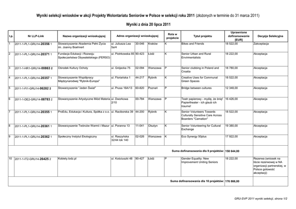 Wyniki selekcji wniosków w akcji Projekty Wolontariatu Seniorów w Polsce w selekcji roku 2011 (złożonych w terminie do 31 marca 2011) Wyniki z dnia 20 lipca 2011 l.p. Nr LLP-Link Nazwa organizacji wnioskującej 1 2011-1-PL1-GRU14-20356 1 Stowarzyszenie Akademia Pełni Życia im. Joanny Boehnert 2 2011-1-PL1-GRU14-20371 1 3 Adres organizacji wnioskującej Rola w projekcie Tytuł projektu Uprawnione dofinansowanie [EUR] 18 522,00 Zakceptacja Decyzja Selekcyjna Kraków K Bikes and Friends Fundacja Edukacji i Rozwoju ul. Piotrkowska 85 90-423 Społeczeństwa Obywatelskiego (FERSO) Łódź K Senior Urban and Rural Envirmentalists 18 222,00 Akceptacja 2011-1-HR1-GRU14-00863 2 Ośrodek Kultury Ochoty ul. Grójecka 75 02-094 Warszawa P Senior clubbing in Poland and Croatia 18 780,00 Akceptacja 4 2011-1-PL1-GRU14-20357 1 Stowarzyszenie Współpracy Międzynarodwej "Rybnik-Europa" ul. Floriańska 1 44-217 Rybnik K Creative Uses for Communal Green Spaces 18 522,00 Akceptacja 5 2011-1-FI1-GRU14-06282 2 Stowarzyszenie "Jeden Świat" ul. Prusa 16A/13 60-820 Poznań P Bridge between cultures 12 348,00 Akceptacja 6 2011-1-DE2-GRU14-08783 2 Stowarzyszenie Artystyczne Miód Materia ul. Dworkowa 2/10 00-784 Warszawa P Teatr papierowy - myślę, że śnię! 16 426,00 Papiertheater - ich glaub ich traume! Akceptacja 7 2011-1-PL1-GRU14-20355 1 ProEdu, Edukacja i Kultura, Spółka z o.o. ul. Raciborska 39 44-200 Rybnik K Senior Volunteers Towards Culturally Sensitive Care Across Boarders "Carnation" 18 522,00 Akceptacja 8 2011-1-PL1-GRU14-20361 1 Stowarzyszenie Twórców Warmii i Mazur ul. Poranna 13 11-041 Olsztyn K Senior Volunteering for Cultural Exchange 19 380,00 Akceptacja 9 2011-1-PL1-GRU14-20362 1 Społeczny Instytut Ekologiczny 02-026 Warszawa K Eco Synergy 50plus 17 922,00 Akceptacja ul. Juliusza Lea 5a/4 ul. Raszyńska 32/44 lok 140 30-046 Suma dofinansowania dla 9 projektów: 158 644,00 10 2011-1-IT2-GRU14-26425 2 Kobiety.lodz.pl ul. Kościuszki 48 90-427 Łódź P Gender Equality: New Improvement Uniting Seniors 18 222,00 Rezerwa (wniosek na liście rezerwowej w NA organizacji partnerskiej, w Polsce gotowość akceptacji) Suma dofinansowania dla 10 projektów: 176 866,00 GRU-SVP 2011 wyniki selekcji, strona 1/2 Wnioski odrzucone 11 2011-1-PL1-GRU14-20367 1 Odrzucony z powodu niskiej jakości (projekt jako całość) 12 2011-1-NL1-GRU14-05625 2 Odrzucony z powodu niskiej jakości (projekt jako całość) 13 2011-1-PL1-GRU14-20363 1 Odrzucony z powodu niskiej jakości (projekt jako całość) 14 2011-1-PL1-GRU14-20370 1 Odrzucony z powodu niskiej jakości (projekt jako całość) 15 2011-1-PL1-GRU14-20373 1 Odrzucony z powodu niskiej jakości (projekt jako całość) 16 2011-1-PL1-GRU14-20359 1 Odrzucony z powodu niskiej jakości (projekt jako całość) 17 2011-1-PL1-GRU14-20358 1 Odrzucony z powodów formalnych 18 2011-1-PL1-GRU14-20368 1 Odrzucony z powodów formalnych 19 2011-1-PL1-GRU14-20366 1 Odrzucony z powodów formalnych 20 2011-1-PL1-GRU14-20344 1 Odrzucony z powodów formalnych 21 2011-1-PL1-GRU14-20365 1 Odrzucony z powodów formalnych 22 2011-1-PL1-GRU14-20369 1 Odrzucony z powodów formalnych 23 2011-1-DE2-GRU14-08784 2 Odrzucony z powodów formalnych GRU-SVP 2011 wyniki selekcji, strona 2/2