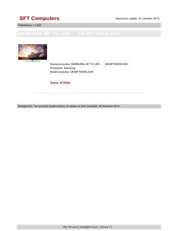SFT Computers Utworzono: piątek, 21 czerwiec 2013 Telewizory > LED SAMSUNG 46'' TV LED UE46F7000SLXXH Nazwa produktu: SAMSUNG 46'' TV LED UE46F7000SLXXH Producent: Samsung Model produktu: UE46F7000SLXXH Cena: 6143zł Dostępność: Ten produkt został dodany do sklepu w dniu czwartek, 25 kwiecień 2013 http://sft.net.pl | [email protected] | | Strona 1/1