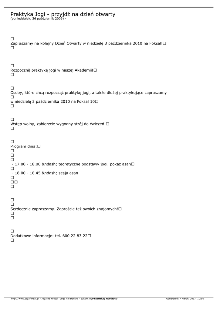 Praktyka Jogi - przyjdź na dzień otwarty (poniedziałek, 26 październik 2009) - Zapraszamy na kolejny Dzień Otwarty w niedzielę 3 października 2010 na Foksal! Rozpocznij praktykę jogi w naszej Akademii! Osoby, które chcą rozpocząć praktykę jogi, a także dłużej praktykujące zapraszamy w niedzielę 3 października 2010 na Foksal 10 Wstęp wolny, zabierzcie wygodny strój do ćwiczeń! Program dnia: - 17.00 - 18.00 – teoretyczne podstawy jogi, pokaz asan - 18.00 - 18.45 – sesja asan Serdecznie zapraszamy. Zaproście też swoich znajomych! Dodatkowe informacje: tel. 600 22 83 22 http://www.jogafoksal.pl - Joga na Foksal i Joga na Brackiej - szkoły jogiPowered w centrum by Mambo Warszawy Generated: 7 March, 2017, 10:50