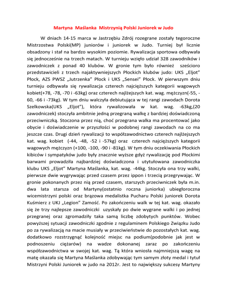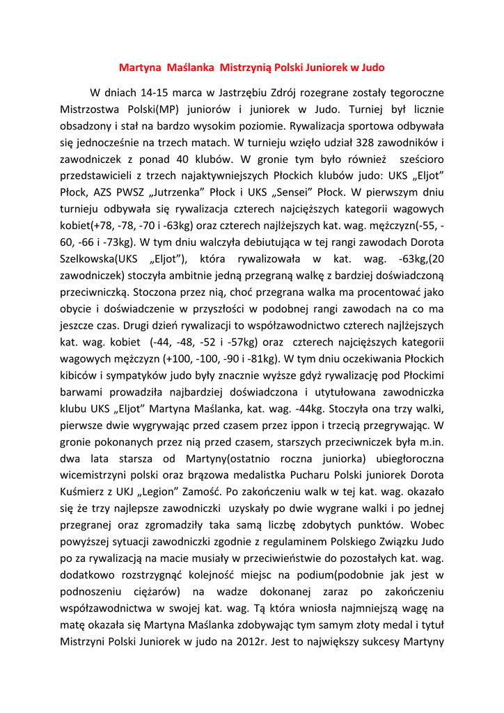 Martyna Maślanka Mistrzynią Polski Juniorek w Judo W dniach 14-15 marca w Jastrzębiu Zdrój rozegrane zostały tegoroczne Mistrzostwa Polski(MP) juniorów i juniorek w Judo. Turniej był licznie obsadzony i stał na bardzo wysokim poziomie. Rywalizacja sportowa odbywała się jednocześnie na trzech matach. W turnieju wzięło udział 328 zawodników i zawodniczek z ponad 40 klubów. W gronie tym było również sześcioro przedstawicieli z trzech najaktywniejszych Płockich klubów judo: UKS „Eljot” Płock, AZS PWSZ „Jutrzenka” Płock i UKS „Sensei” Płock. W pierwszym dniu turnieju odbywała się rywalizacja czterech najcięższych kategorii wagowych kobiet(+78, -78, -70 i -63kg) oraz czterech najlżejszych kat. wag. mężczyzn(-55, 60, -66 i -73kg). W tym dniu walczyła debiutująca w tej rangi zawodach Dorota Szelkowska(UKS „Eljot”), która rywalizowała w kat. wag. -63kg,(20 zawodniczek) stoczyła ambitnie jedną przegraną walkę z bardziej doświadczoną przeciwniczką. Stoczona przez nią, choć przegrana walka ma procentować jako obycie i doświadczenie w przyszłości w podobnej rangi zawodach na co ma jeszcze czas. Drugi dzień rywalizacji to współzawodnictwo czterech najlżejszych kat. wag. kobiet (-44, -48, -52 i -57kg) oraz czterech najcięższych kategorii wagowych mężczyzn (+100, -100, -90 i -81kg). W tym dniu oczekiwania Płockich kibiców i sympatyków judo były znacznie wyższe gdyż rywalizację pod Płockimi barwami prowadziła najbardziej doświadczona i utytułowana zawodniczka klubu UKS „Eljot” Martyna Maślanka, kat. wag. -44kg. Stoczyła ona trzy walki, pierwsze dwie wygrywając przed czasem przez ippon i trzecią przegrywając. W gronie pokonanych przez nią przed czasem, starszych przeciwniczek była m.in. dwa lata starsza od Martyny(ostatnio roczna juniorka) ubiegłoroczna wicemistrzyni polski oraz brązowa medalistka Pucharu Polski juniorek Dorota Kuśmierz z UKJ „Legion” Zamość. Po zakończeniu walk w tej kat. wag. okazało się że trzy najlepsze zawodniczki uzyskały po dwie wygrane walki i po jednej przegranej oraz zgromadziły taka samą liczbę zdobytych punktów. Wobec powyższej sytuacji zawodniczki zgodnie z regulaminem Polskiego Związku Judo po za rywalizacją na macie musiały w przeciwieństwie do pozostałych kat. wag. dodatkowo rozstrzygnąć kolejność miejsc na podium(podobnie jak jest w podnoszeniu ciężarów) na wadze dokonanej zaraz po zakończeniu współzawodnictwa w swojej kat. wag. Tą która wniosła najmniejszą wagę na matę okazała się Martyna Maślanka zdobywając tym samym złoty medal i tytuł Mistrzyni Polski Juniorek w judo na 2012r. Jest to największy sukcesy Martyny w judo. Wartym podkreślenia są fakty że do zdobytego miesiąc temu złotego medalu w Pucharze Polski Juniorek w Judo dorzuciła złoty medal i tytuł mistrzowski w krajowym championacie(MP) uzyskując już w tym roku tzw. dublet (PP+MP), nie pozostawiając chyba już nikomu wątpliwości że zdobyty przed miesiącem medal w PP nie były przypadkiem. W aspekcie historycznym 40 letniego Płockiego Judo Martyna jest pierwszą i jak na razie jedyna zawodniczką reprezentującą Płocki klub której udało się zdobyć złoty medal i tytuł Mistrzyni Polski Juniorek w Judo a łącznie wśród kobiet i mężczyzn reprezentujących Płocki klub dopiero drugim w tej bogatej historii po Jacku Marciniaku, który dokonał tego aż 22 lata temu w roku 1990 w Koszalinie. Po turnieju MP, w klasyfikacji medalowej zawodniczek, których kluby zdobyły punkty w tym turnieju, UKS „Eljot” Płock zajął bardzo wysokie 7 miejsce z pośród grona 22 klubów. Obecnie Martyna w rankingu zawodniczek kategorii wiekowej juniorek w swojej kategorii wagowej zajmuje pierwsze miejsce w Polsce.