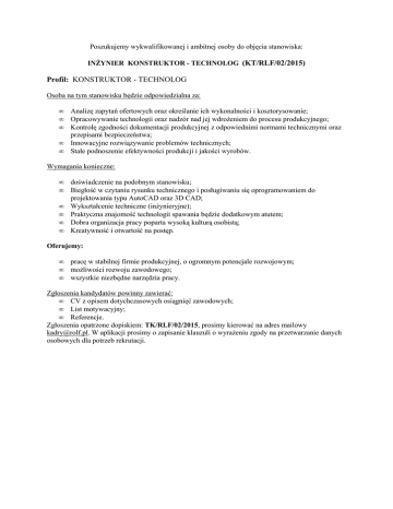 Poszukujemy wykwalifikowanej i ambitnej osoby do objęcia stanowiska: INśYNIER KONSTRUKTOR - TECHNOLOG (KT/RLF/02/2015) Profil: KONSTRUKTOR - TECHNOLOG Osoba na tym stanowisku będzie odpowiedzialna za: • • • • • Analizę zapytań ofertowych oraz określanie ich wykonalności i kosztorysowanie; Opracowywanie technologii oraz nadzór nad jej wdroŜeniem do procesu produkcyjnego; Kontrolę zgodności dokumentacji produkcyjnej z odpowiednimi normami technicznymi oraz przepisami bezpieczeństwa; Innowacyjne rozwiązywanie problemów technicznych; Stałe podnoszenie efektywności produkcji i jakości wyrobów. Wymagania konieczne: • • • • • • doświadczenie na podobnym stanowisku; Biegłość w czytaniu rysunku technicznego i posługiwaniu się oprogramowaniem do projektowania typu AutoCAD oraz 3D CAD; Wykształcenie techniczne (inŜynieryjne); Praktyczna znajomość technologii spawania będzie dodatkowym atutem; Dobra organizacja pracy poparta wysoką kulturą osobistą; Kreatywność i otwartość na postęp. Oferujemy: • • • pracę w stabilnej firmie produkcyjnej, o ogromnym potencjale rozwojowym; moŜliwości rozwoju zawodowego; wszystkie niezbędne narzędzia pracy. Zgłoszenia kandydatów powinny zawierać: • CV z opisem dotychczasowych osiągnięć zawodowych; • List motywacyjny; • Referencje. Zgłoszenia opatrzone dopiskiem: TK/RLF/02/2015, prosimy kierować na adres mailowy [email protected]. W aplikacji prosimy o zapisanie klauzuli o wyraŜeniu zgody na przetwarzanie danych osobowych dla potrzeb rekrutacji.