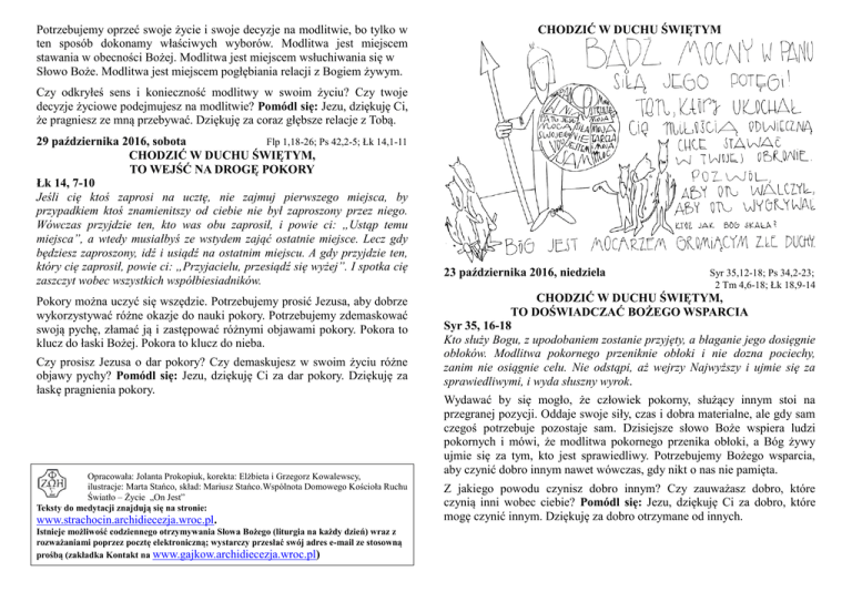 Potrzebujemy oprzeć swoje życie i swoje decyzje na modlitwie, bo tylko w ten sposób dokonamy właściwych wyborów. Modlitwa jest miejscem stawania w obecności Bożej. Modlitwa jest miejscem wsłuchiwania się w Słowo Boże. Modlitwa jest miejscem pogłębiania relacji z Bogiem żywym. CHODZIĆ W DUCHU ŚWIĘTYM Czy odkryłeś sens i konieczność modlitwy w swoim życiu? Czy twoje decyzje życiowe podejmujesz na modlitwie? Pomódl się: Jezu, dziękuję Ci, że pragniesz ze mną przebywać. Dziękuję za coraz głębsze relacje z Tobą. 29 października 2016, sobota Flp 1,18-26; Ps 42,2-5; Łk 14,1-11 CHODZIĆ W DUCHU ŚWIĘTYM, TO WEJŚĆ NA DROGĘ POKORY Łk 14, 7-10 Jeśli cię ktoś zaprosi na ucztę, nie zajmuj pierwszego miejsca, by przypadkiem ktoś znamienitszy od ciebie nie był zaproszony przez niego. Wówczas przyjdzie ten, kto was obu zaprosił, i powie ci: „Ustąp temu miejsca”, a wtedy musiałbyś ze wstydem zająć ostatnie miejsce. Lecz gdy będziesz zaproszony, idź i usiądź na ostatnim miejscu. A gdy przyjdzie ten, który cię zaprosił, powie ci: „Przyjacielu, przesiądź się wyżej”. I spotka cię zaszczyt wobec wszystkich współbiesiadników. Pokory można uczyć się wszędzie. Potrzebujemy prosić Jezusa, aby dobrze wykorzystywać różne okazje do nauki pokory. Potrzebujemy zdemaskować swoją pychę, złamać ją i zastępować różnymi objawami pokory. Pokora to klucz do łaski Bożej. Pokora to klucz do nieba. Czy prosisz Jezusa o dar pokory? Czy demaskujesz w swoim życiu różne objawy pychy? Pomódl się: Jezu, dziękuję Ci za dar pokory. Dziękuję za łaskę pragnienia pokory. Opracowała: Jolanta Prokopiuk, korekta: Elżbieta i Grzegorz Kowalewscy, ilustracje: Marta Stańco, skład: Mariusz Stańco.Wspólnota Domowego Kościoła Ruchu Światło – Życie „On Jest” Teksty do medytacji znajdują się na stronie: www.strachocin.archidiecezja.wroc.pl. Istnieje możliwość codziennego otrzymywania Słowa Bożego (liturgia na każdy dzień) wraz z rozważaniami poprzez pocztę elektroniczną; wystarczy przesłać swój adres e-mail ze stosowną prośbą (zakładka Kontakt na www.gajkow.archidiecezja.wroc.pl) 23 października 2016, niedziela Syr 35,12-18; Ps 34,2-23; 2 Tm 4,6-18; Łk 18,9-14 CHODZIĆ W DUCHU ŚWIĘTYM, TO DOŚWIADCZAĆ BOŻEGO WSPARCIA Syr 35, 16-18 Kto służy Bogu, z upodobaniem zostanie przyjęty, a błaganie jego dosięgnie obłoków. Modlitwa pokornego przeniknie obłoki i nie dozna pociechy, zanim nie osiągnie celu. Nie odstąpi, aż wejrzy Najwyższy i ujmie się za sprawiedliwymi, i wyda słuszny wyrok. Wydawać by się mogło, że człowiek pokorny, służący innym stoi na przegranej pozycji. Oddaje swoje siły, czas i dobra materialne, ale gdy sam czegoś potrzebuje pozostaje sam. Dzisiejsze słowo Boże wspiera ludzi pokornych i mówi, że modlitwa pokornego przenika obłoki, a Bóg żywy ujmie się za tym, kto jest sprawiedliwy. Potrzebujemy Bożego wsparcia, aby czynić dobro innym nawet wówczas, gdy nikt o nas nie pamięta. Z jakiego powodu czynisz dobro innym? Czy zauważasz dobro, które czynią inni wobec ciebie? Pomódl się: Jezu, dziękuję Ci za dobro, które mogę czynić innym. Dziękuję za dobro otrzymane od innych. 24 października 2016, poniedziałek Ef 4,32-5,8; Ps 1,1-6; Łk 13,10-17 CHODZIĆ W DUCHU ŚWIĘTYM, TO ODDAĆ BOGU SWOJE NIEMOCE Łk 13, 10-13 Jezus nauczał w szabat w jednej z synagog. A była tam kobieta, która od osiemnastu lat miała ducha niemocy: była pochylona i w żaden sposób nie mogła się wyprostować. Gdy Jezus ją zobaczył, przywołał ją i rzekł do niej: „Niewiasto, jesteś wolna od swej niemocy”. Położył na nią ręce, a natychmiast wyprostowała się i chwaliła Boga. Duch niemocy może ogarniać różne dziedziny naszego życia, nie tylko ciało jak u owej biblijnej kobiety. Duch niemocy może ogarniać naszą wolę, pamięć, rozum, serce. Potrzebujemy ujrzeć swoje niemoce i potrzebujemy wołać do Jezusa, aby je uzdrowił. Duch niemocy może komplikować nasze życie, osłabiać zawiązane relacje, niszczyć przyjaźnie. Z jakimi niemocami zmagasz się w swoim życiu? Co z nimi robisz? Pomódl się: Jezu, dziękuję Ci, że mogę ujrzeć i rozeznać swoje niemoce. Dziękuję, że pragniesz mnie z nich uzdrowić. 25 października 2016, wtorek Ef 5,21-33; Ps 128,1-5; Łk 13,18-21 CHODZIĆ W DUCHU ŚWIĘTYM, TO ODDAWAĆ JEZUSOWI MAŁE SPRAWY Łk 13, 18-19 Jezus mówił: „Do czego podobne jest królestwo Boże i z czym mam je porównać? Podobne jest do ziarnka gorczycy, które ktoś wziął i posiał w swoim ogrodzie. Wyrosło i stało się wielkim drzewem, tak że ptaki podniebne zagnieździły się na jego gałęziach”. Ceńmy to, co małe w naszym życiu, ponieważ ono składa się z małych rzeczy, przyzwyczajeń, drobnych gestów. Wielkie dzieła rodzą się z wierności małym sprawom. Małe dary i zdolności oddane Jezusowi służą wielkim dziełom. Czy oddajesz Jezusowi proste czynności, małe zdolności? Czy dziękujesz za małe sprawy w swoim życiu? Pomódl się: Jezu, dziękuję Ci za małe sprawy w moim życiu. Dziękuję za wierność małemu dobru. 26 października 2016, środa Ef 6,1-9; Ps 145,10-14; Łk 13,22-30 CHODZIĆ W DUCHU ŚWIĘTYM, TO ROZPOZNAĆ CIASNE DRZWI W SWOIM ŻYCIU Łk 13, 24-25 On rzekł do nich: Usiłujcie wejść przez ciasne drzwi; gdyż wielu, powiadam wam, będzie chciało wejść, a nie zdołają. Skoro Pan domu wstanie i drzwi zamknie, wówczas, stojąc na dworze, zaczniecie kołatać do drzwi i wołać: „Panie, otwórz nam!”, lecz On wam odpowie: „Nie wiem, skąd jesteście”. Ewangelia jest wymagająca – Jezus mówi o zaparciu się siebie. Ciasne drzwi to wymagania stawiane w naszym życiu. To niewygody i trudy. Człowiek żyjący w dostatku często rezygnuje z wymagań i trudów, bo jest to łatwiejsze. Życie bez trudów to życie w złudzeniach, które prędzej czy później są demaskowa