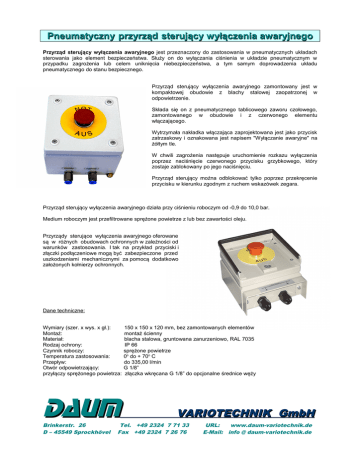 Pneumatyczny przyrząd sterujący wyłączenia awaryjnego Przyrząd sterujący wyłączenia awaryjnego jest przeznaczony do zastosowania w pneumatycznych układach sterowania jako element bezpieczeństwa. Służy on do wyłączania ciśnienia w układzie pneumatycznym w przypadku zagrożenia lub celem uniknięcia niebezpieczeństwa, a tym samym doprowadzenia układu pneumatycznego do stanu bezpiecznego. Przyrząd sterujący wyłączenia awaryjnego zamontowany jest w kompaktowej obudowie z blachy stalowej zaopatrzonej w odpowietrzenie. Składa się on z pneumatycznego tablicowego zaworu czołowego, zamontowanego w obudowie i z czerwonego elementu włączającego. Wytrzymała nakładka włączająca zaprojektowana jest jako przycisk zatrzaskowy i oznakowana jest napisem "Wyłączanie awaryjne" na żółtym tle. W chwili zagrożenia następuje uruchomienie rozkazu wyłączenia poprzez naciśnięcie czerwonego przycisku grzybkowego, który zostaje zablokowany po jego naciśnięciu. Przyrząd sterujący można odblokować tylko poprzez przekręcenie przycisku w kierunku zgodnym z ruchem wskazówek zegara. Przyrząd sterujący wyłączenia awaryjnego działa przy ciśnieniu roboczym od -0,9 do 10,0 bar. Medium roboczym jest przefiltrowane sprężone powietrze z lub bez zawartości oleju. Przyrządy sterujące wyłączenia awaryjnego oferowane są w różnych obudowach ochronnych w zależności od warunków zastosowania. I tak na przykład przyciski i złączki podłączeniowe mogą być zabezpieczone przed uszkodzeniami mechanicznymi za pomocą dodatkowo założonych kołnierzy ochronnych. Dane techniczne: Wymiary (szer. x wys. x gł.): Montaż: Materiał: Rodzaj ochrony: Czynnik roboczy: Temperatura zastosowania: Przepływ: Otwór odpowietrzający: przyłączy sprężonego powietrza: DAUM 150 x 150 x 120 mm, bez zamontowanych elementów montaż ścienny blacha stalowa, gruntowana zanurzeniowo, RAL 7035 IP 66 sprężone powietrze 0o do + 70o C do 335,00 l/min G 1/8” złączka wkręcana G 1/8” do opcjonalne średnice węży VARIOTECHNIK GmbH Brinkerstr. 26 Tel. +49 2324 7 71 33URL: www.daum-variotechnik.de D – 45549 Sprockhövel Fax +49 2324 7 26 76 E-Mail: info @ daum-variotechnik.de